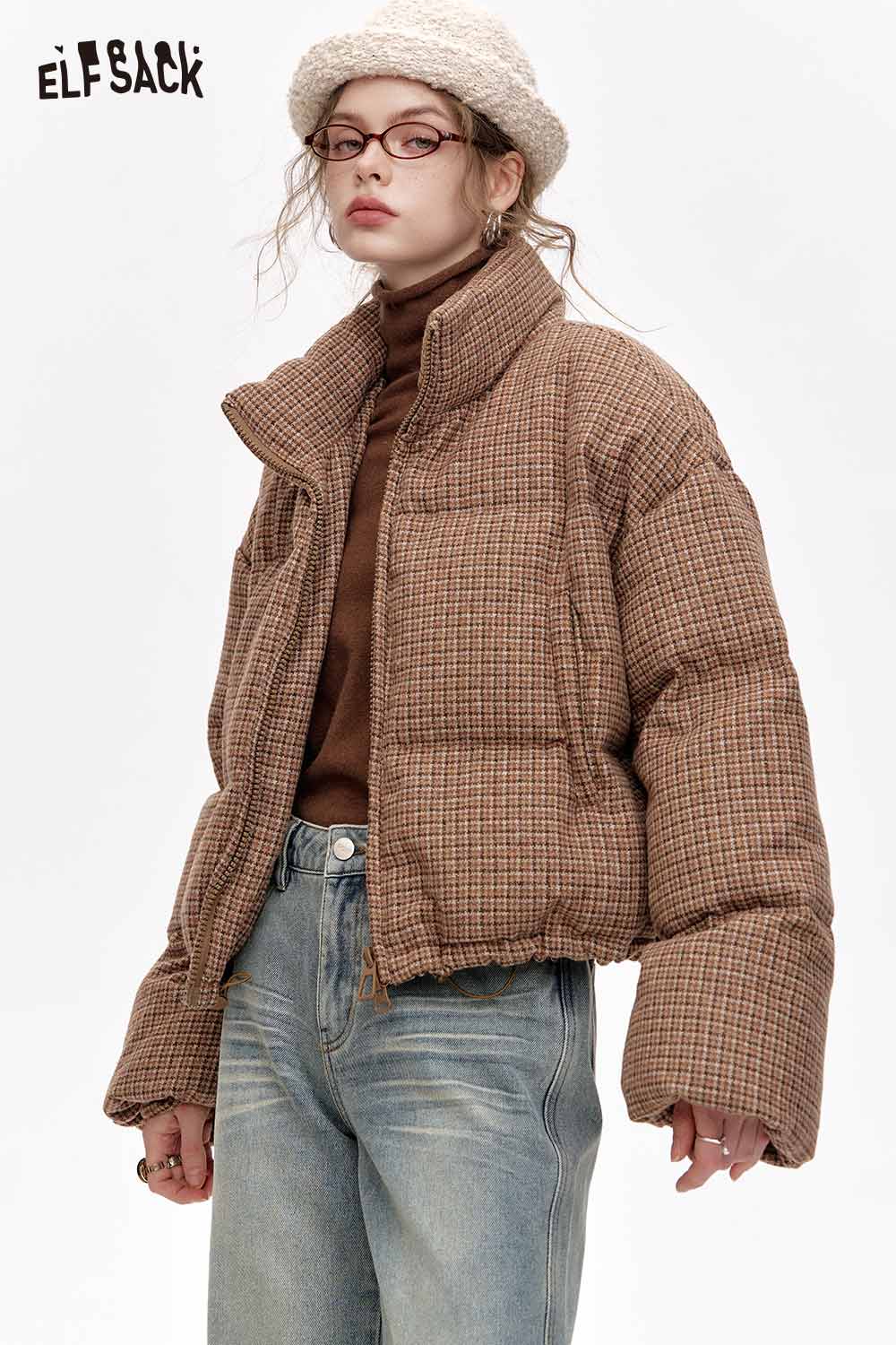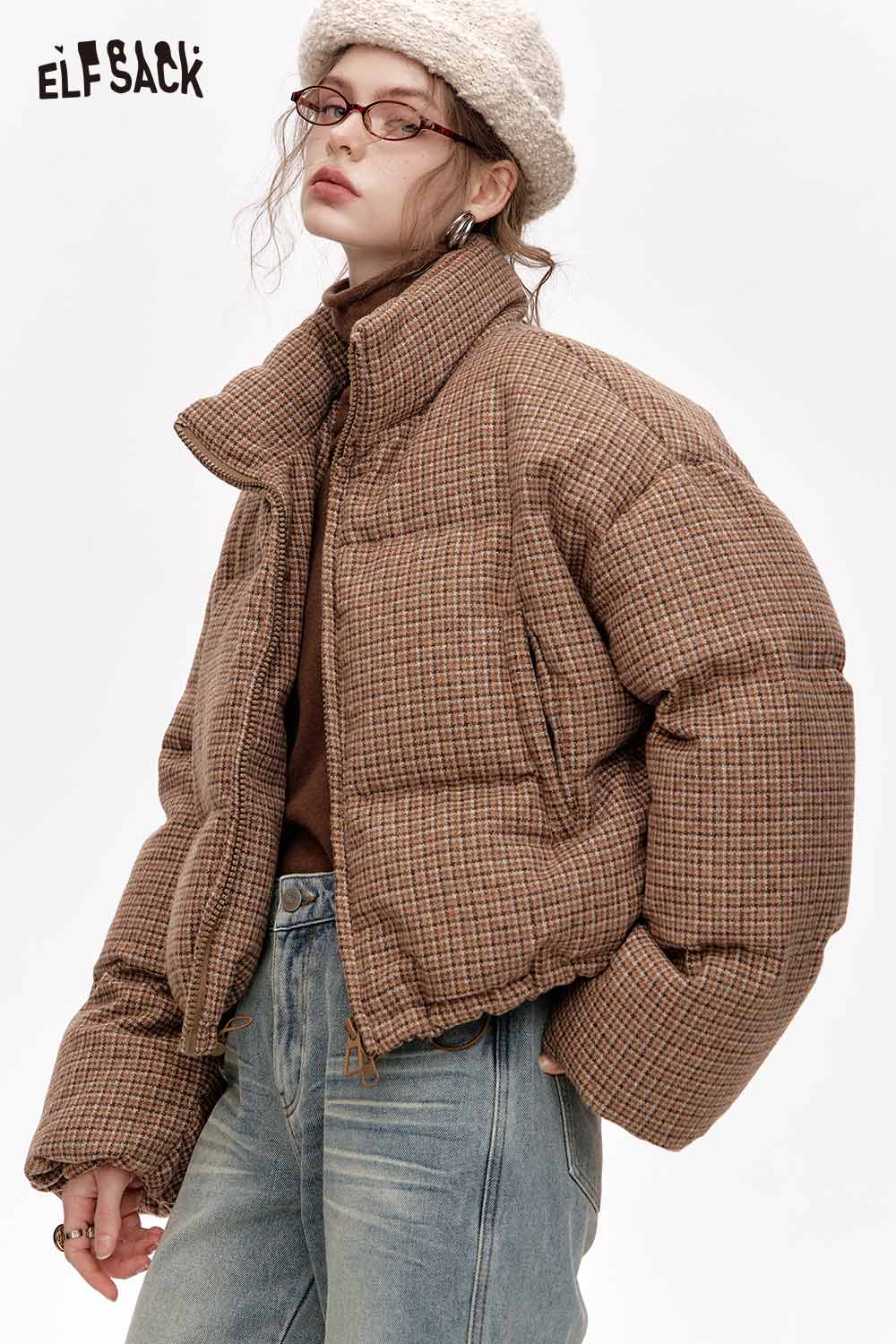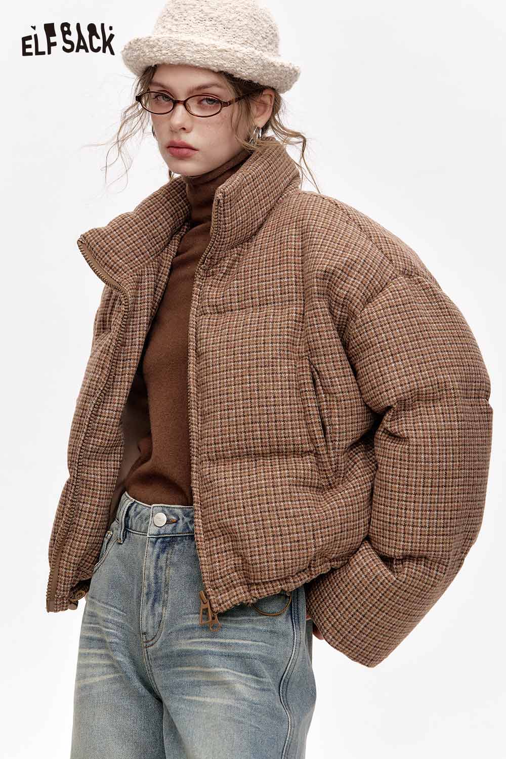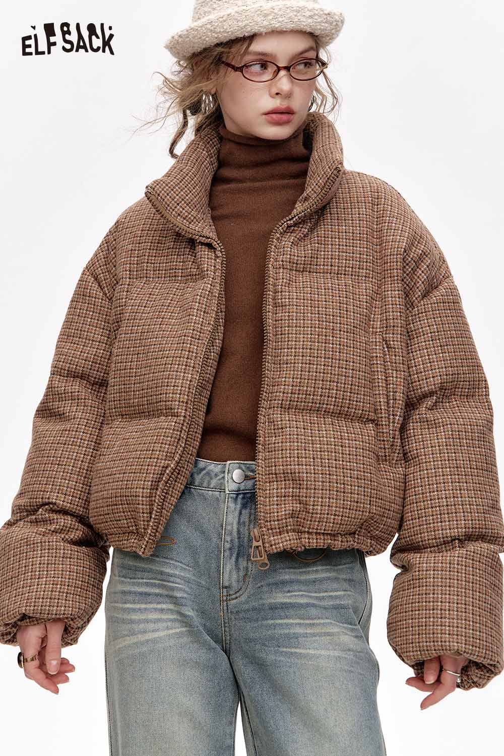 Soft Vintage Plaid Short Stand Collar Puffer Down Jacket