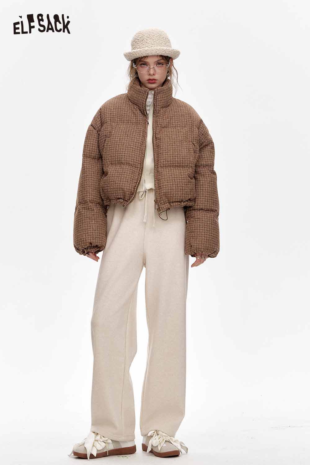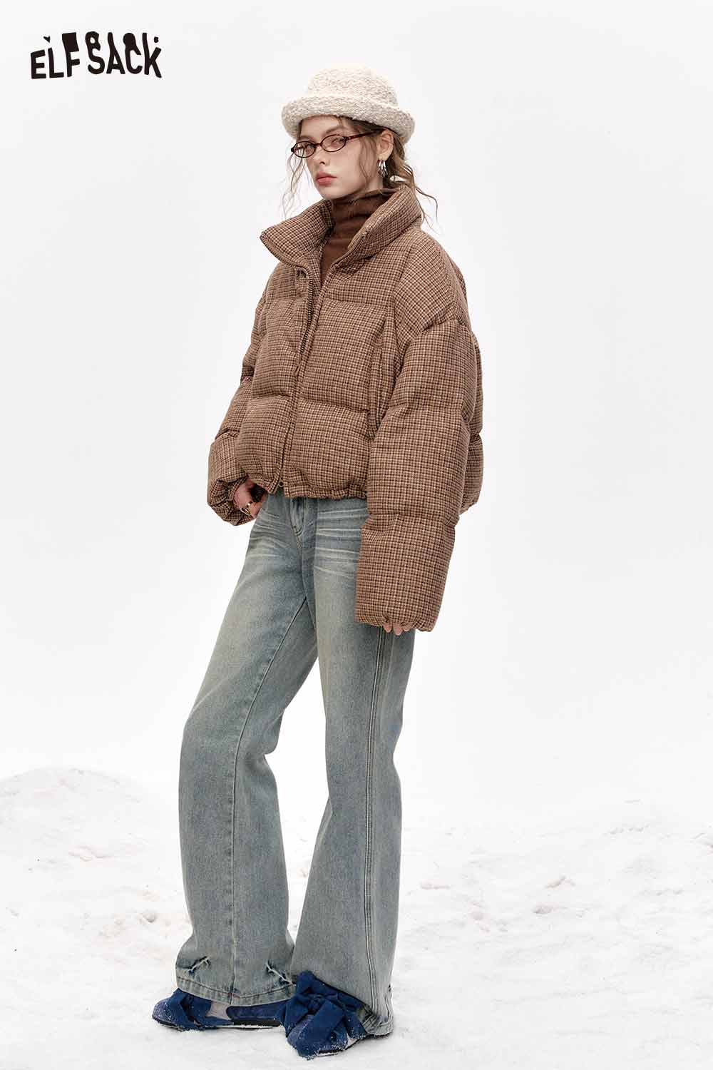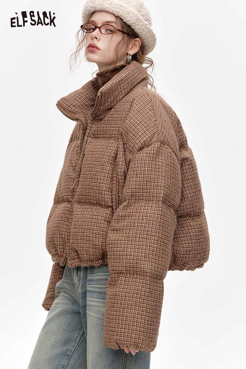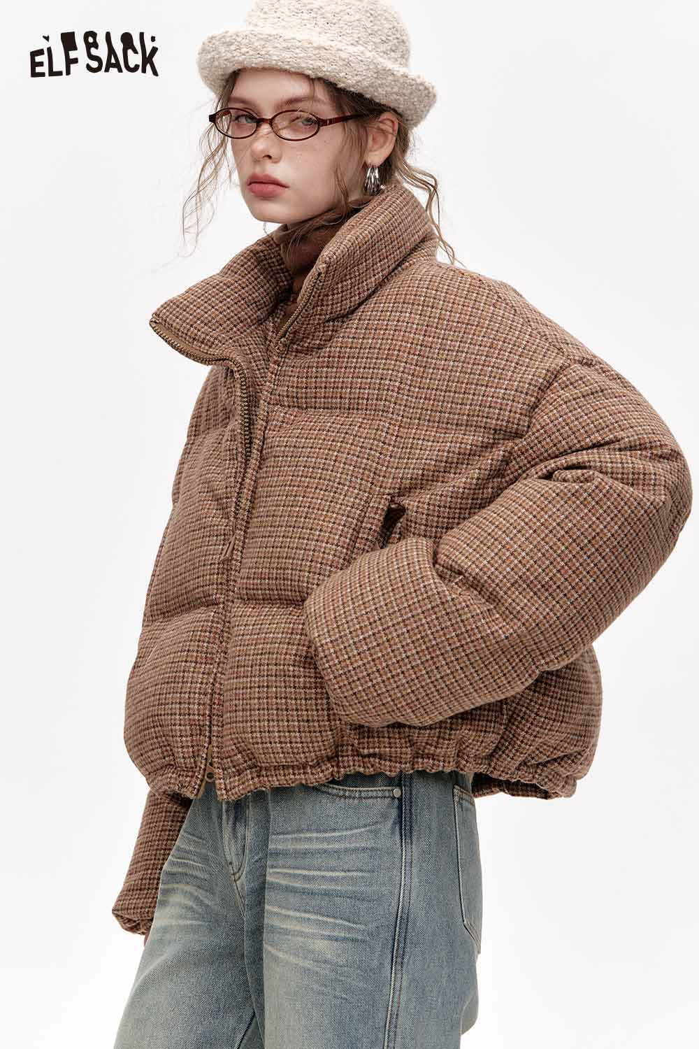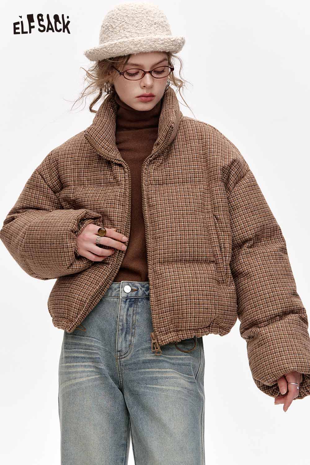 Soft Vintage Plaid Short Stand Collar Puffer Down Jacket