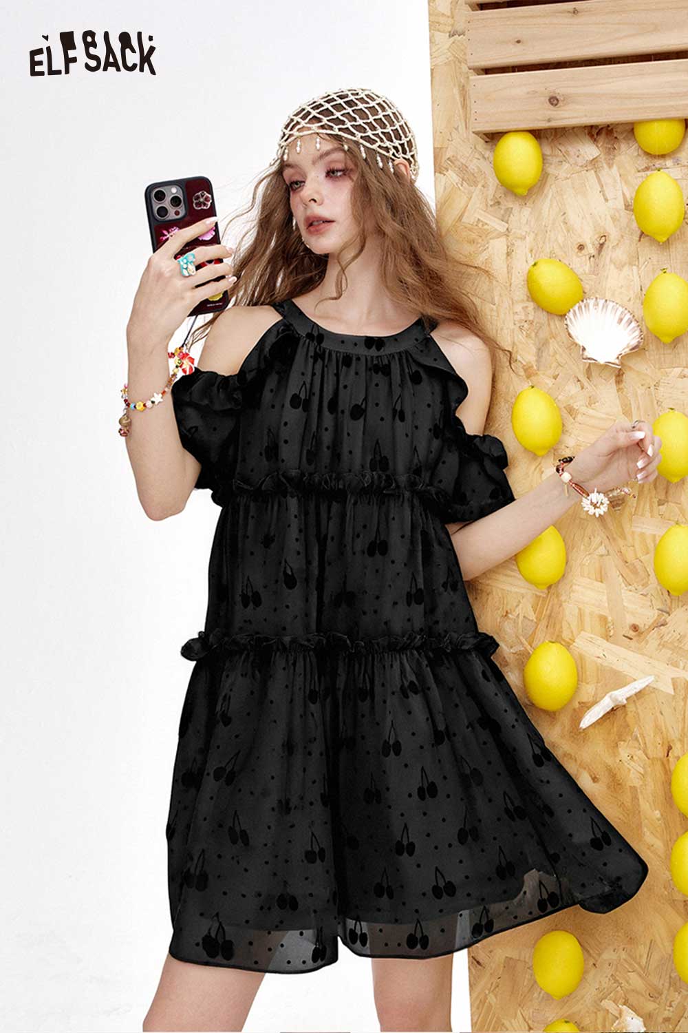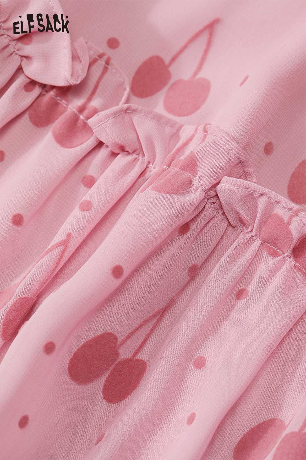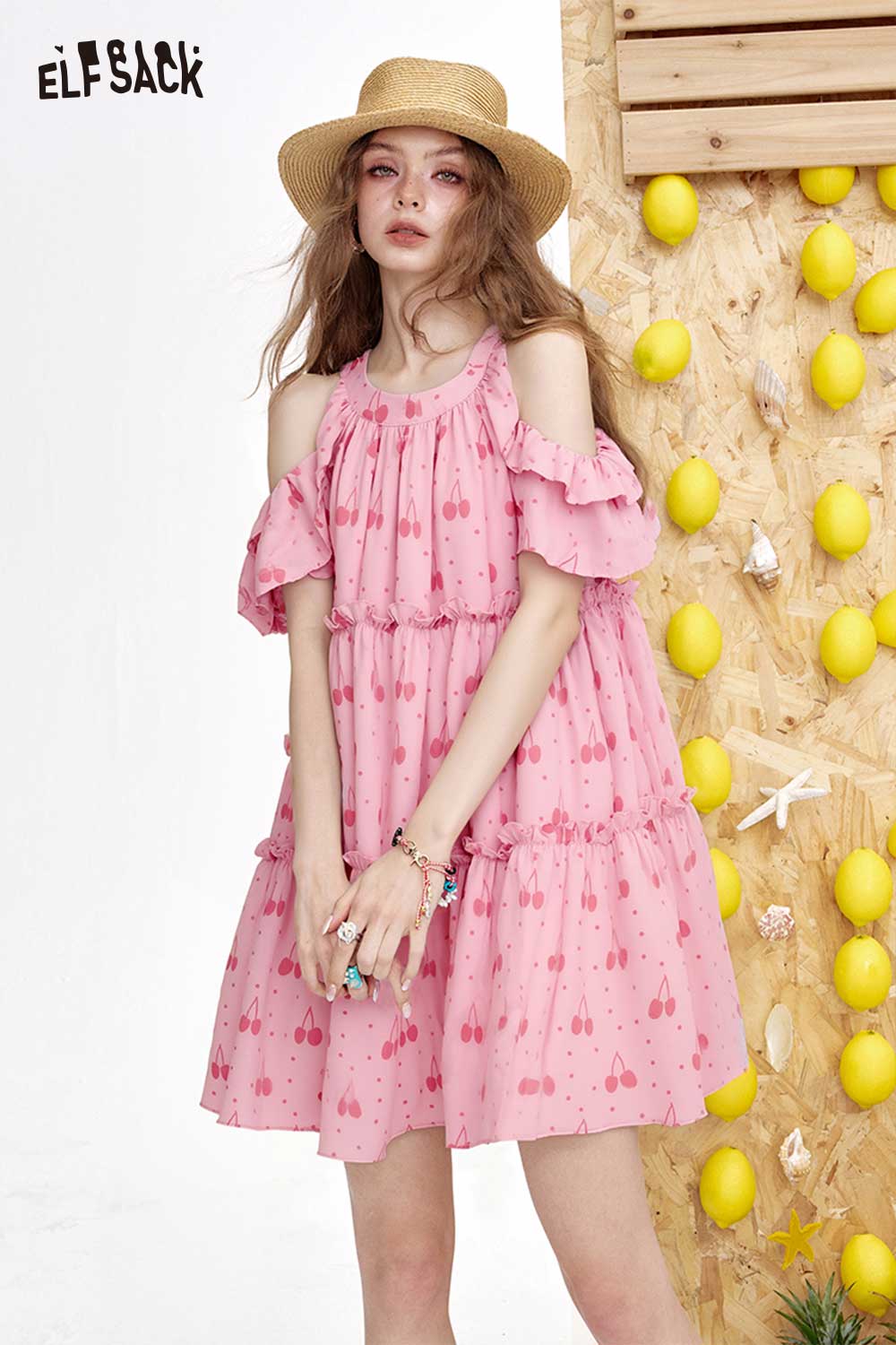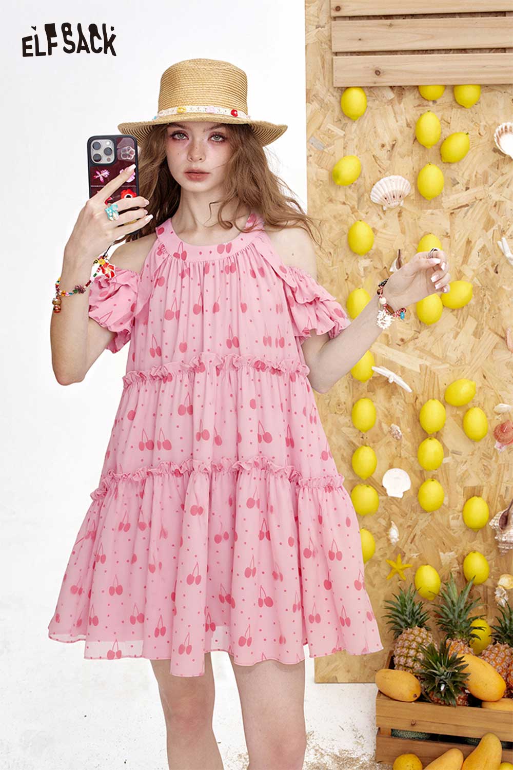 Light Cute Slip Dress Irregular Sleeve Cutout Cherry Graphic Dress