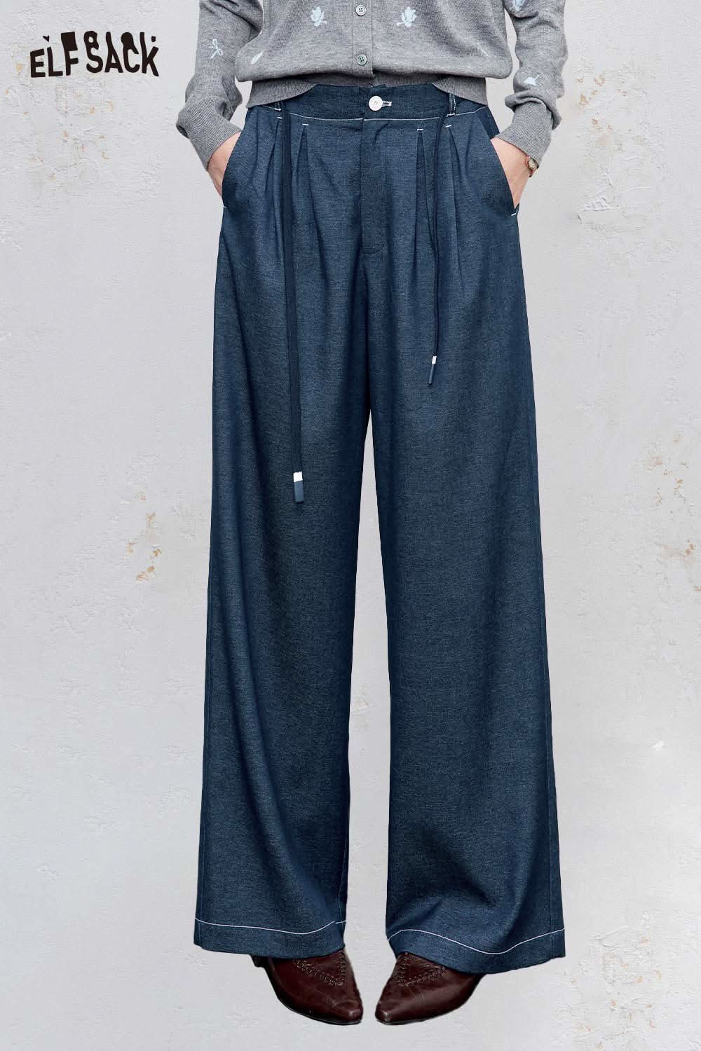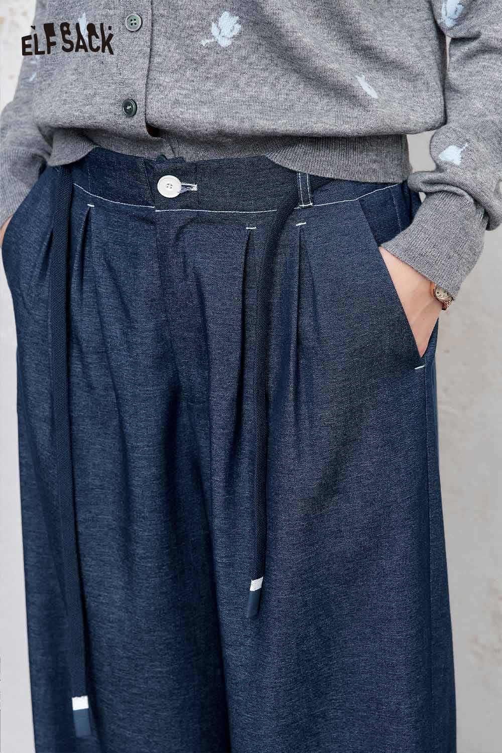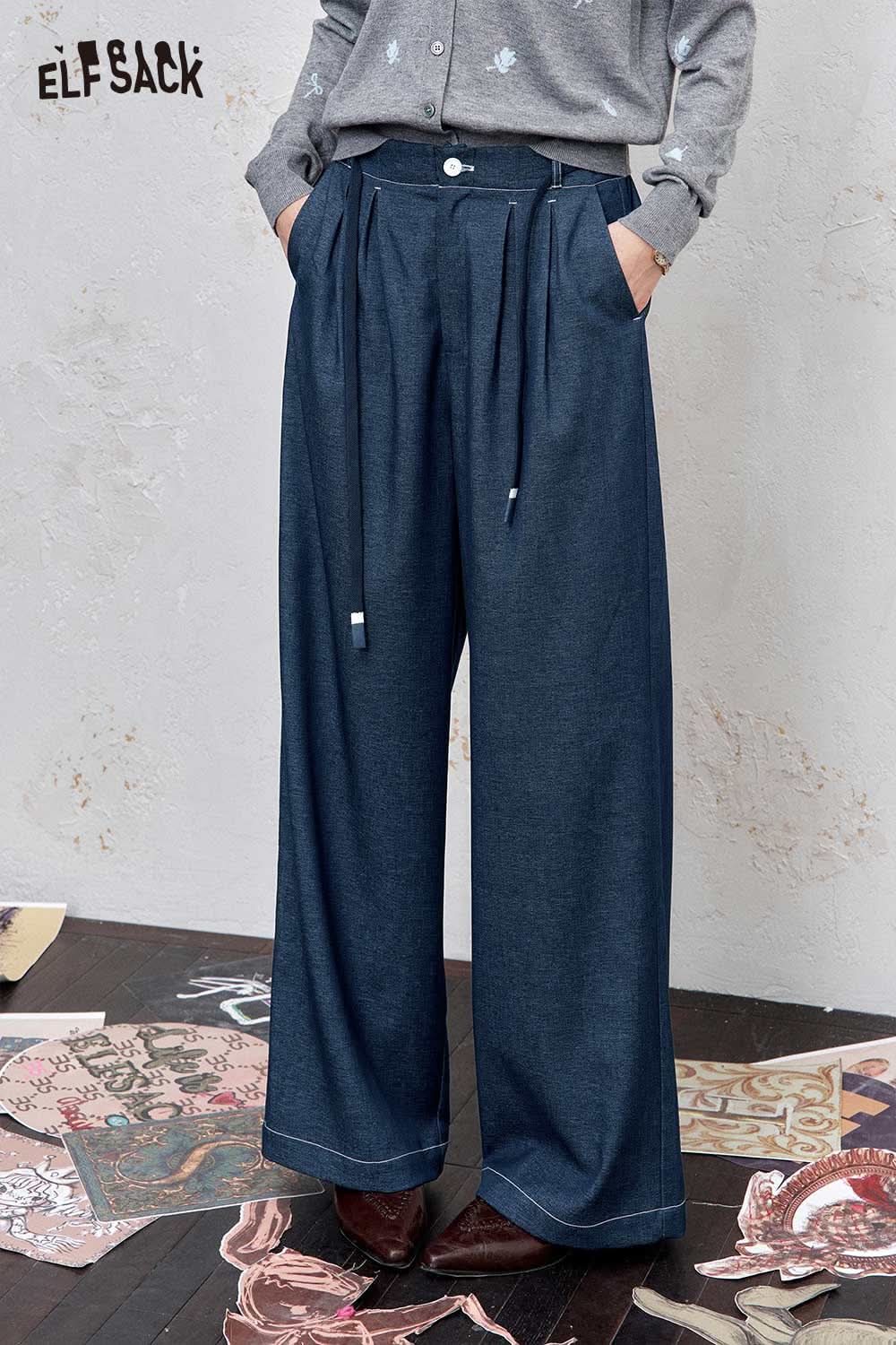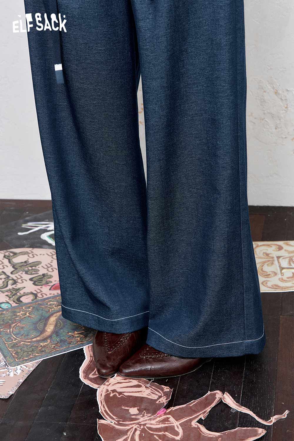 Denim Drawstring Wide-Leg Topstitching Retro Long Jeans