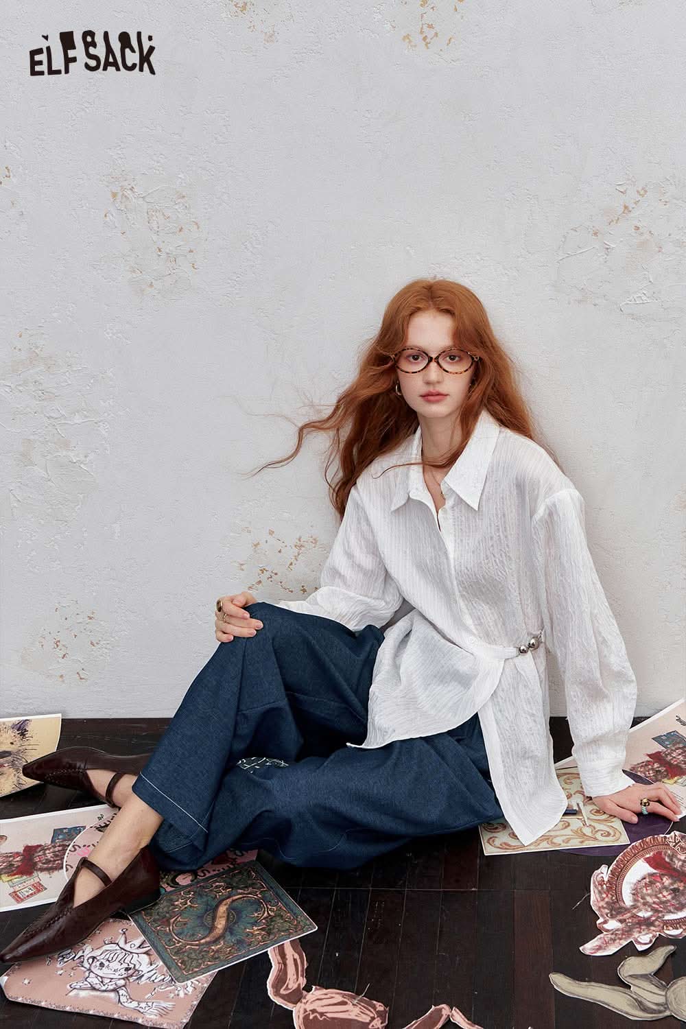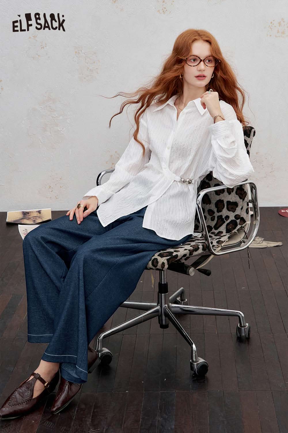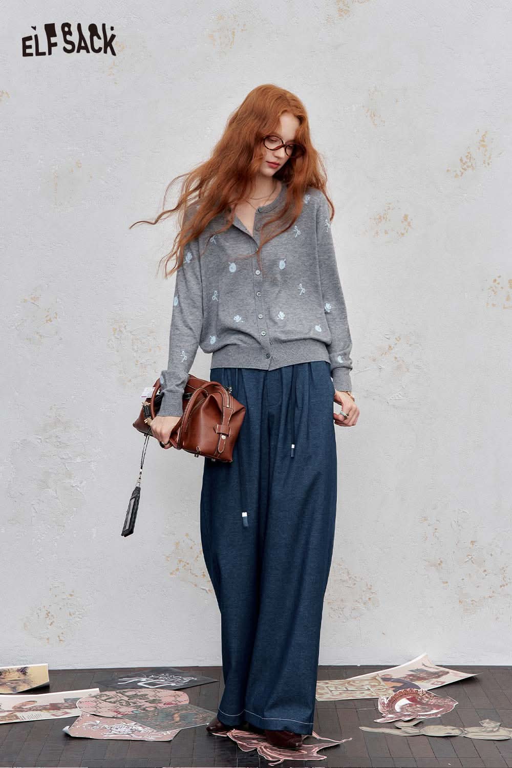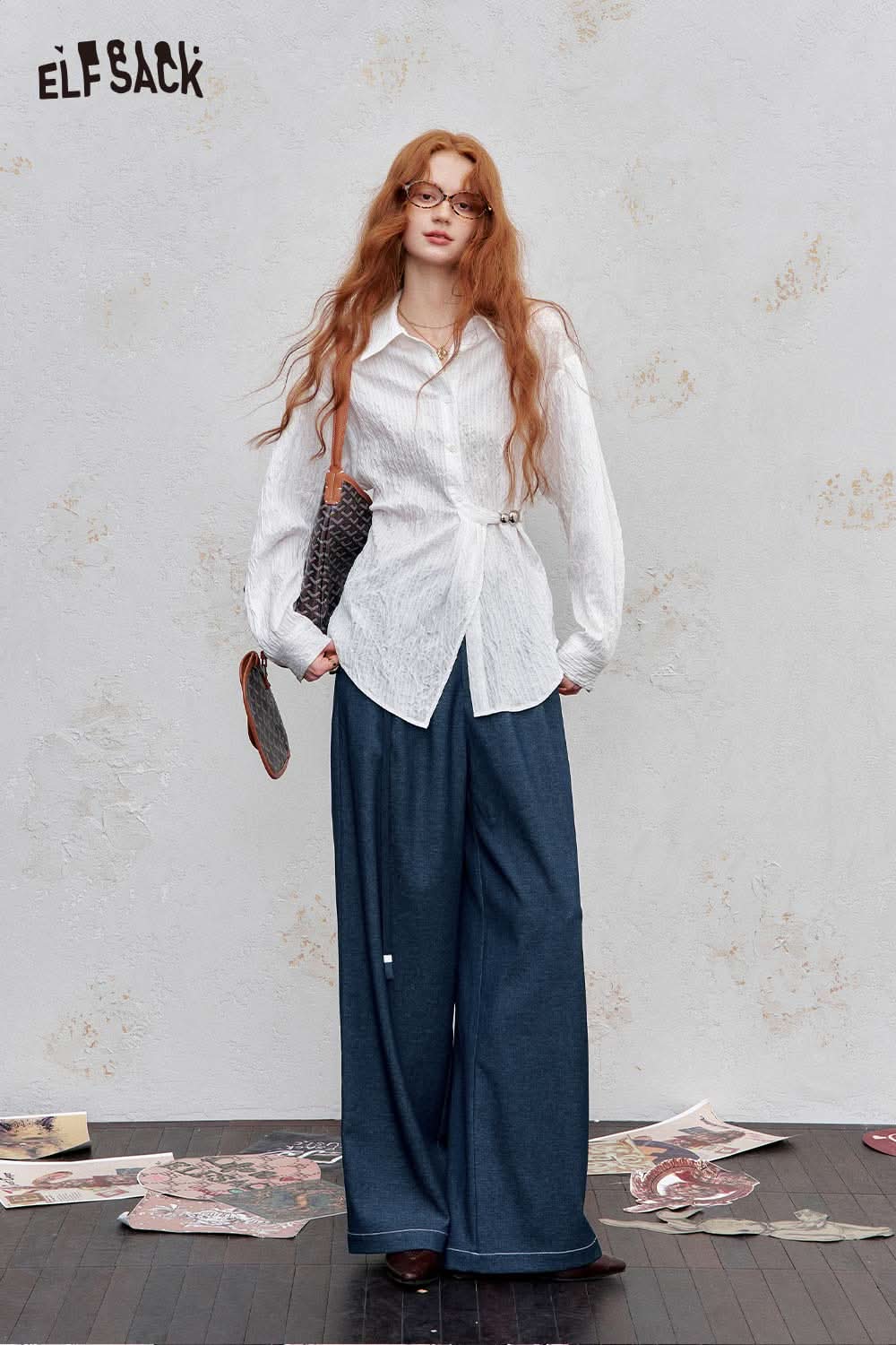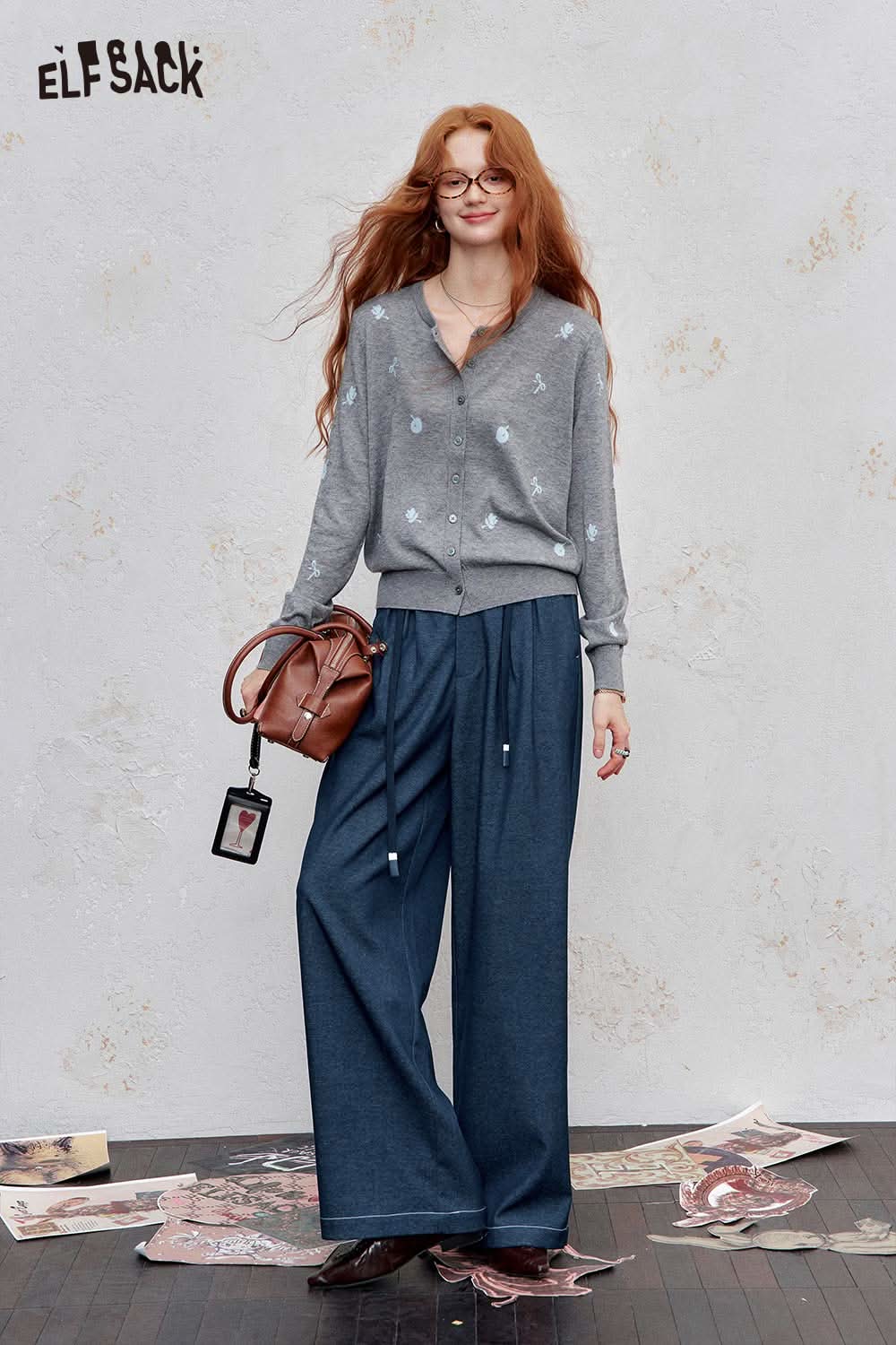 Denim Drawstring Wide-Leg Topstitching Retro Long Jeans