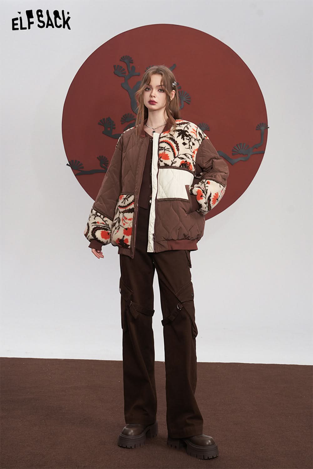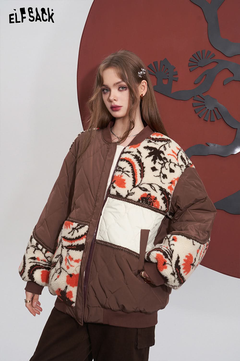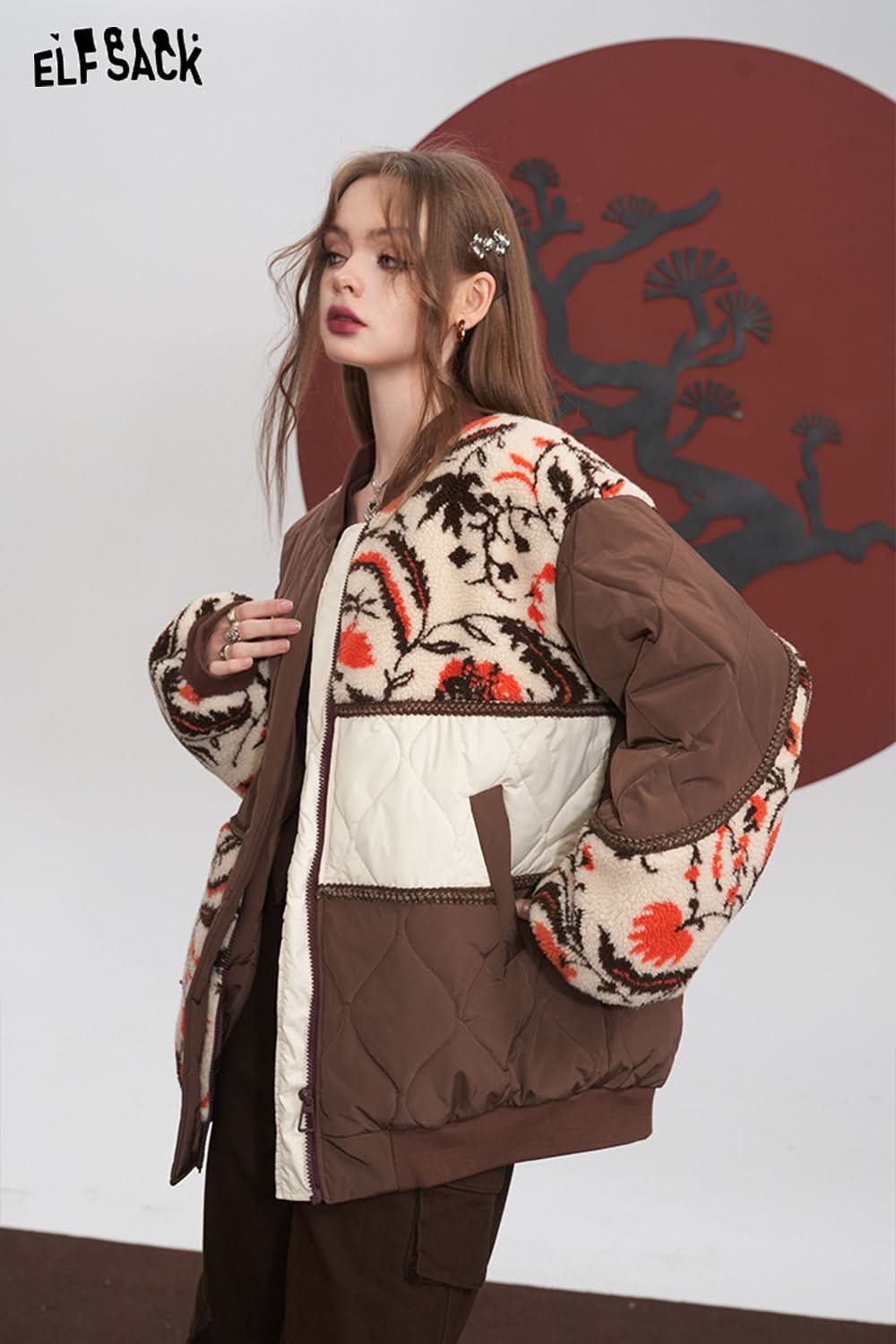 ELFSACK Spliced Cotton Coats Women Loose Rhombus Designed Jackets