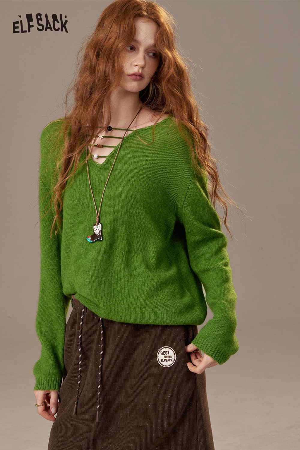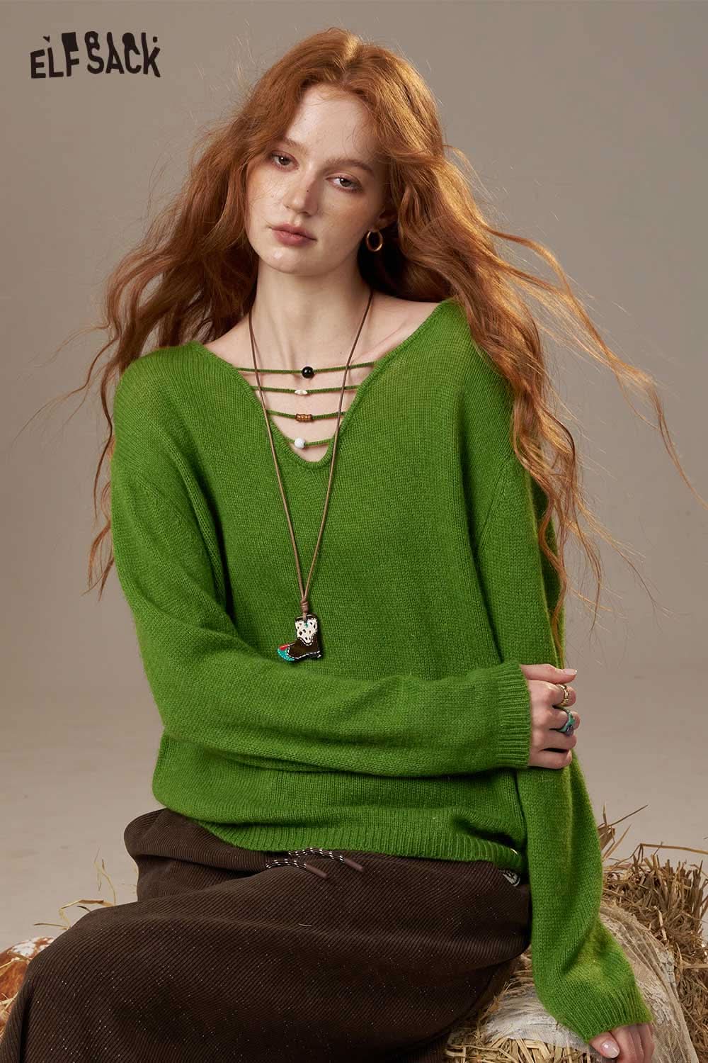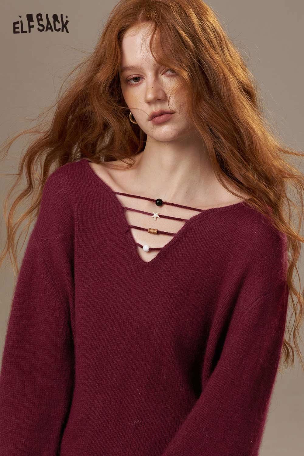 Soft Knit Lace-up Beaded V-Neck Loose Fit Sweater