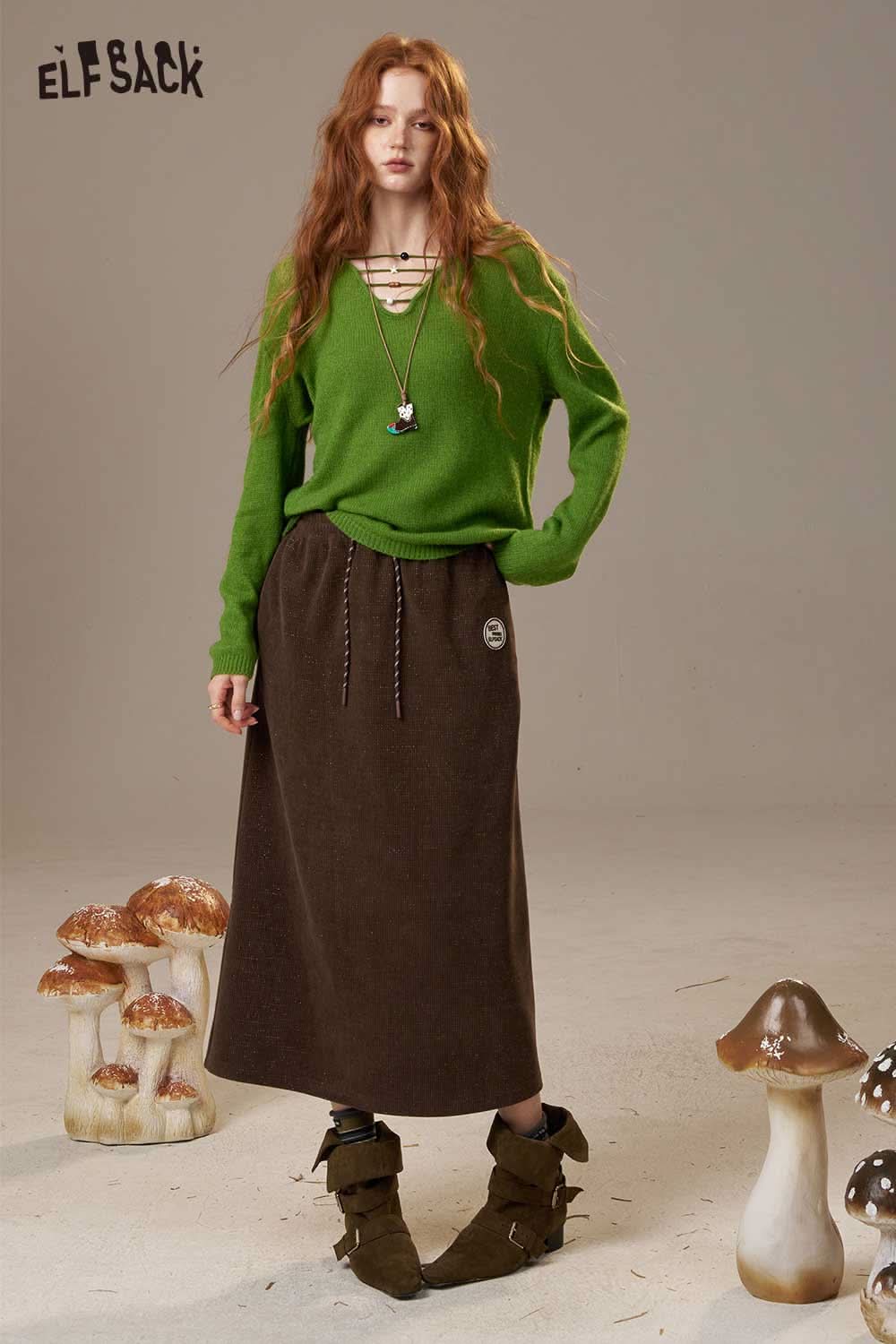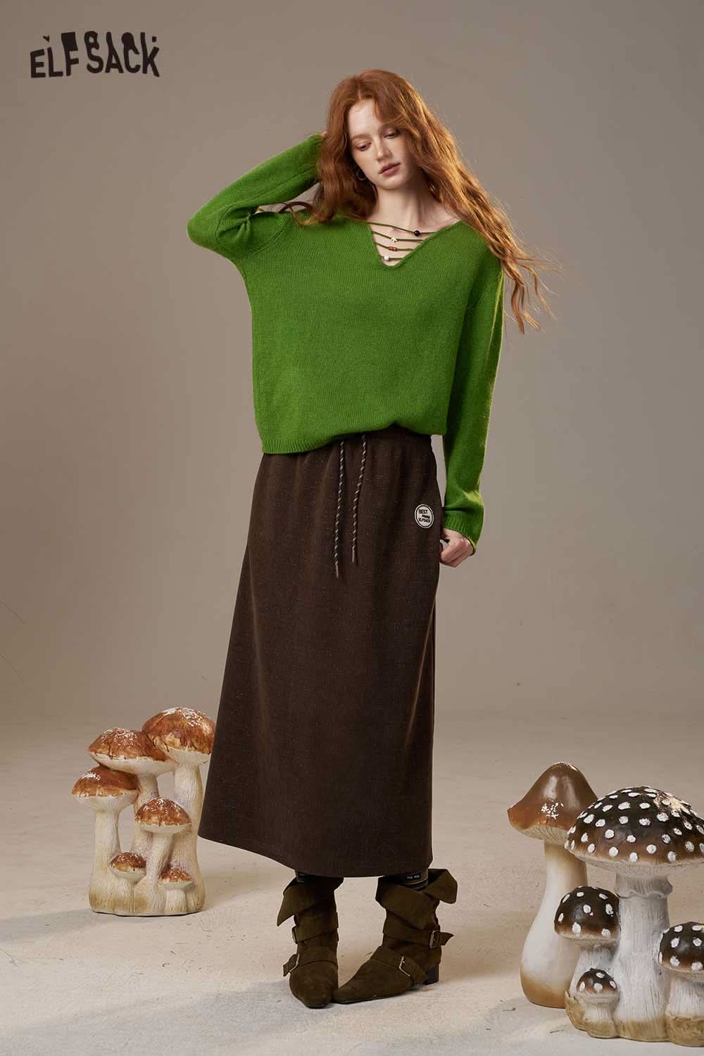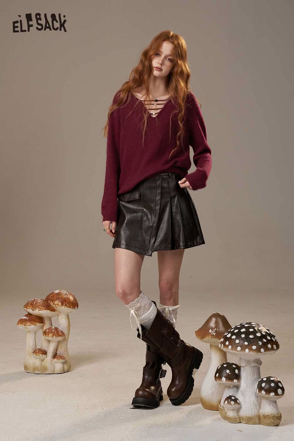 Soft Knit Lace-up Beaded V-Neck Loose Fit Sweater