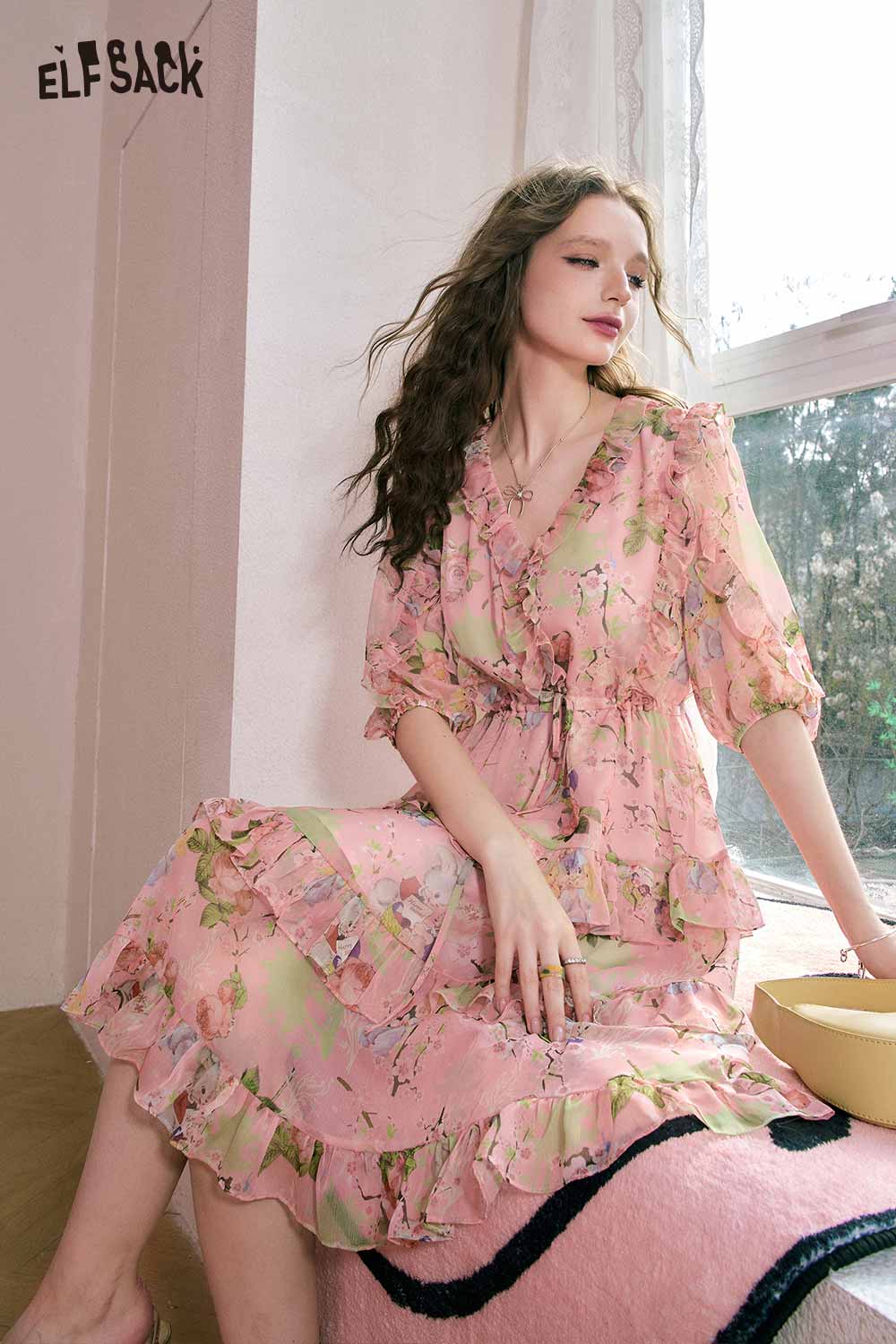 Elegant French Floral Graphic Ruffle Holiday Maxi Dress