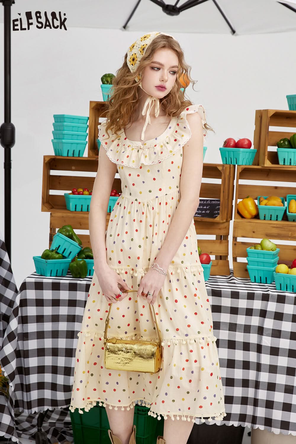picnic travel vacation holiday soft comfortable fitted polka dot Chinese style dress button waist cinching skirt U-neck long dress pullover