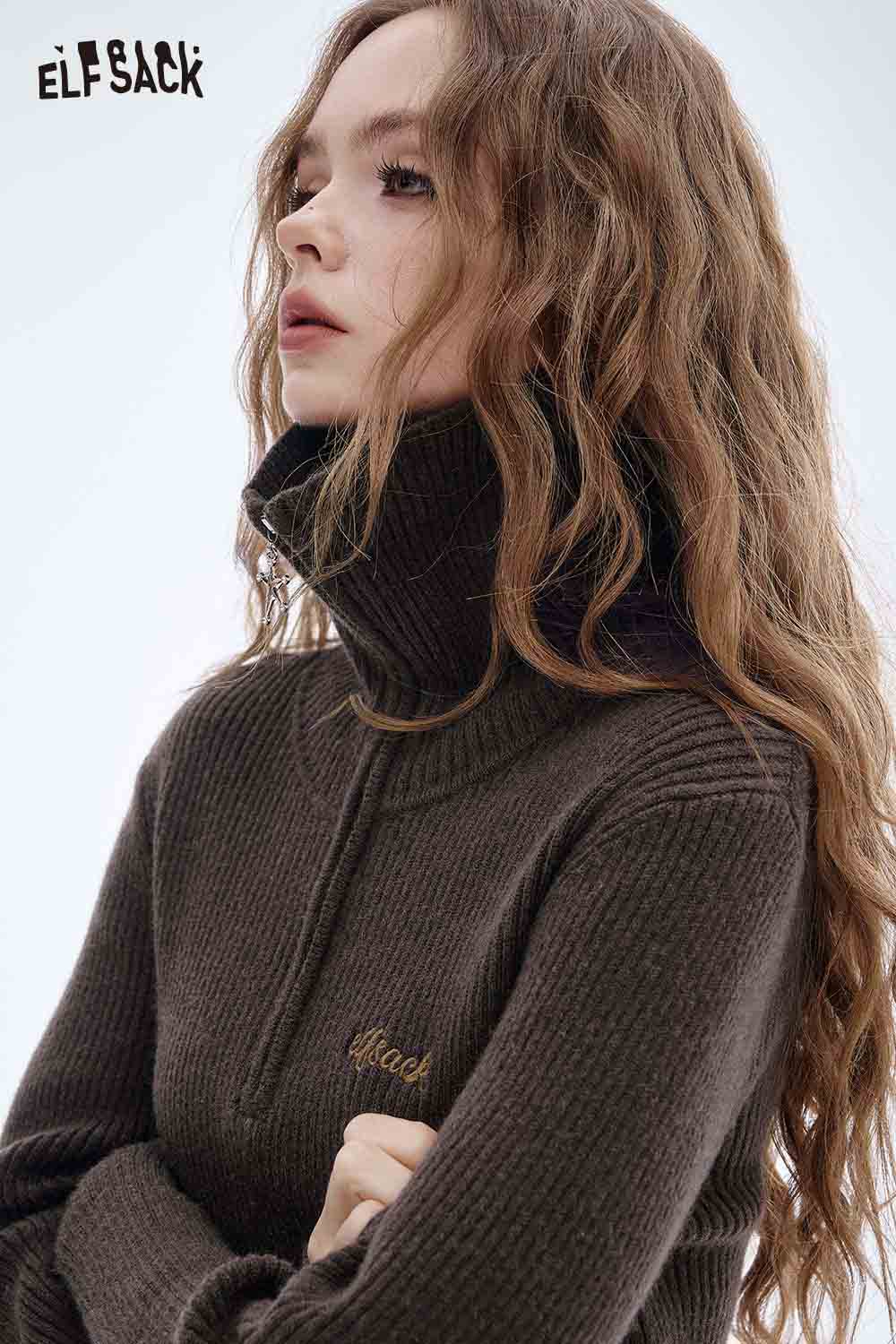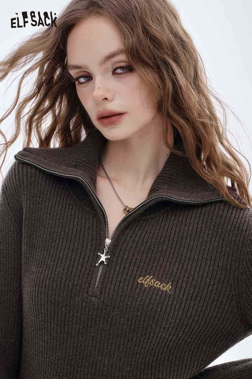 ELFSACK slim fit embroidered long dress in brown with a stylish zip collar and long sleeves