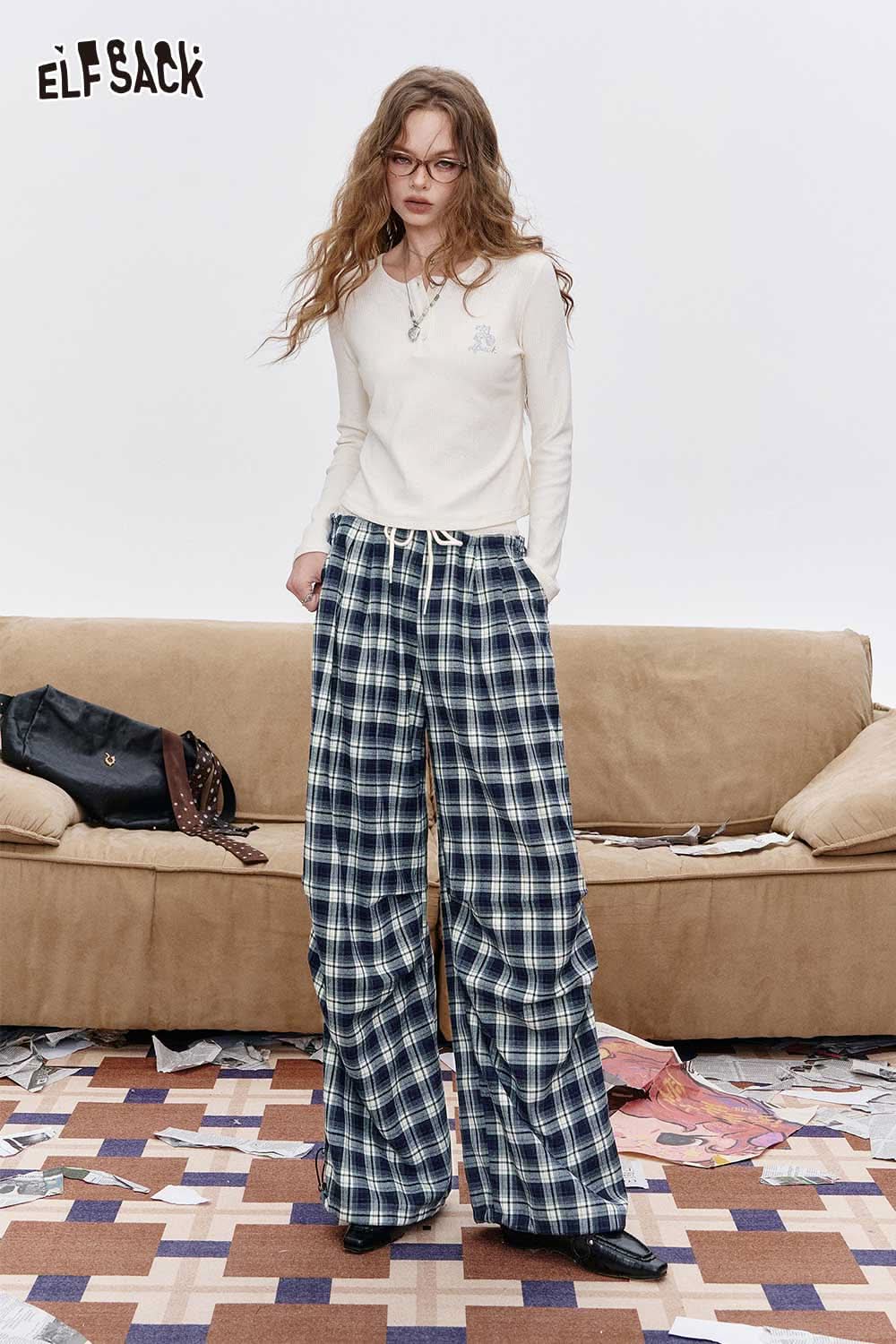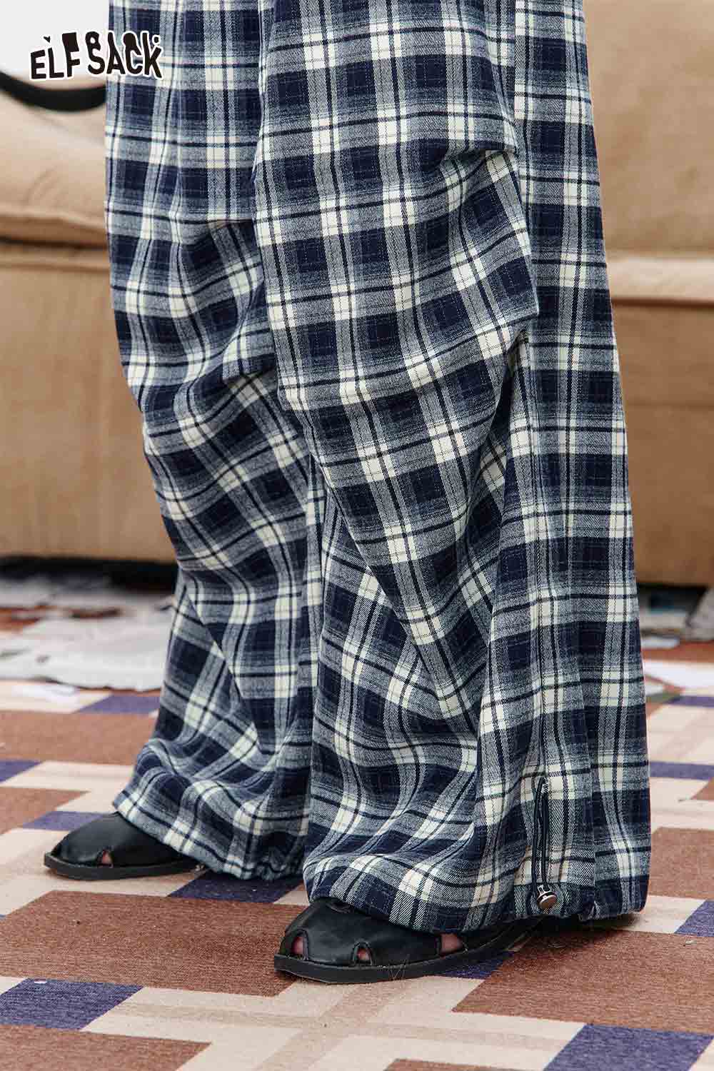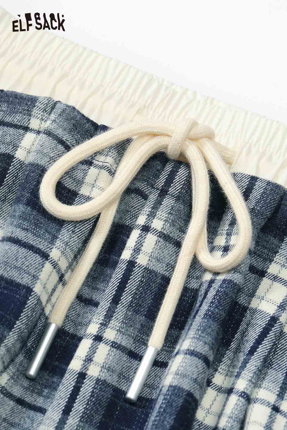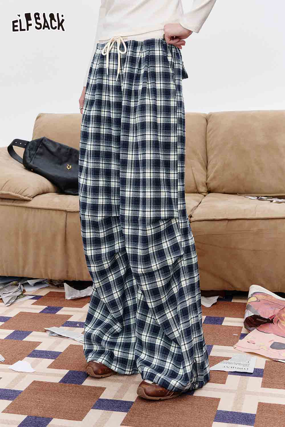 Cotton Blend Elastic Waist Adjustable Drawstring Plaid Design Wide Leg Trousers