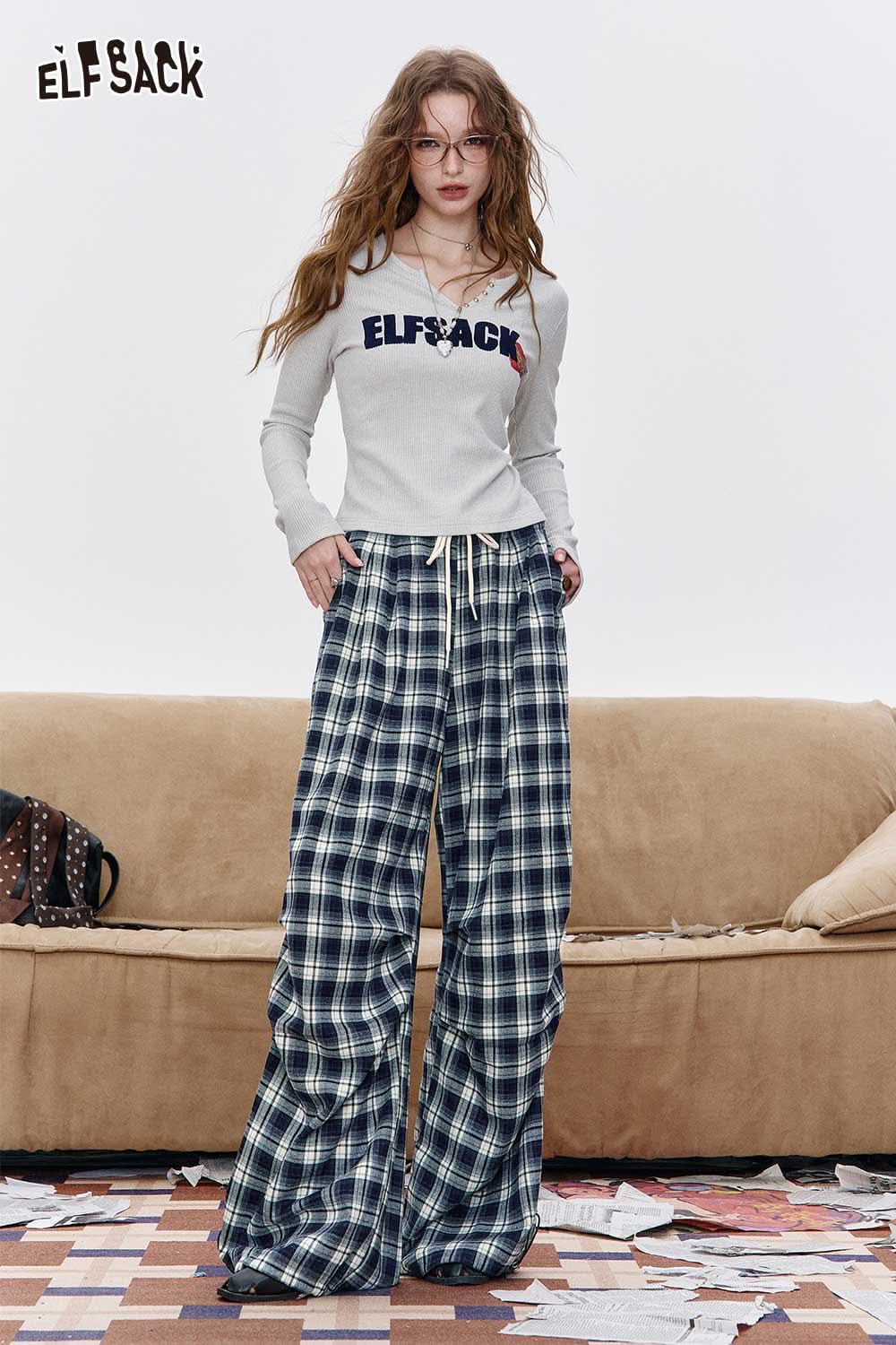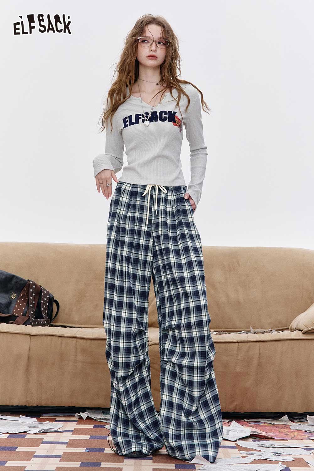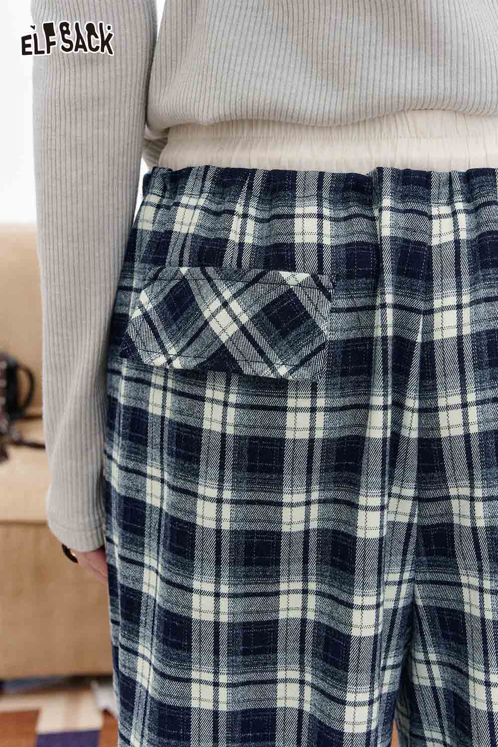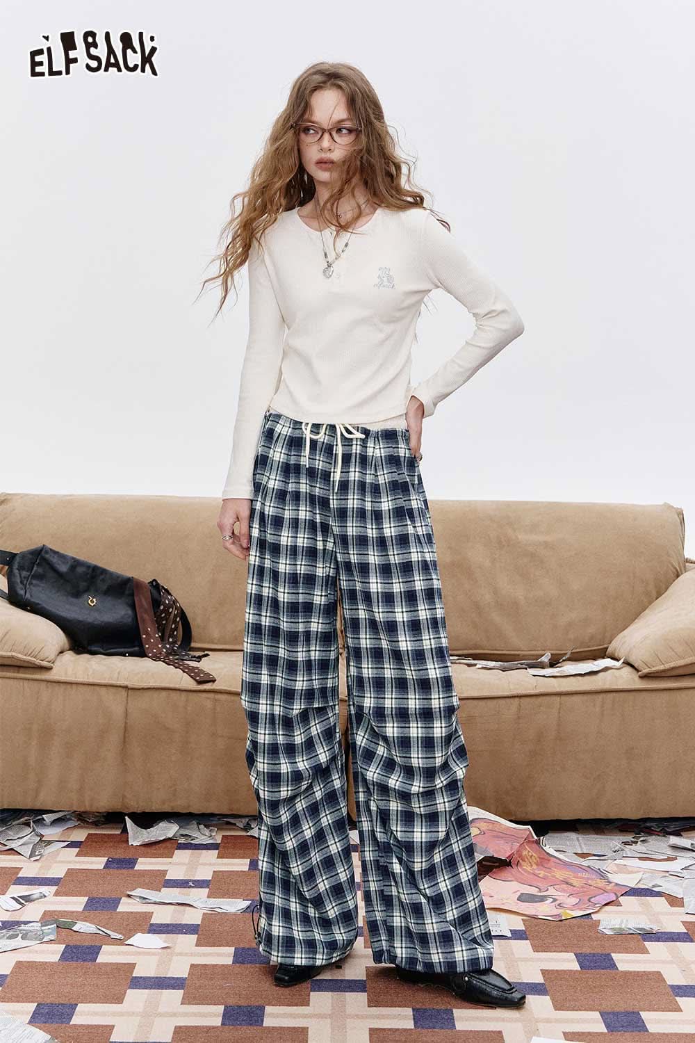 Cotton Blend Elastic Waist Adjustable Drawstring Plaid Design Wide Leg Trousers
