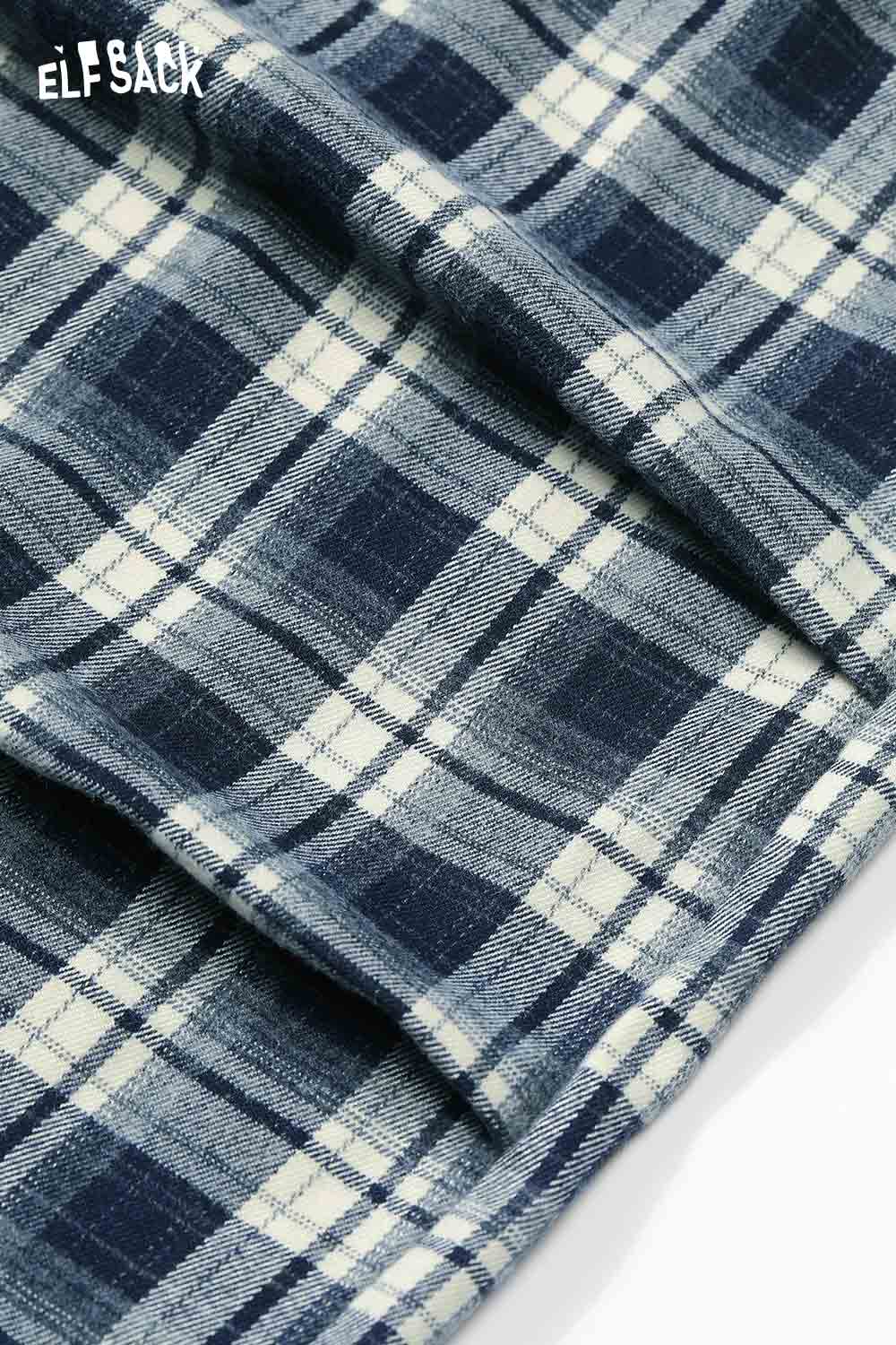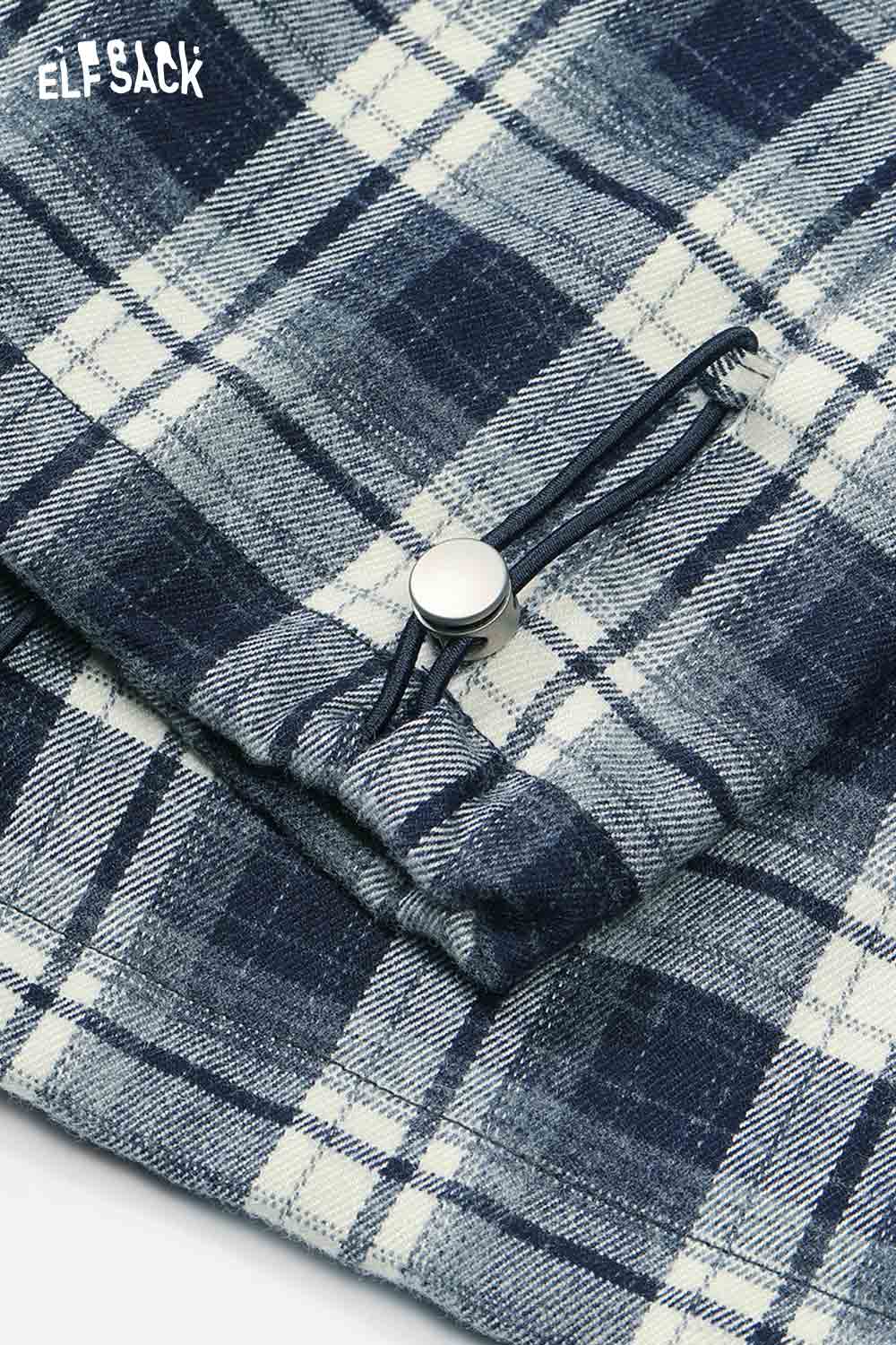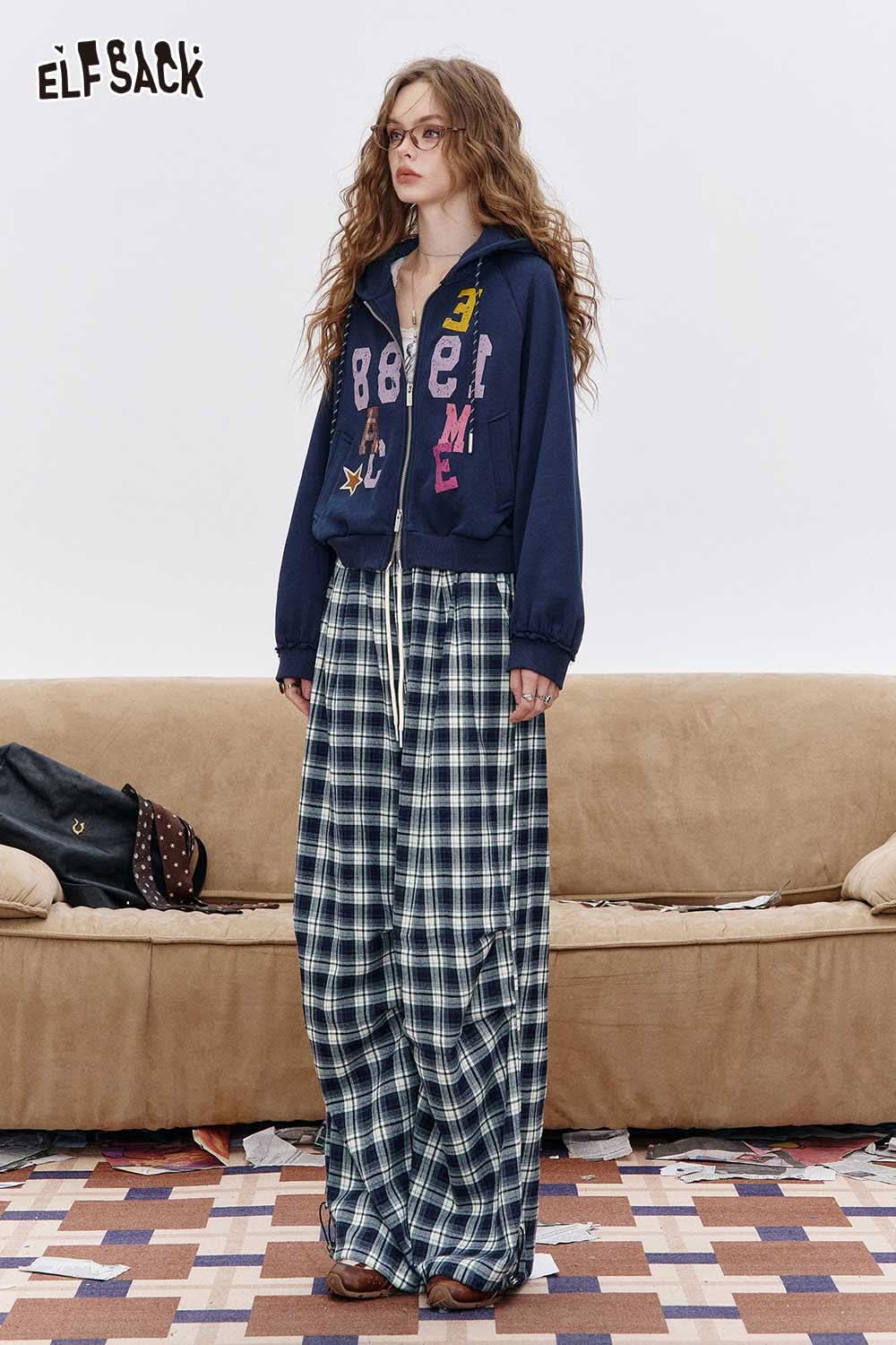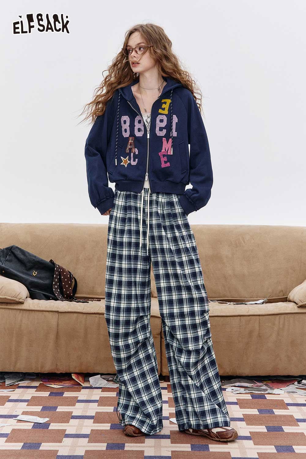 Cotton Blend Elastic Waist Adjustable Drawstring Plaid Design Wide Leg Trousers