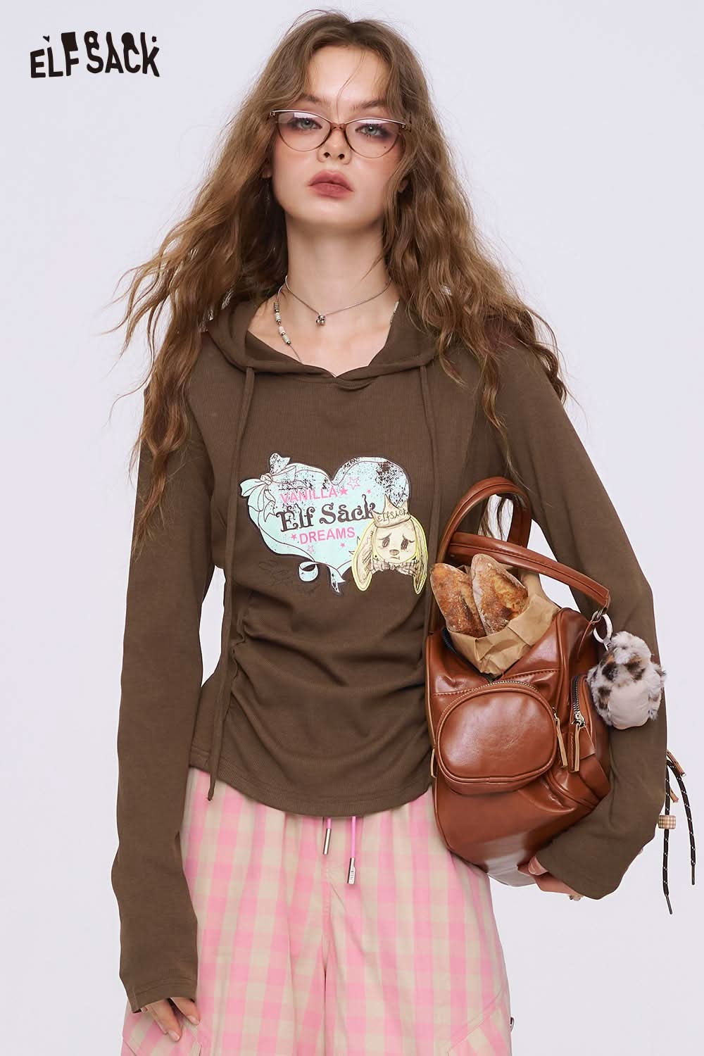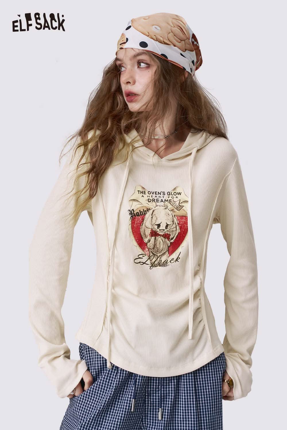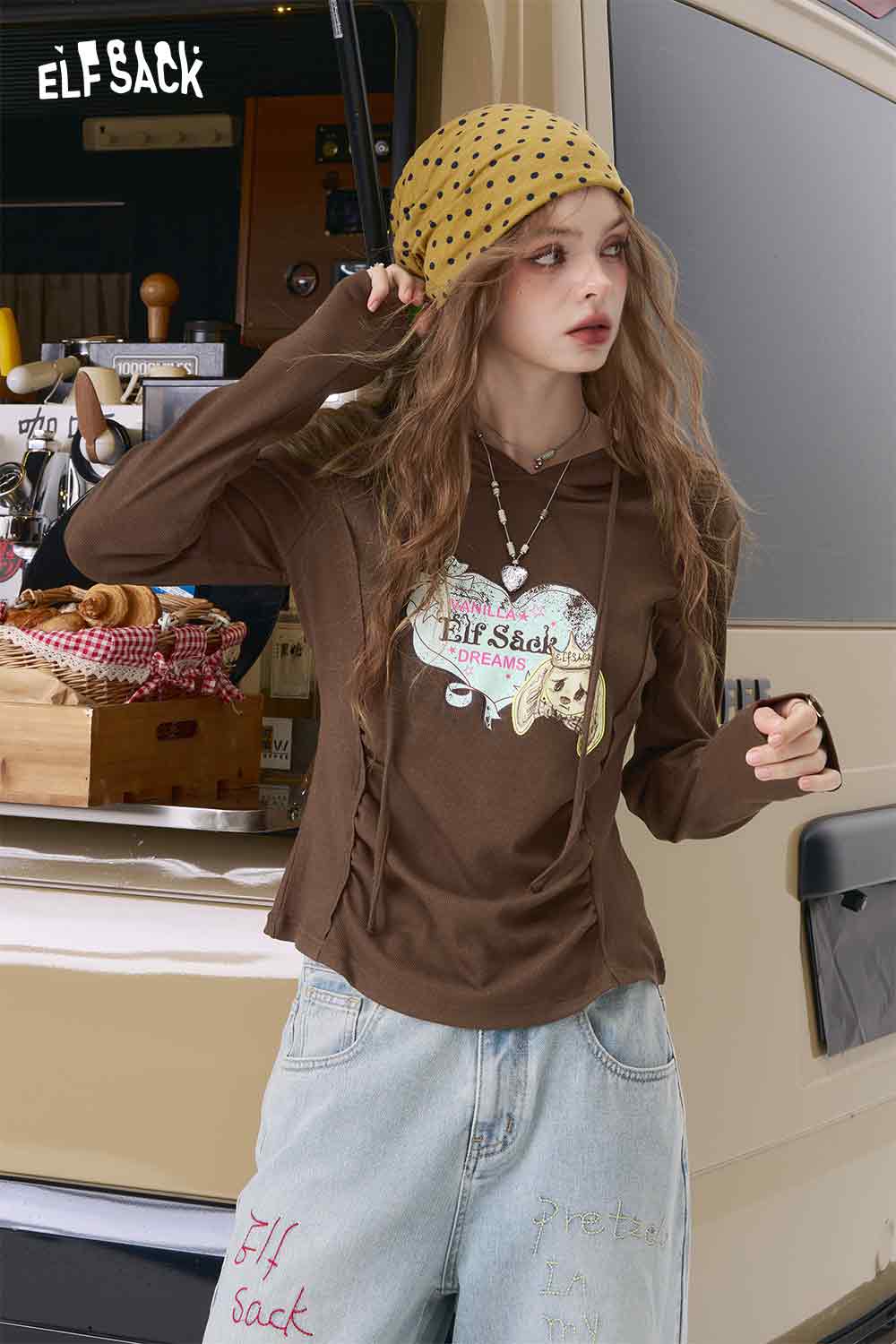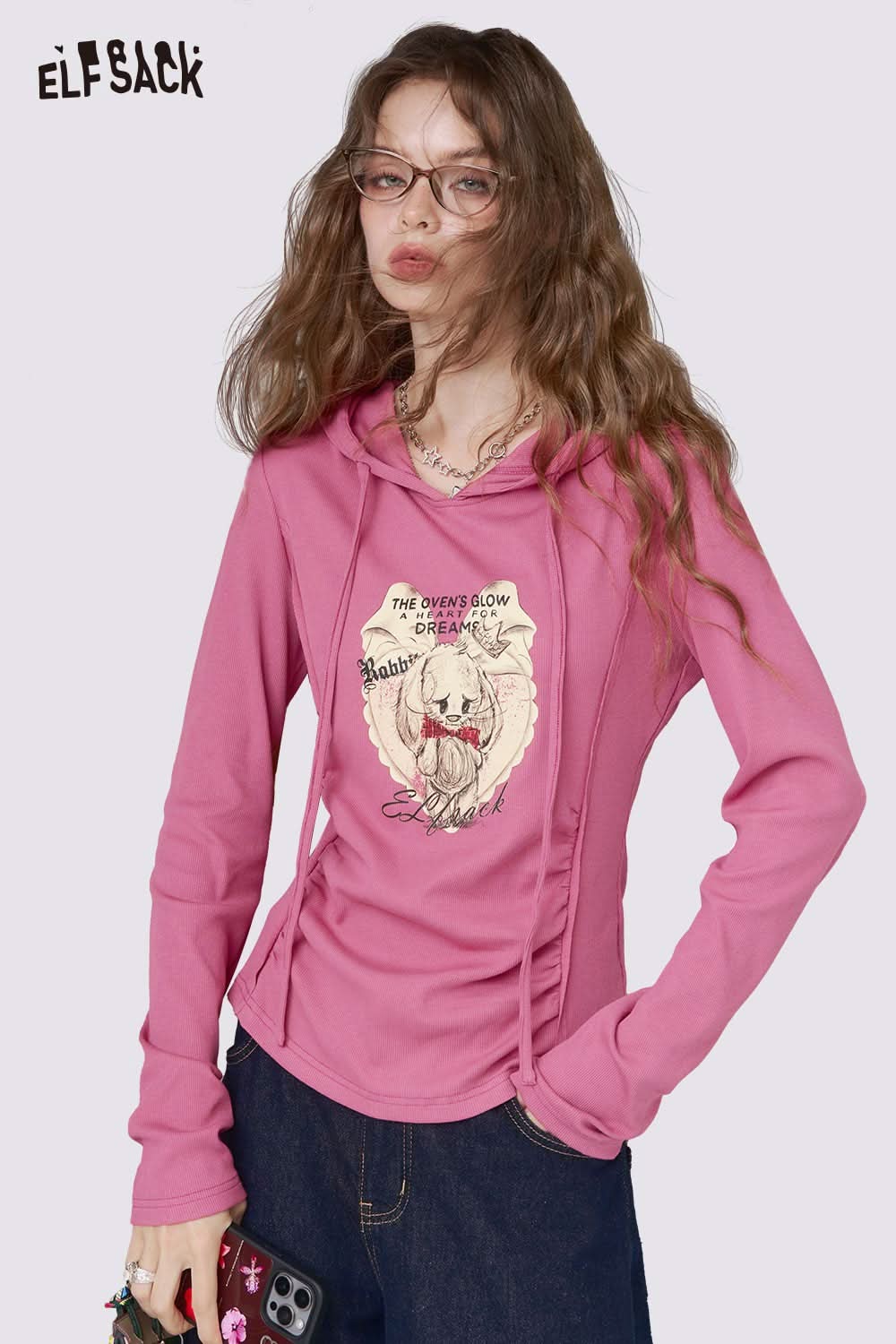 Slim-Fit Ruched Print Long Sleeve Hooded Top