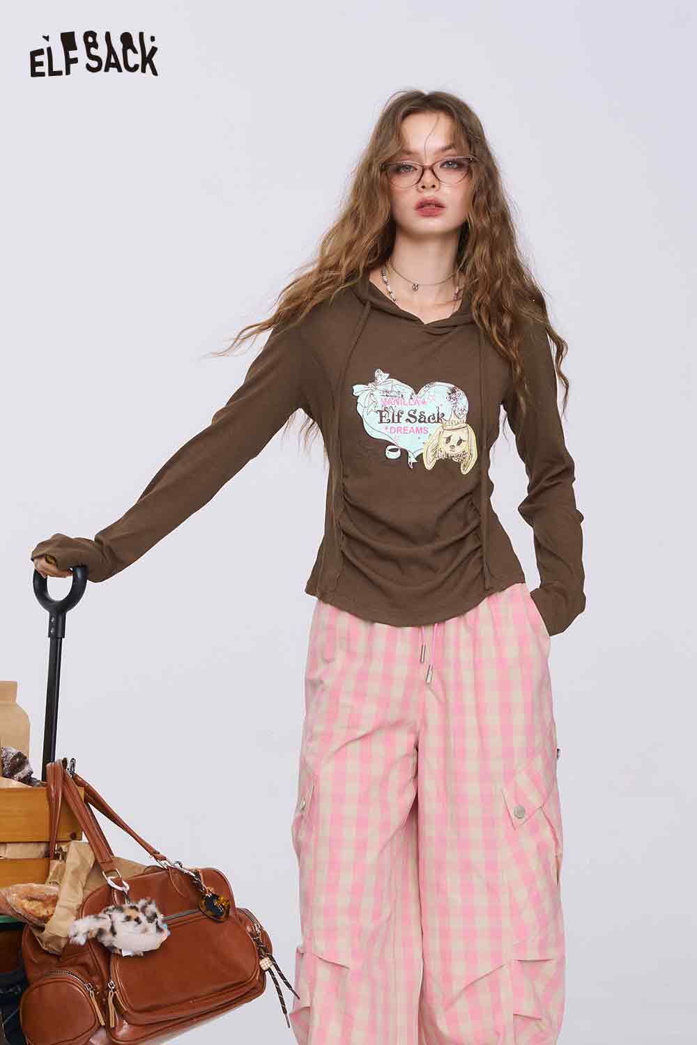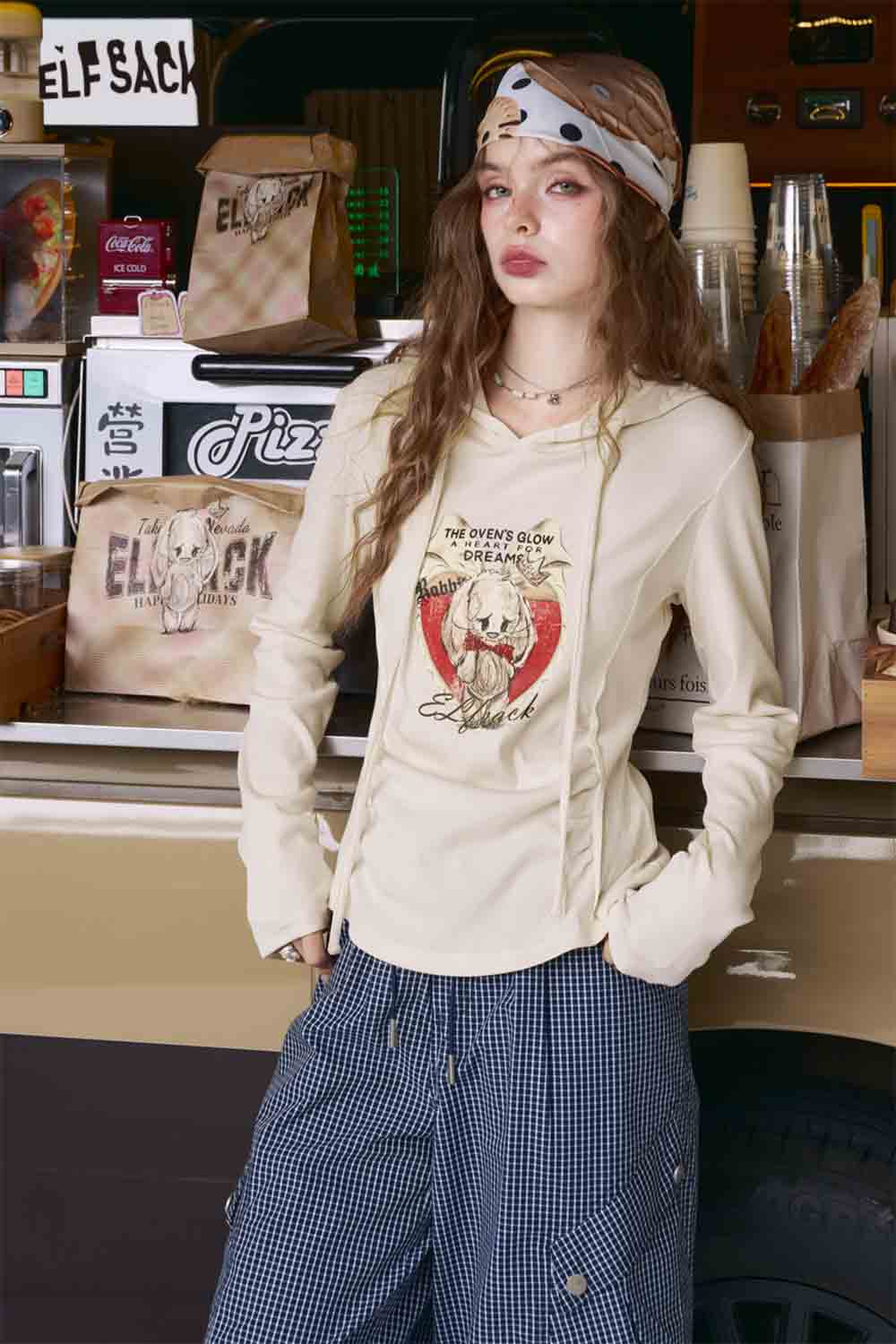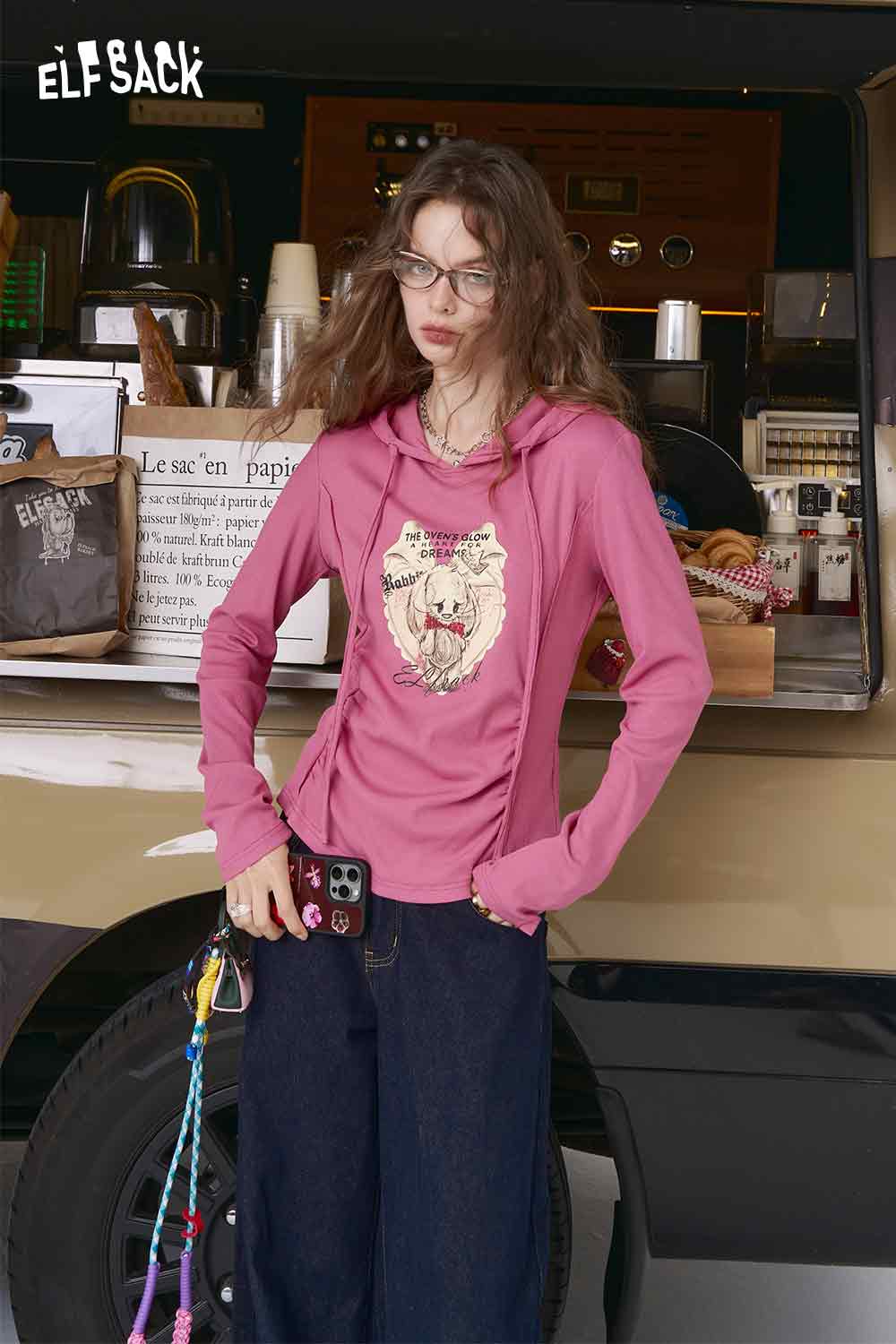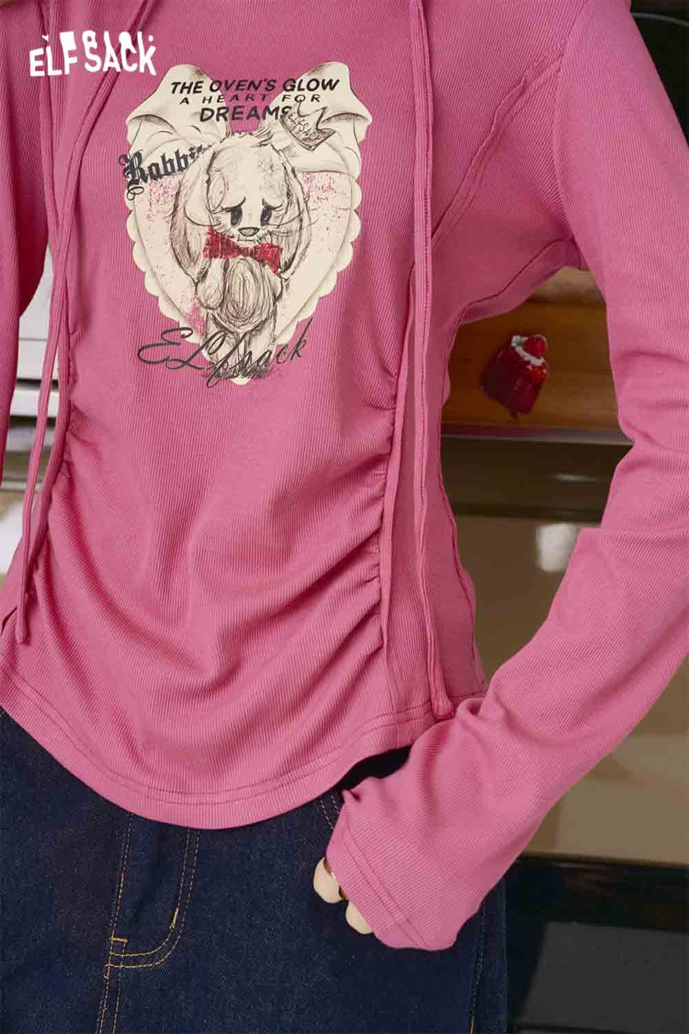 Slim-Fit Ruched Print Long Sleeve Hooded Top