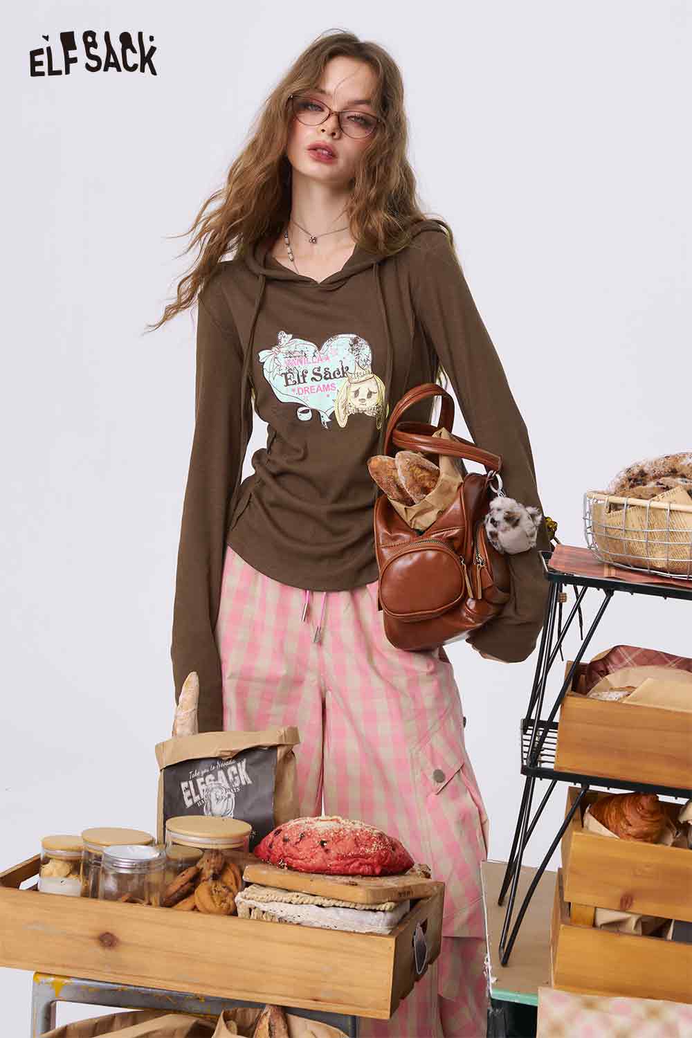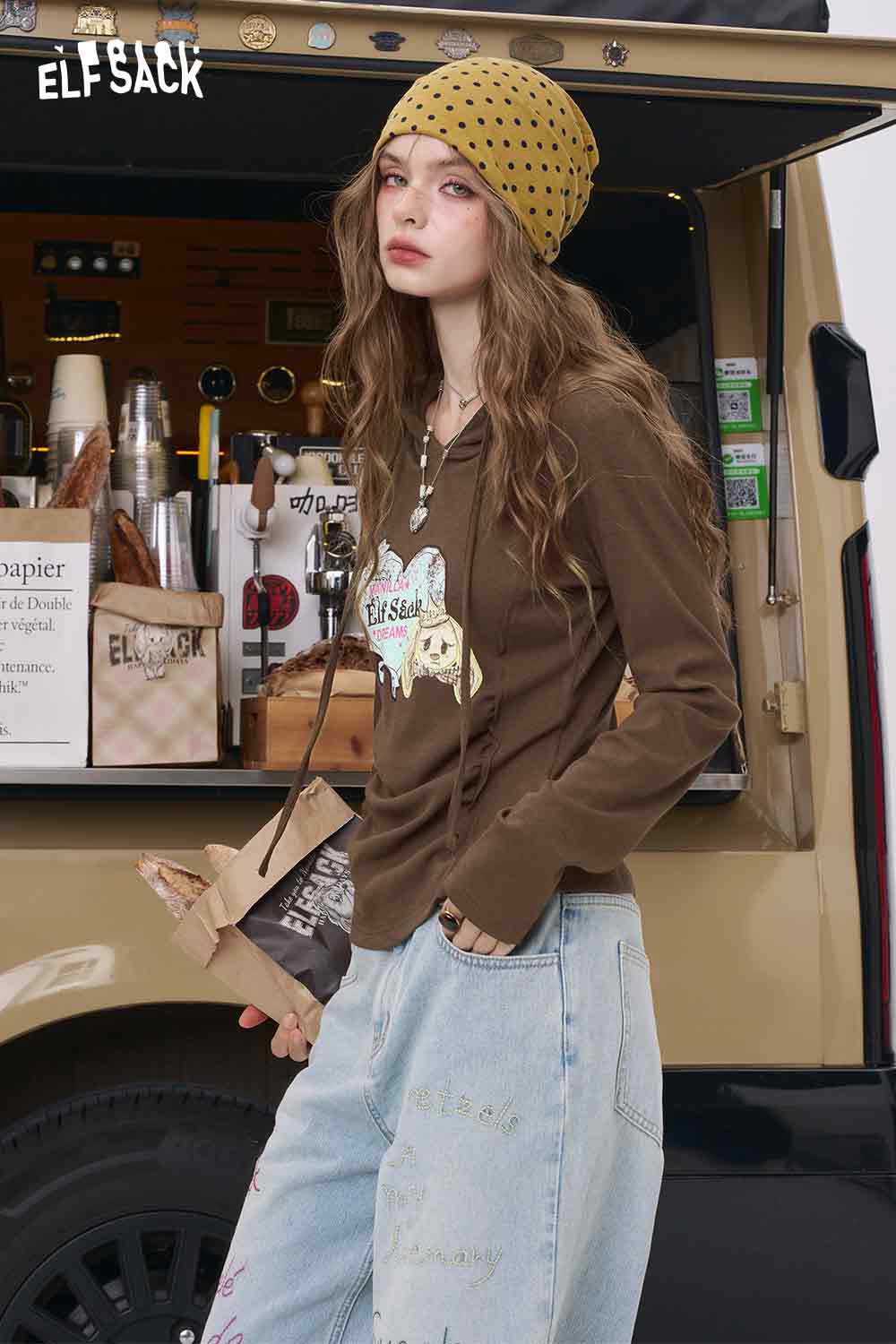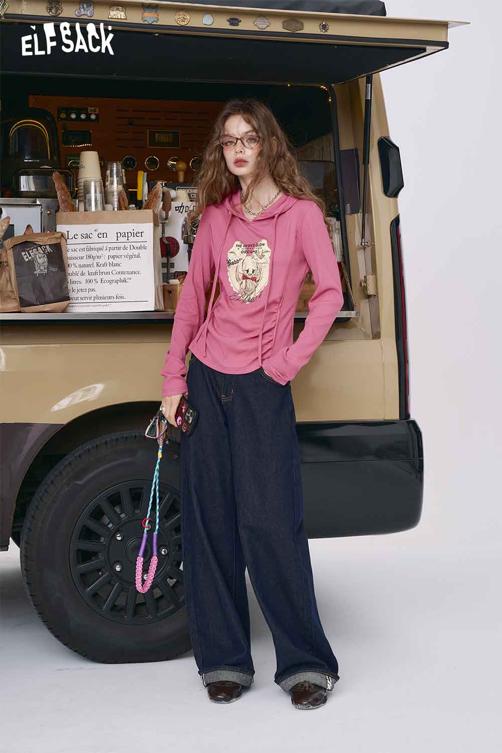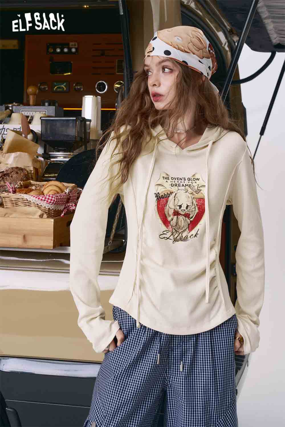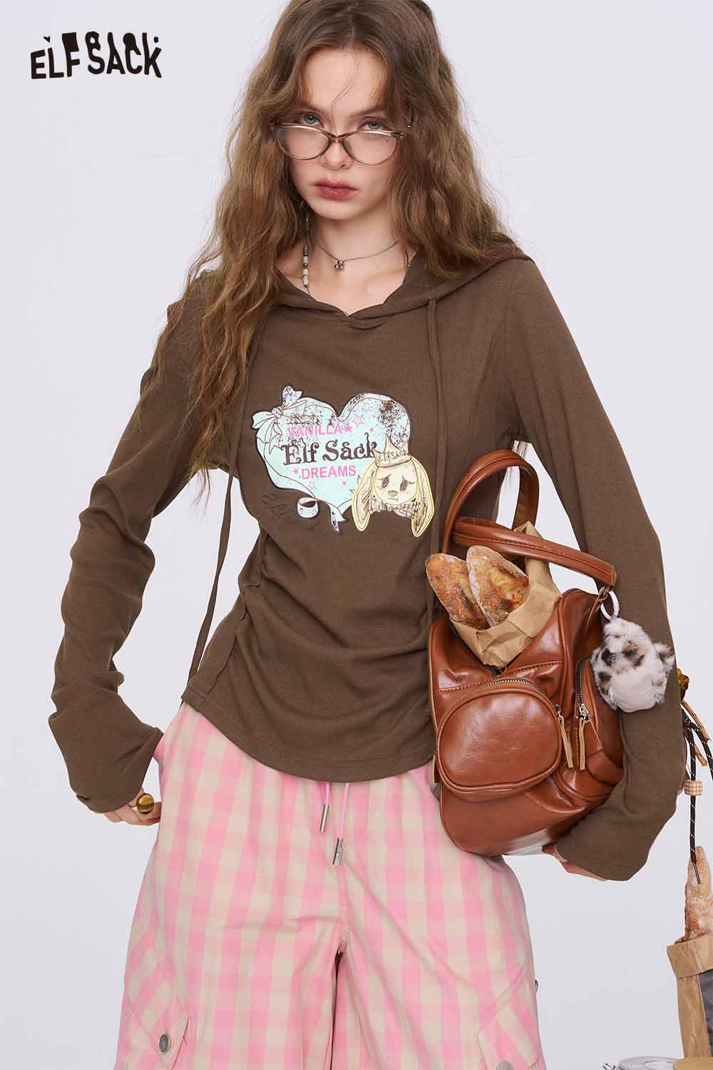 Slim-Fit Ruched Print Long Sleeve Hooded Top