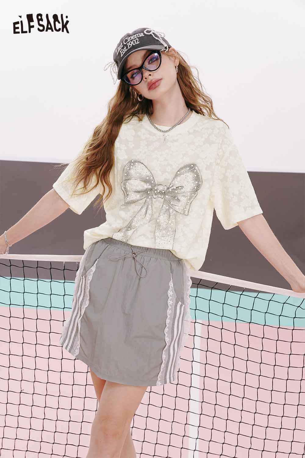 Sweet Bow Rhinestone Lace Short Sleeve Tshirt