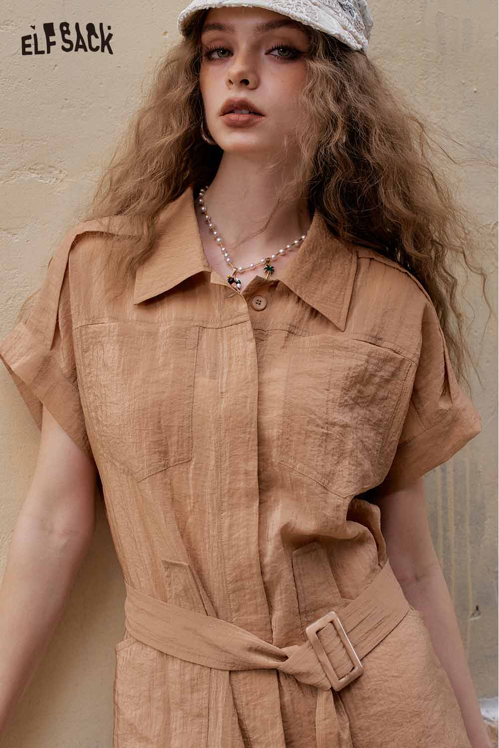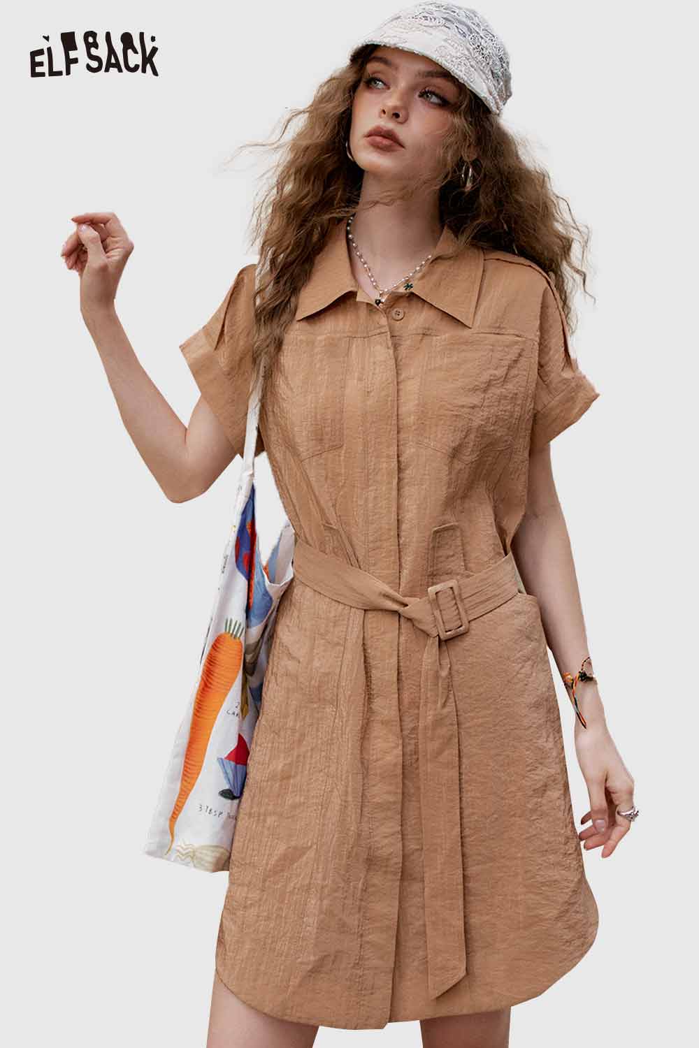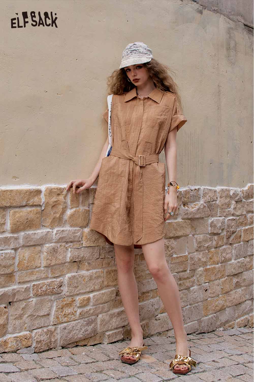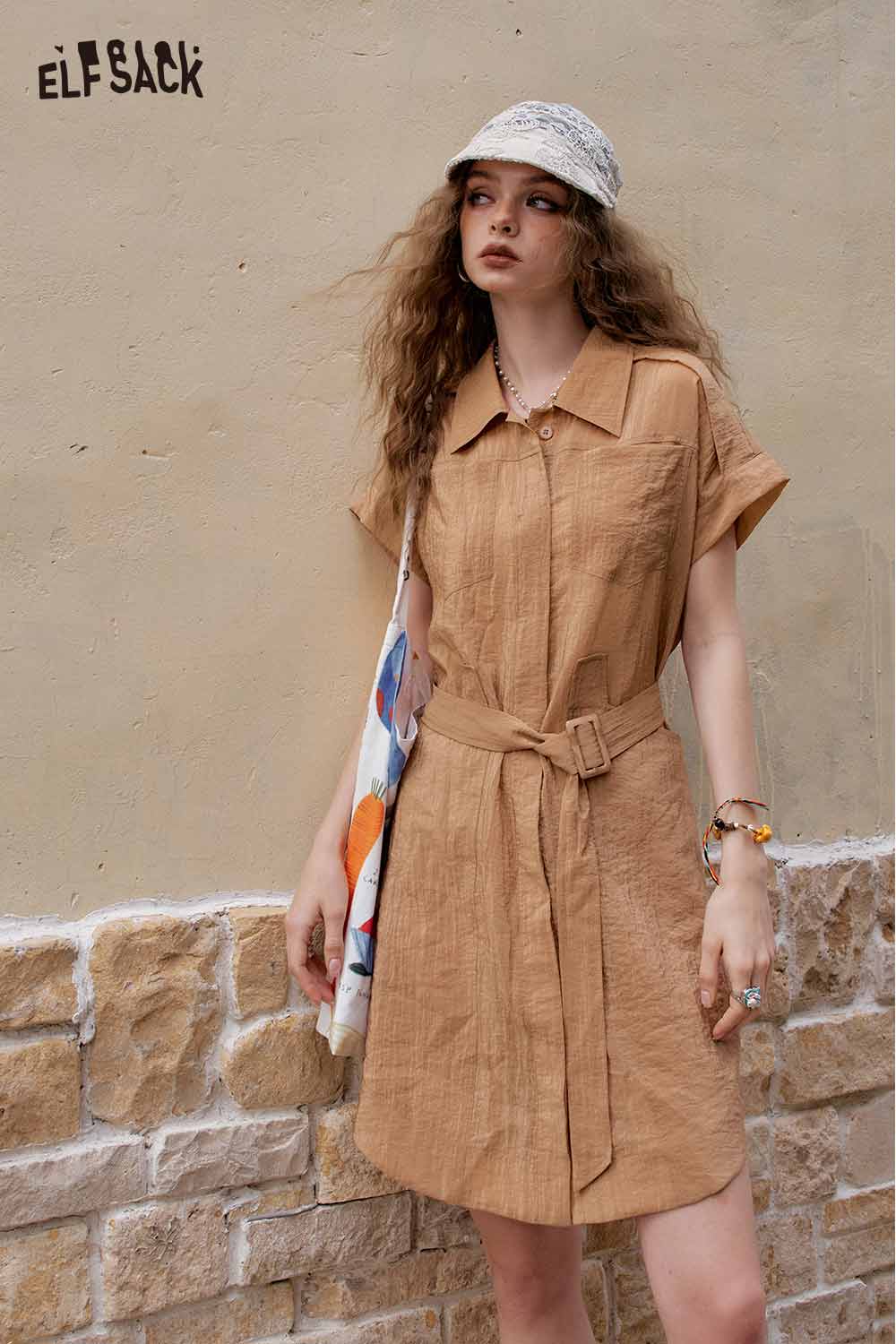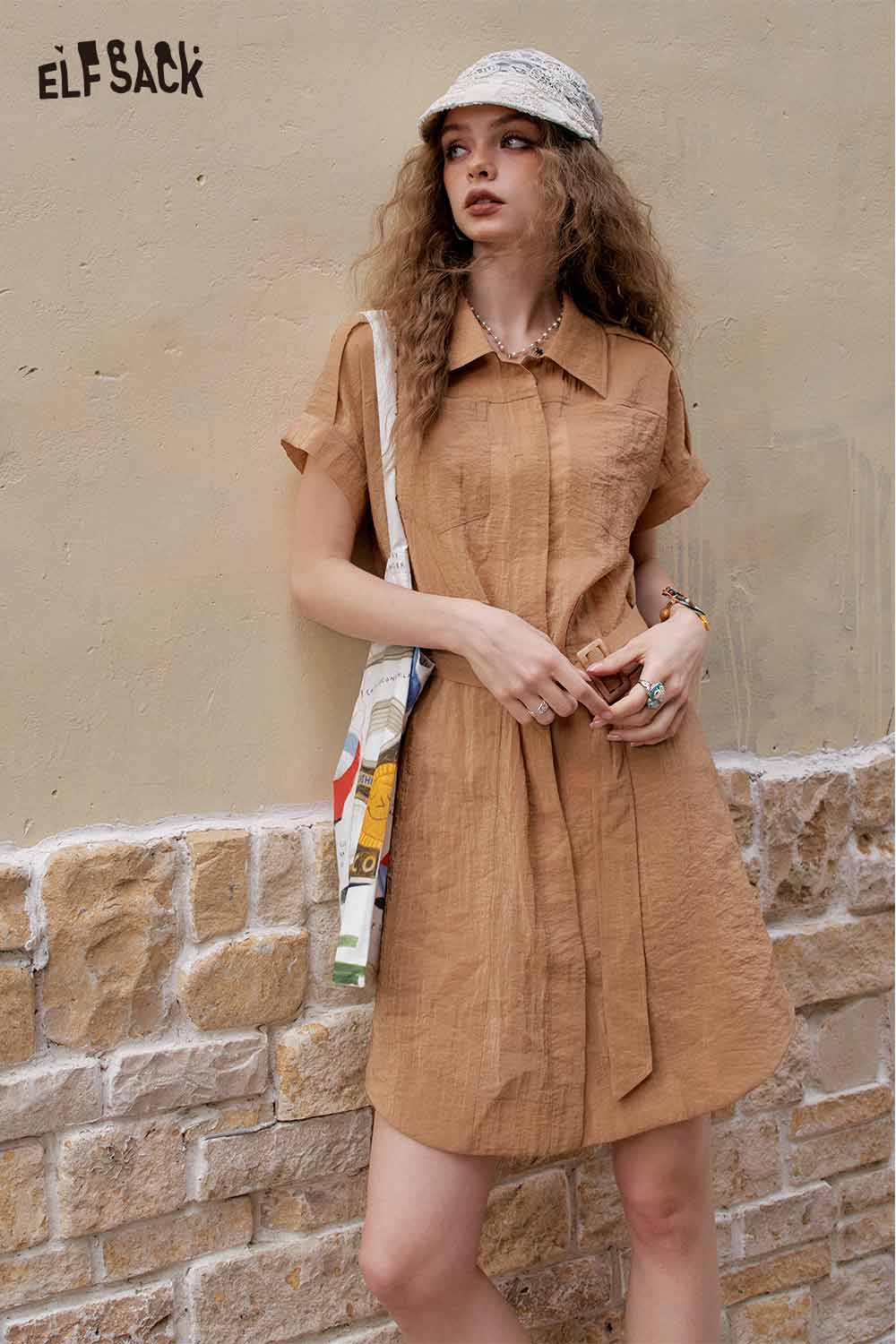 Cute Shirt Collar Short Sleeve Solid Utility Dress