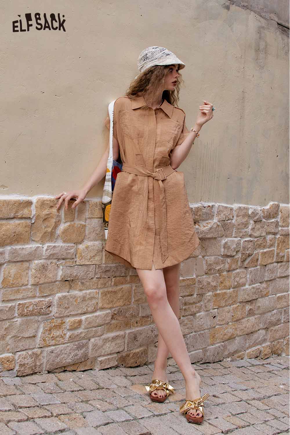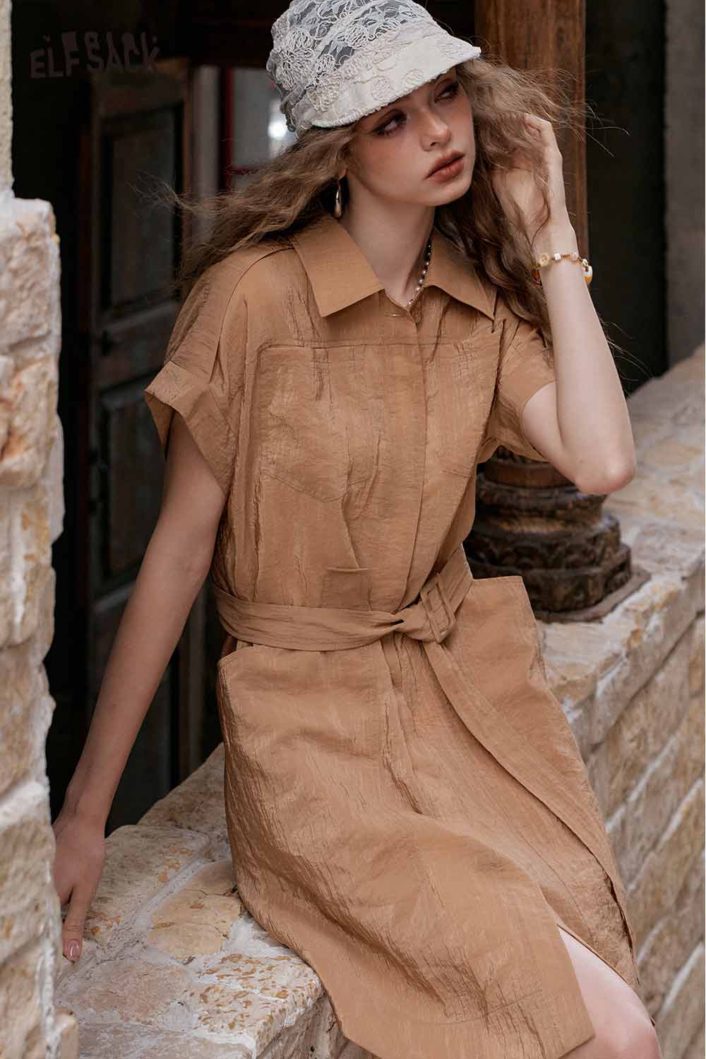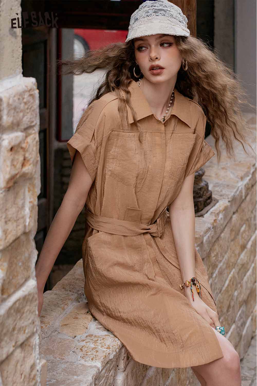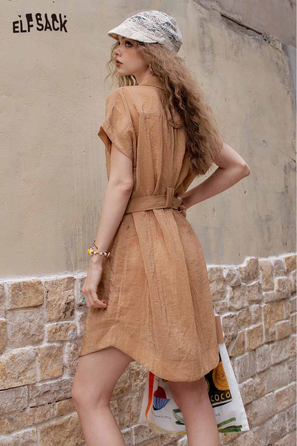 Cute Shirt Collar Short Sleeve Solid Utility Dress