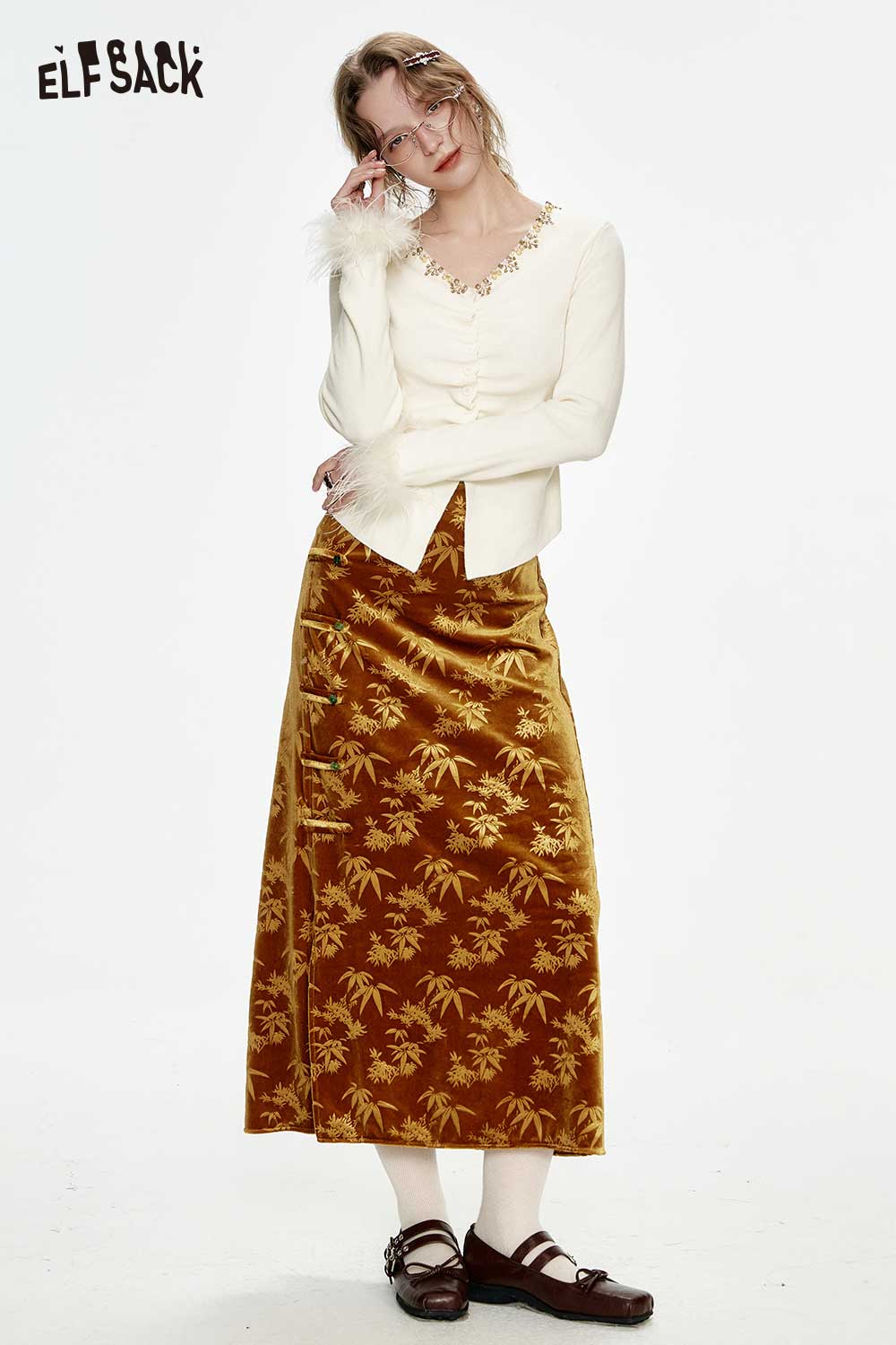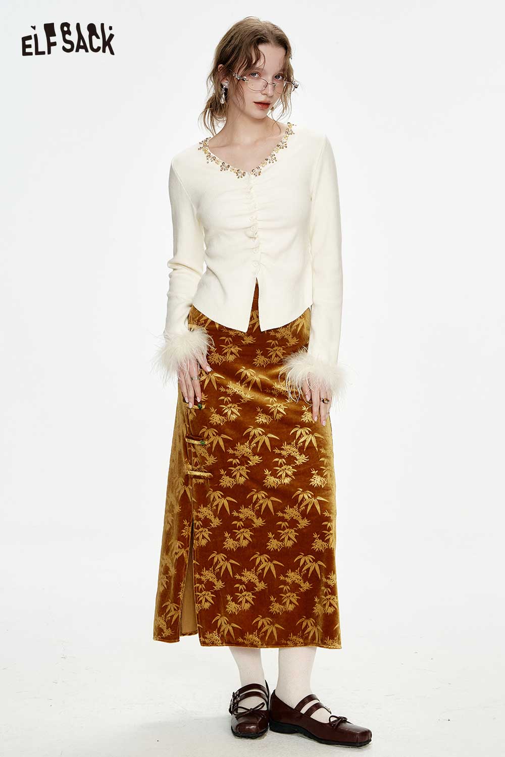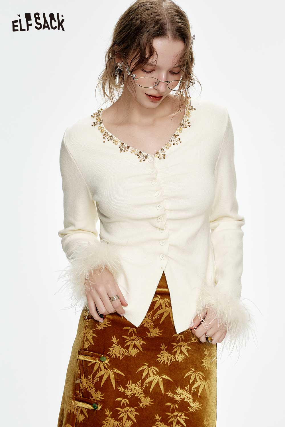 Heavy Beaded V Neck Pleated Knit Slim Fit Base Layer