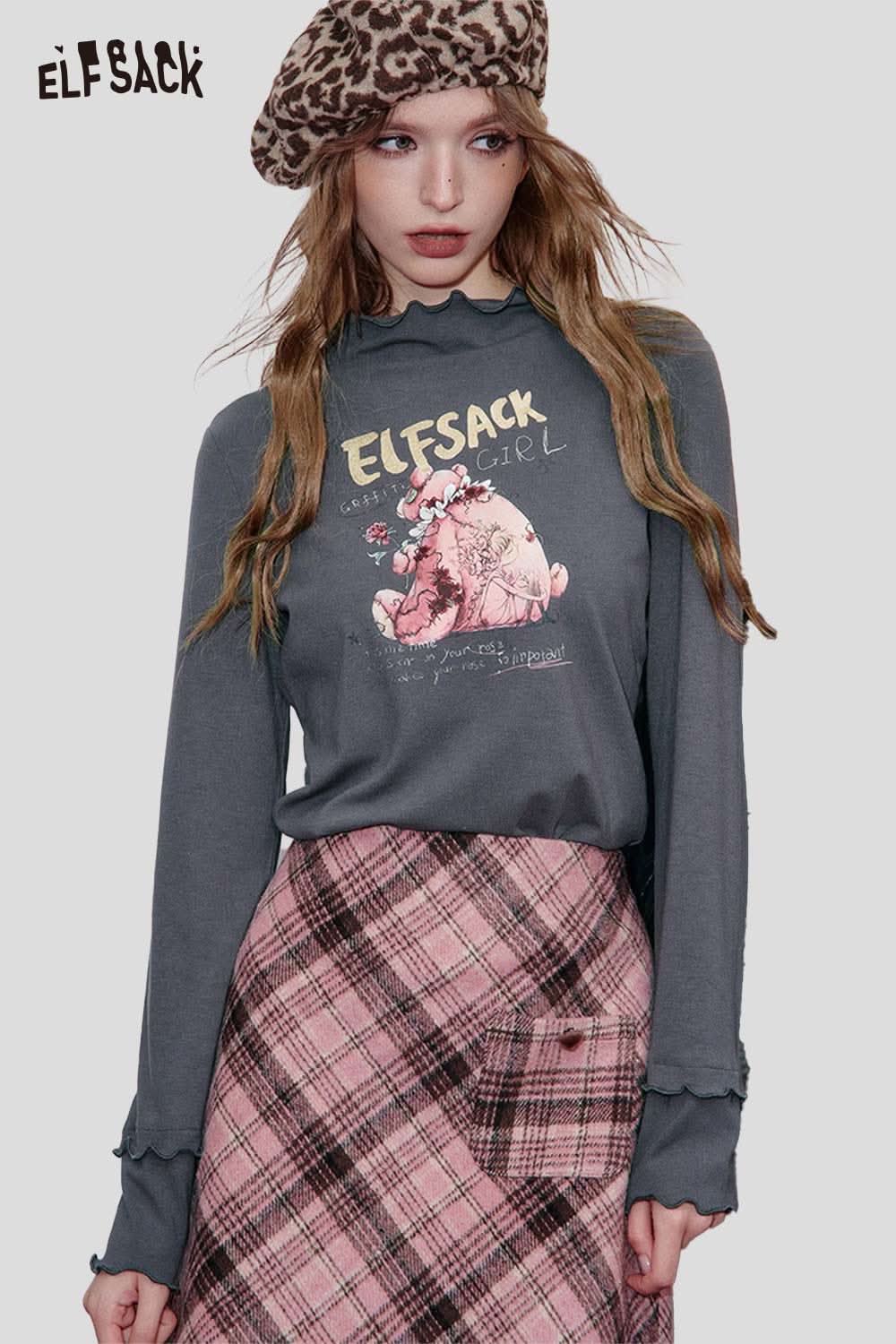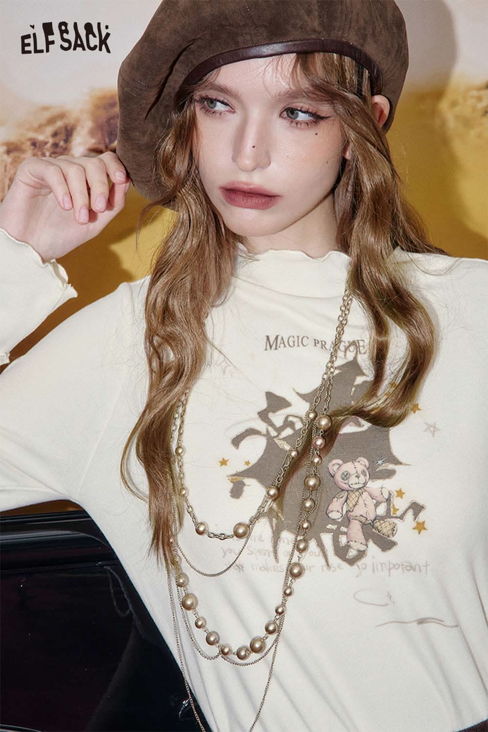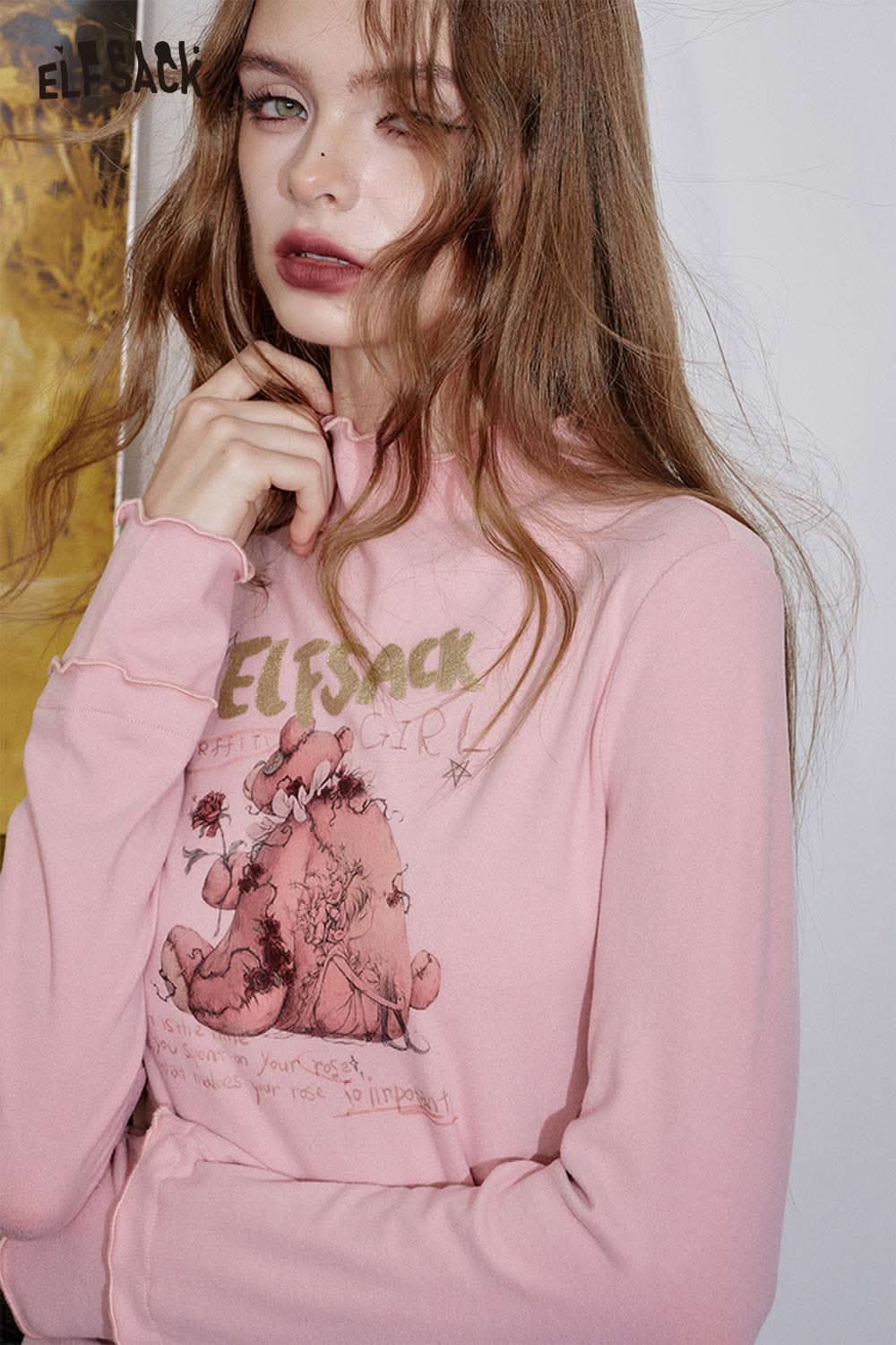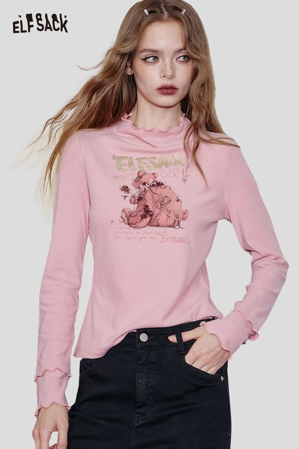 Soft Cartoon Graphic Ruffle Trim Neckline Long Sleeve Top