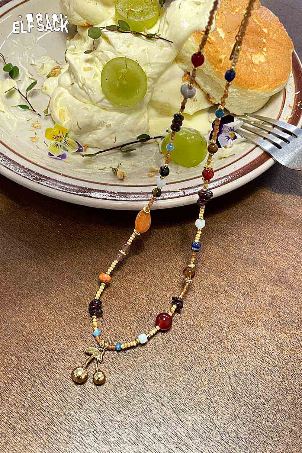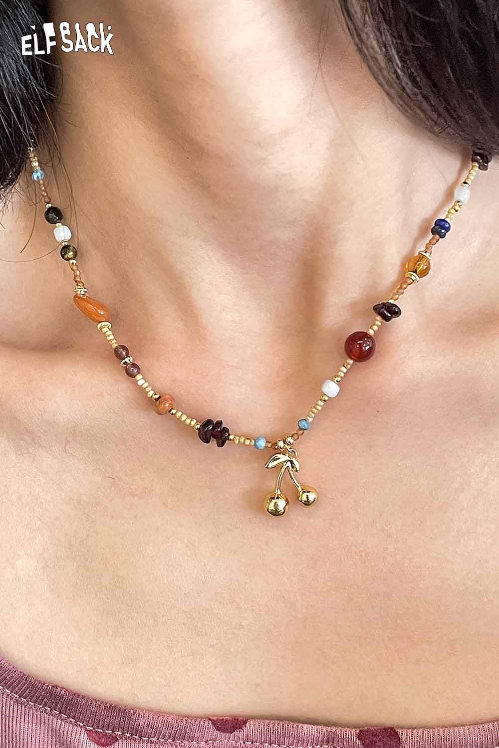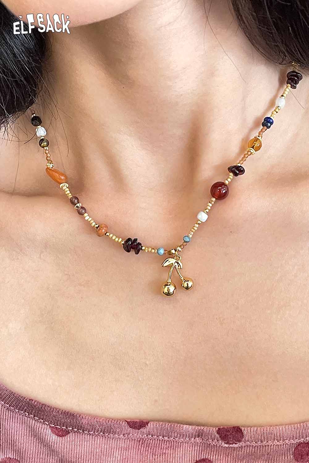 Handstrung Natural Stone Beads Bohemian Cherry Charm Statement Necklace
