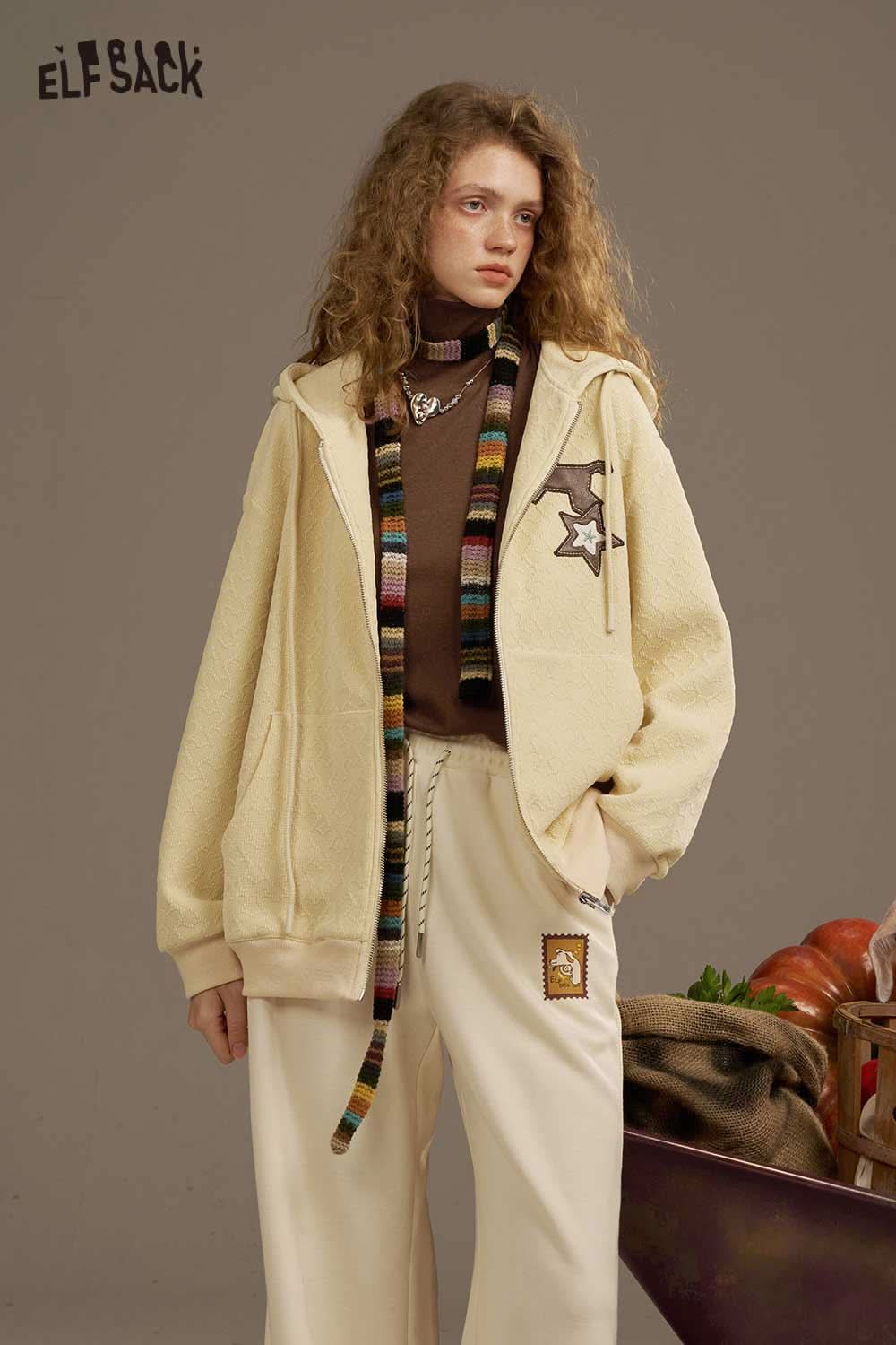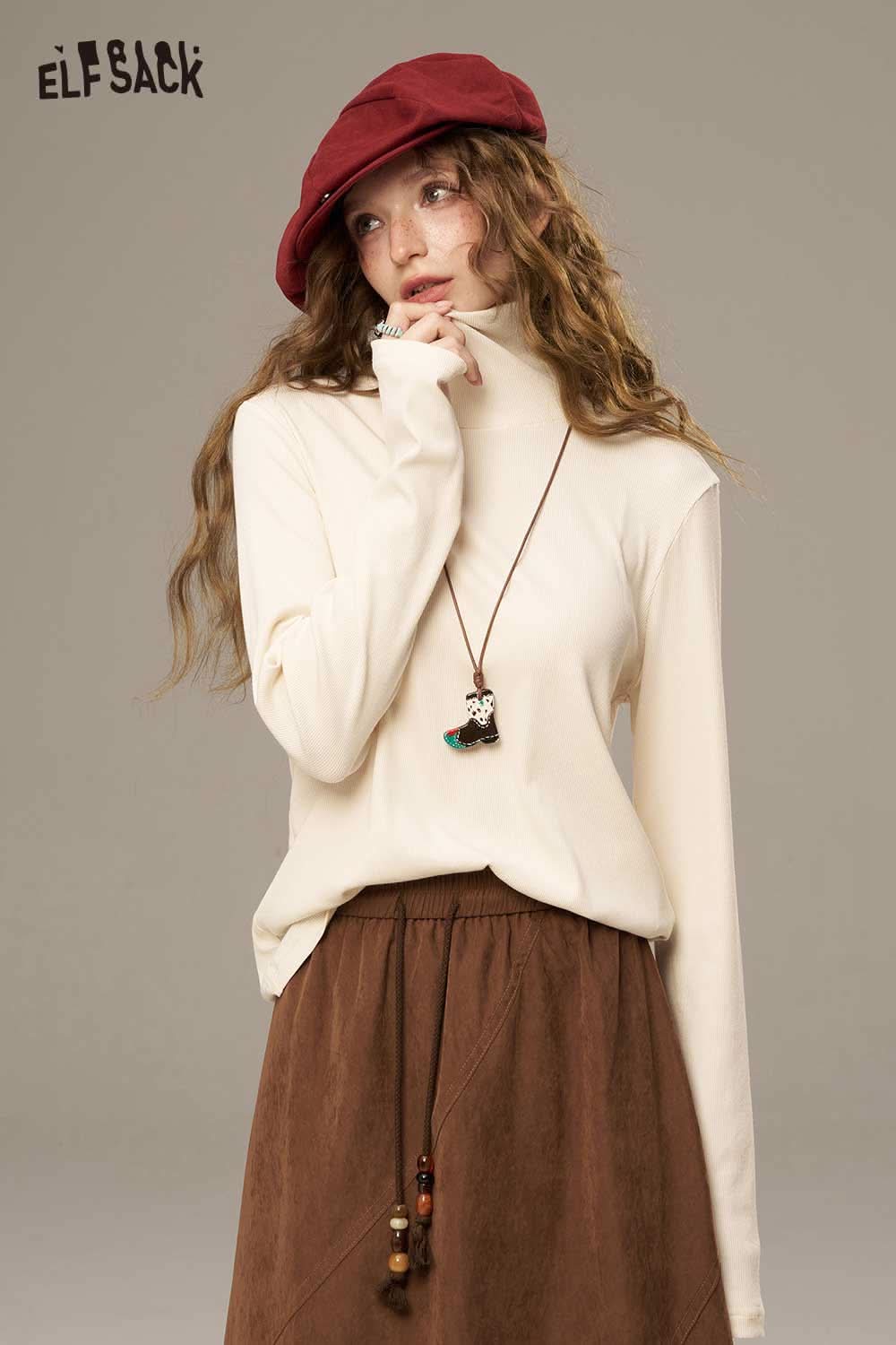 ELFSACK women's cozy turtleneck sweater in cream color with long sleeves and stylish accessories