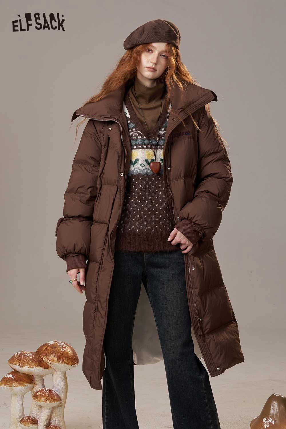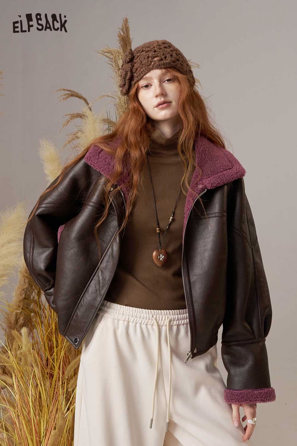 ELFSACK women's cozy turtleneck sweater layered under a brown hooded jacket with a stylish design