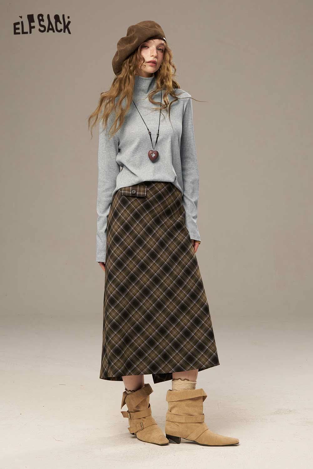 ELFSACK women's cozy turtleneck sweater in grey paired with a plaid skirt and accessories