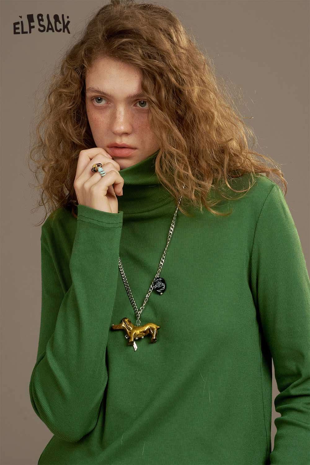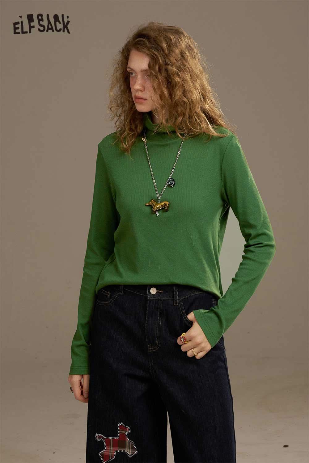 ELFSACK women's cozy turtleneck sweater in green paired with oversized brown pants for a stylish look
