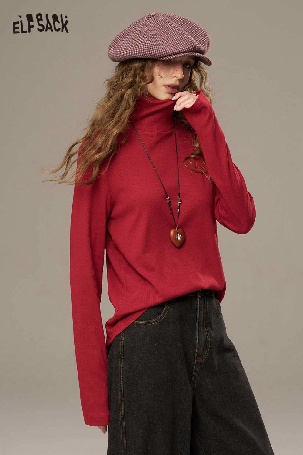 ELFSACK women's cozy turtleneck sweater in red, styled with a stylish beret and relaxed jeans