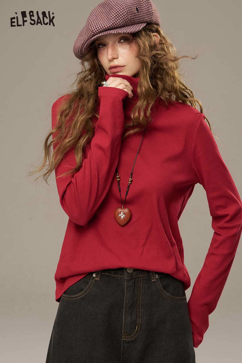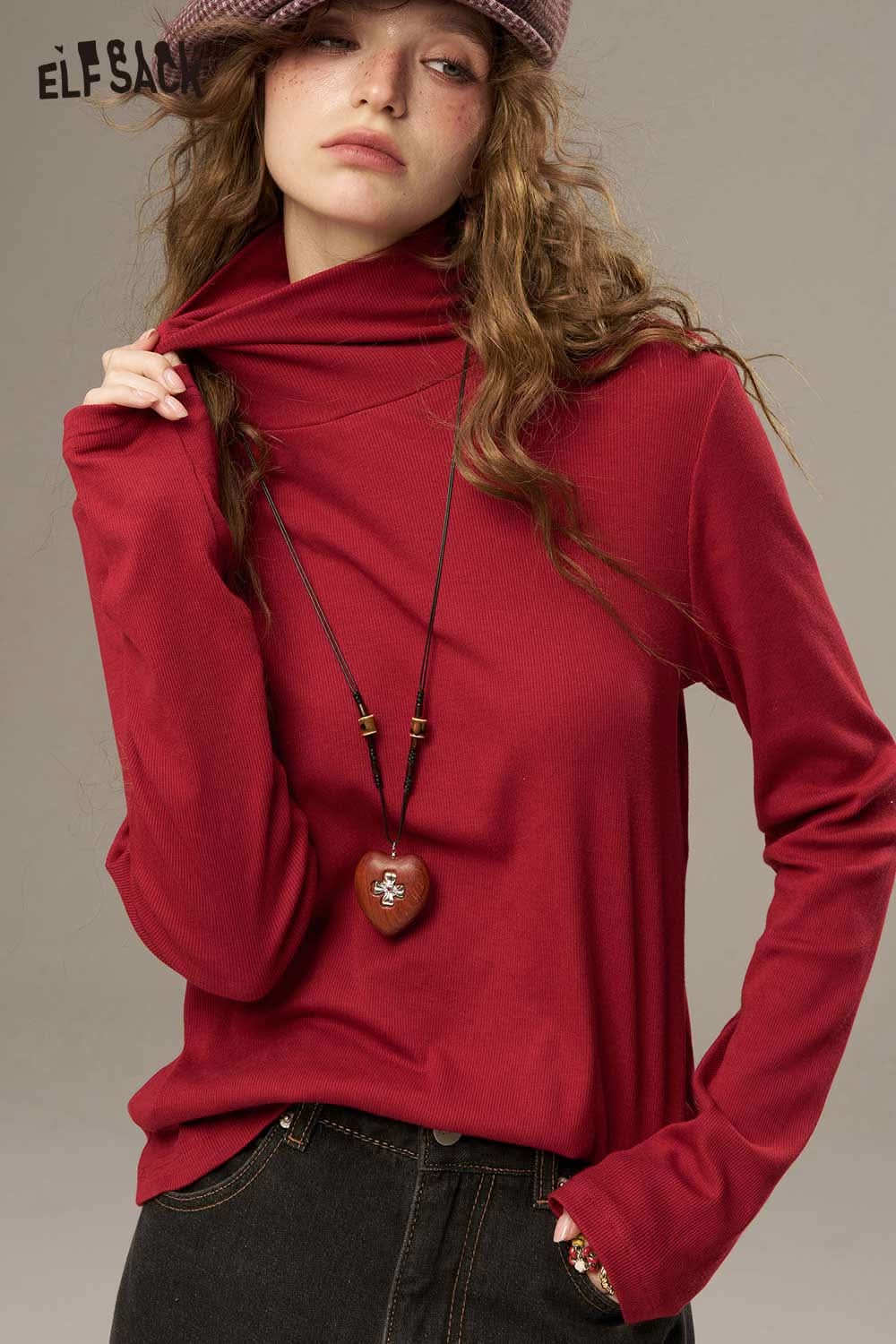 ELFSACK women's cozy turtleneck sweater in red, designed for stylish warmth and comfort