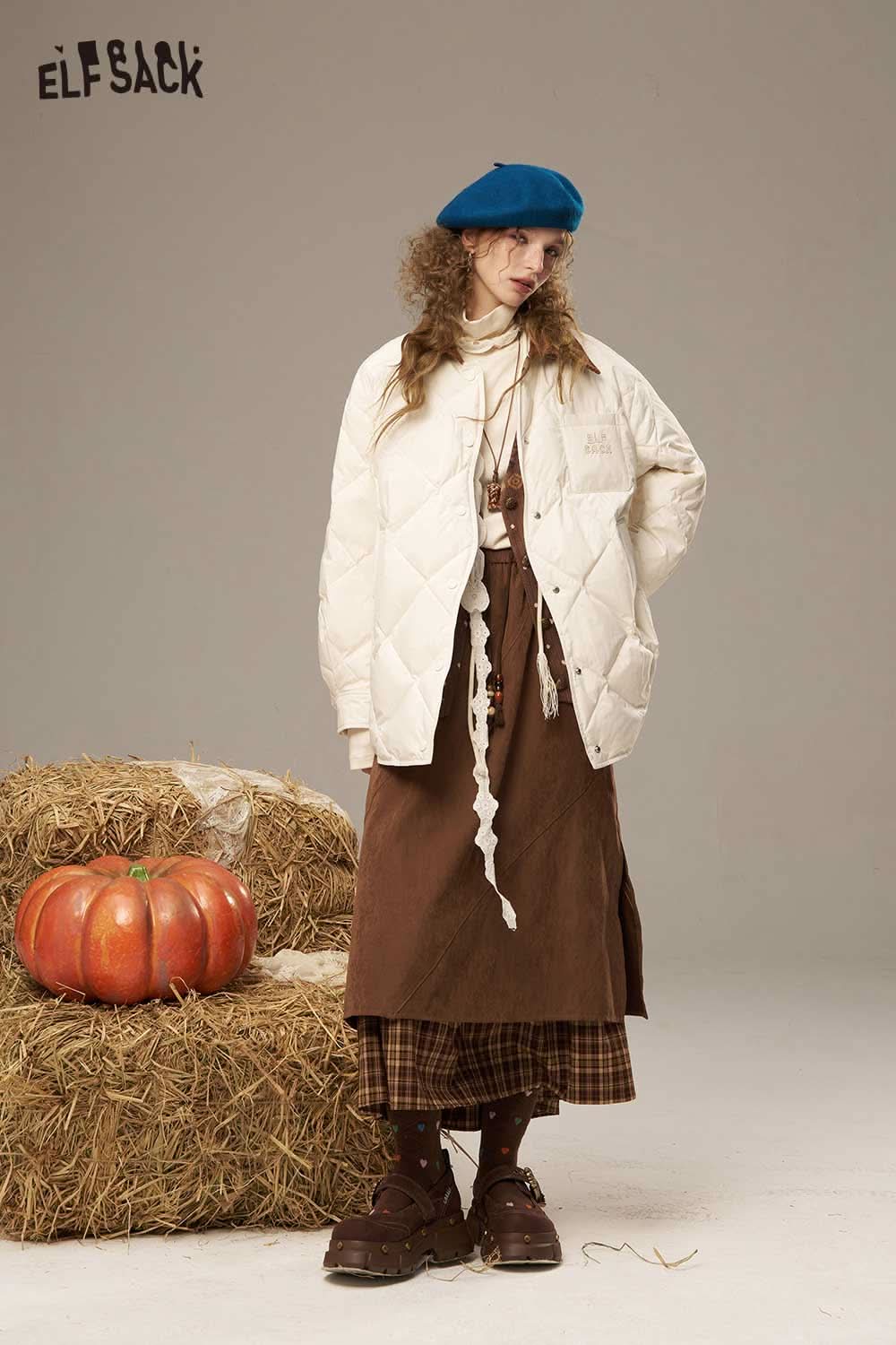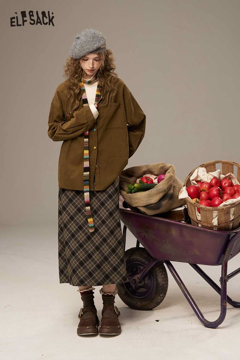 Model wearing ELFSACK women's cozy turtleneck sweater paired with a brown skirt for a stylish autumn look