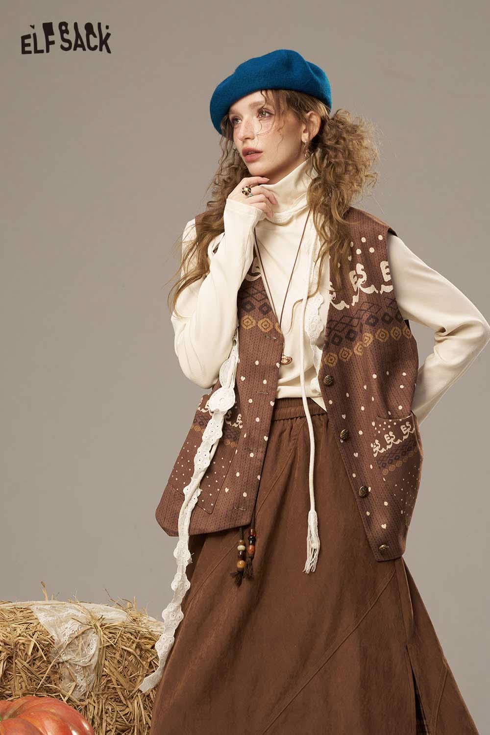 ELFSACK women's cozy turtleneck sweater styled with a patterned skirt and stylish accessories