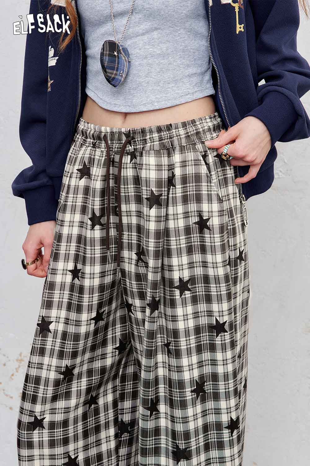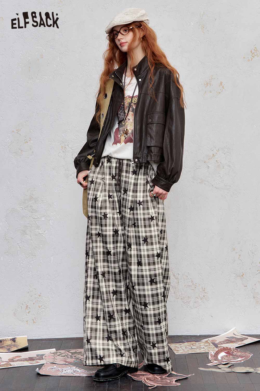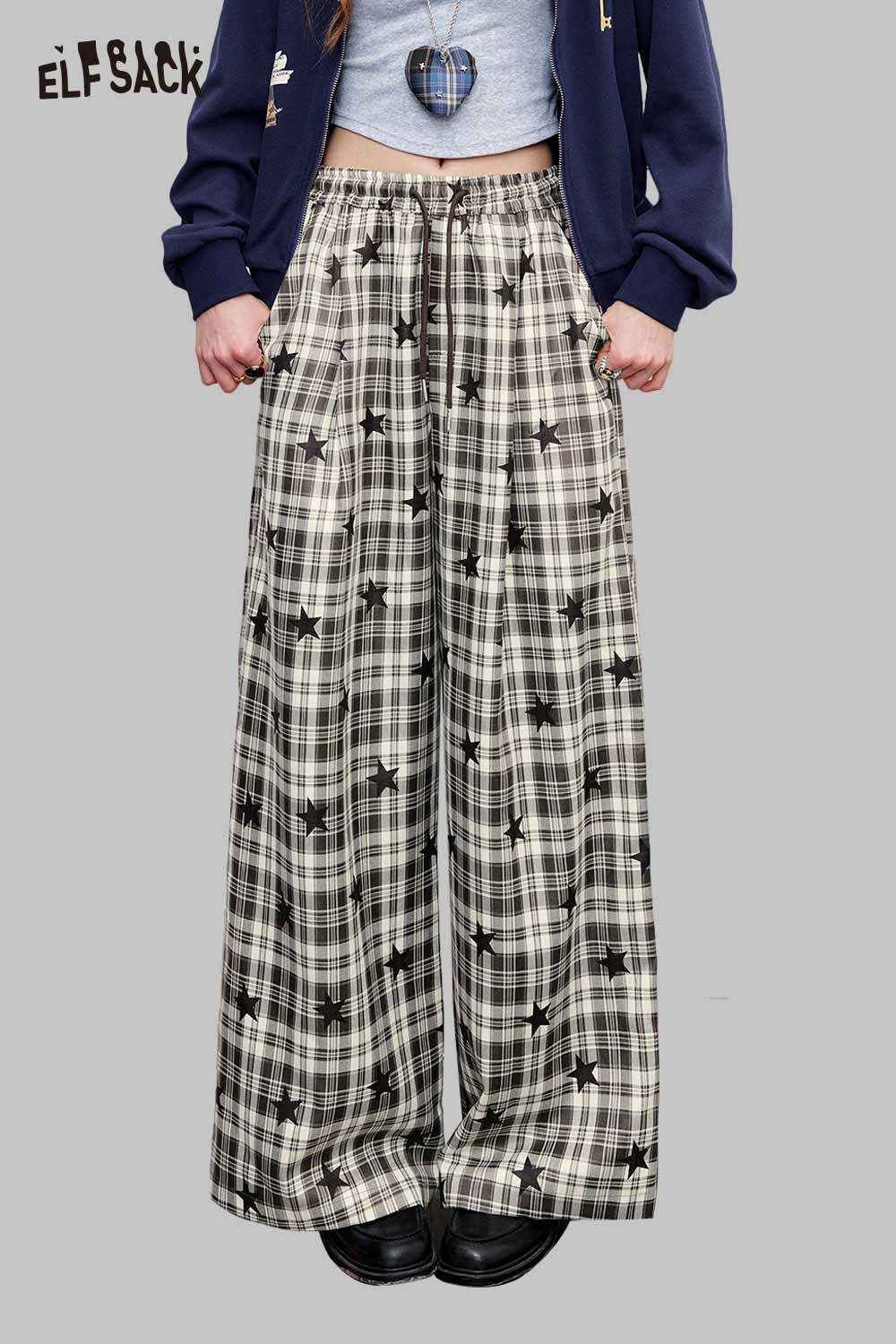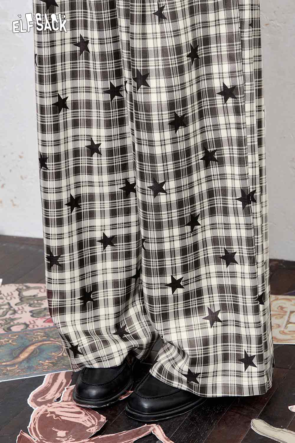 Light Wide-Leg Checkered Graphic Casual Long Pants