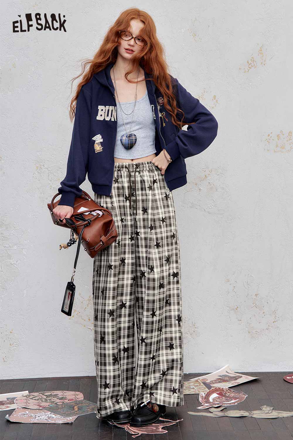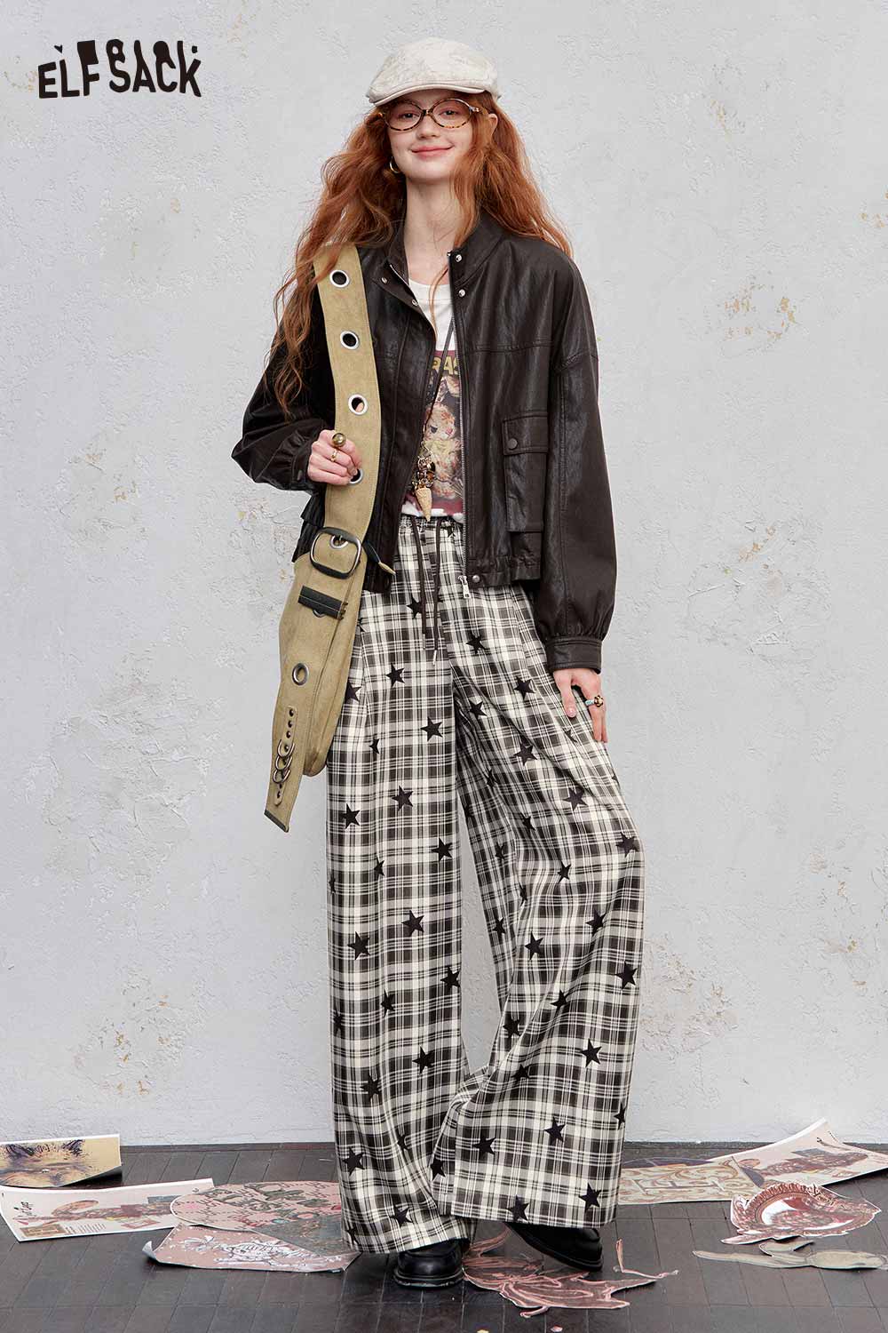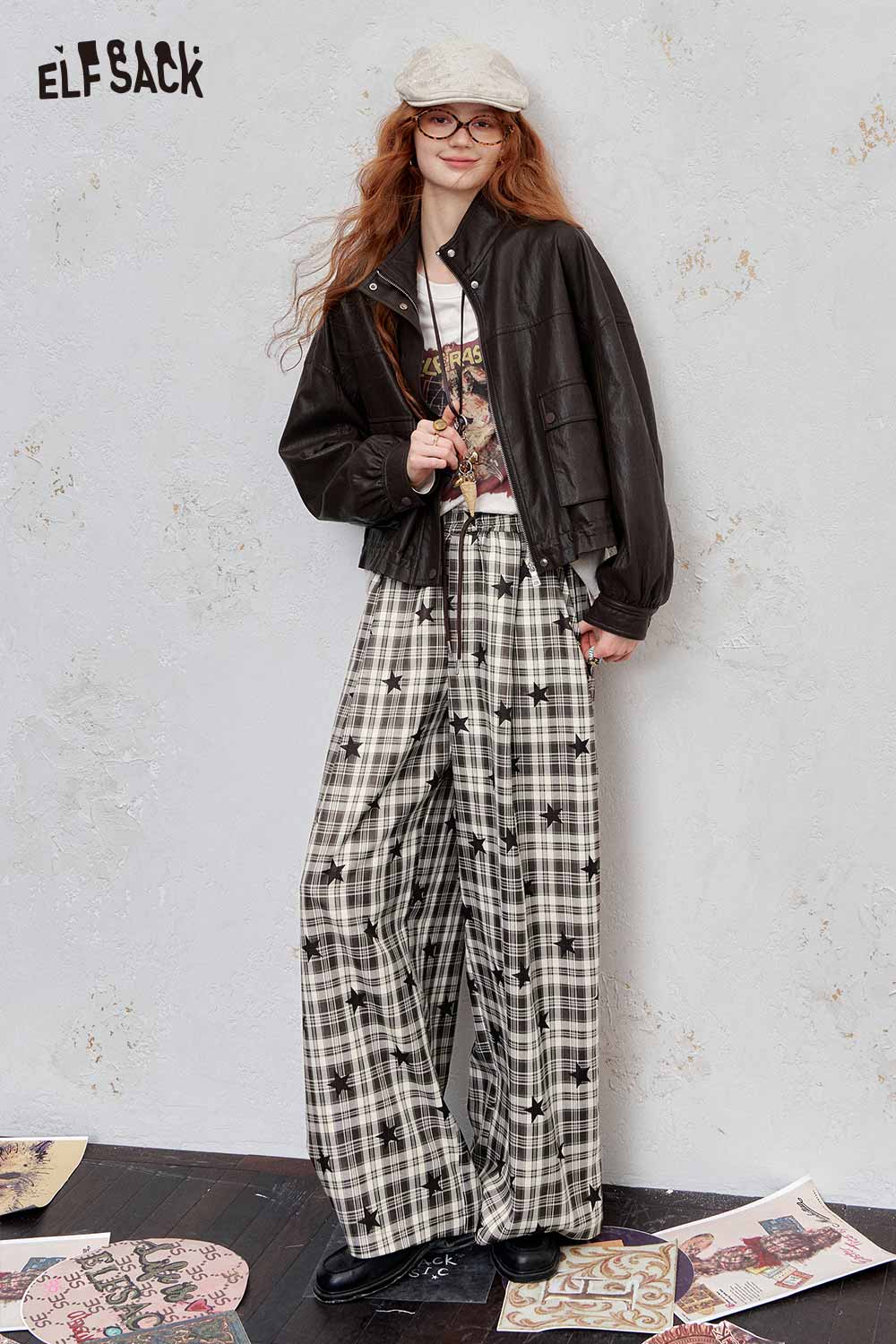 Light Wide-Leg Checkered Graphic Casual Long Pants