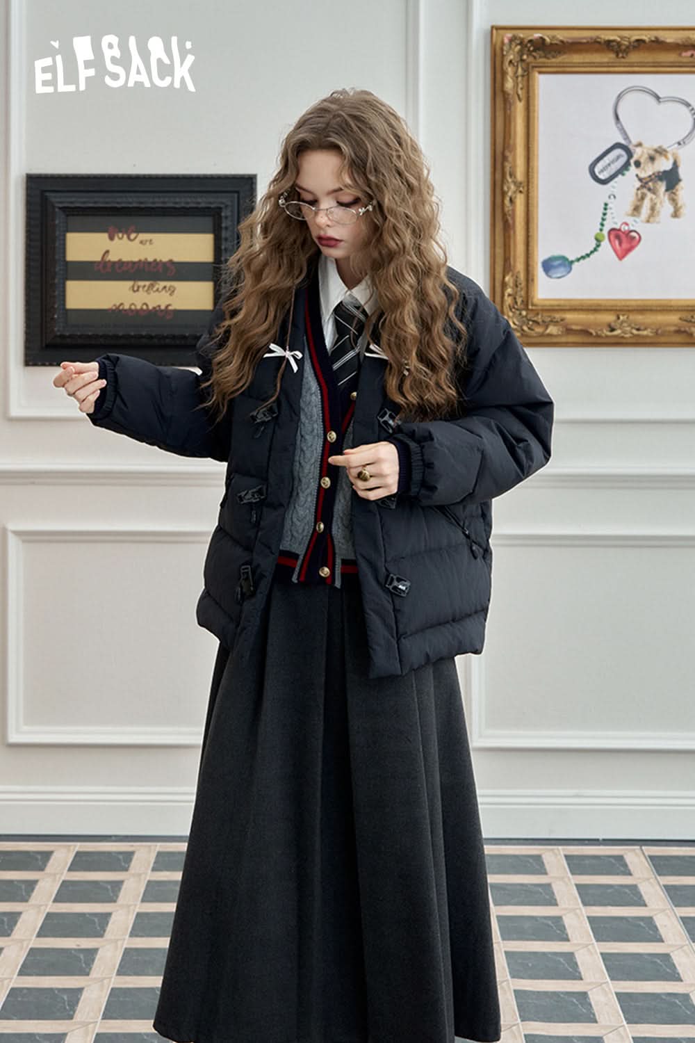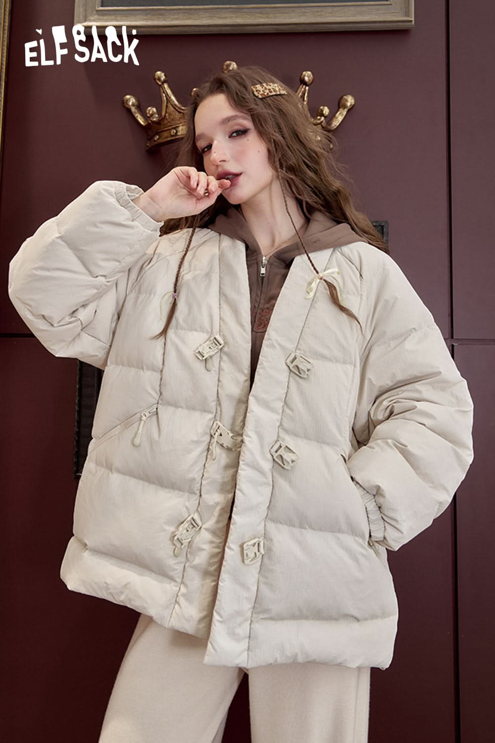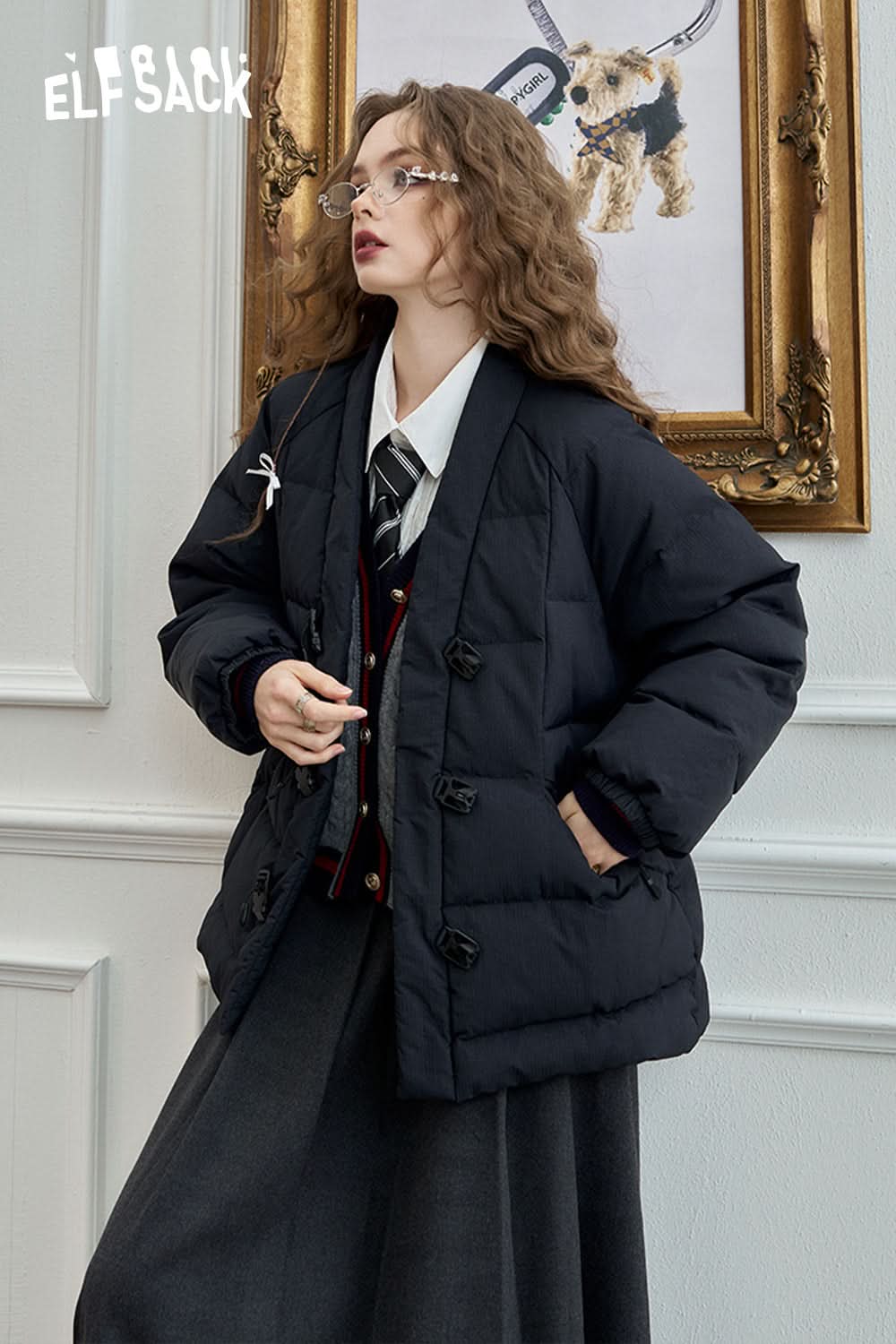 ELFSACK Neo-Chinese style v-neck silhouette down jacket glitter jacquard fabric short warm coat