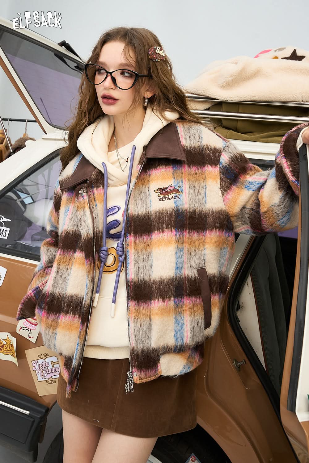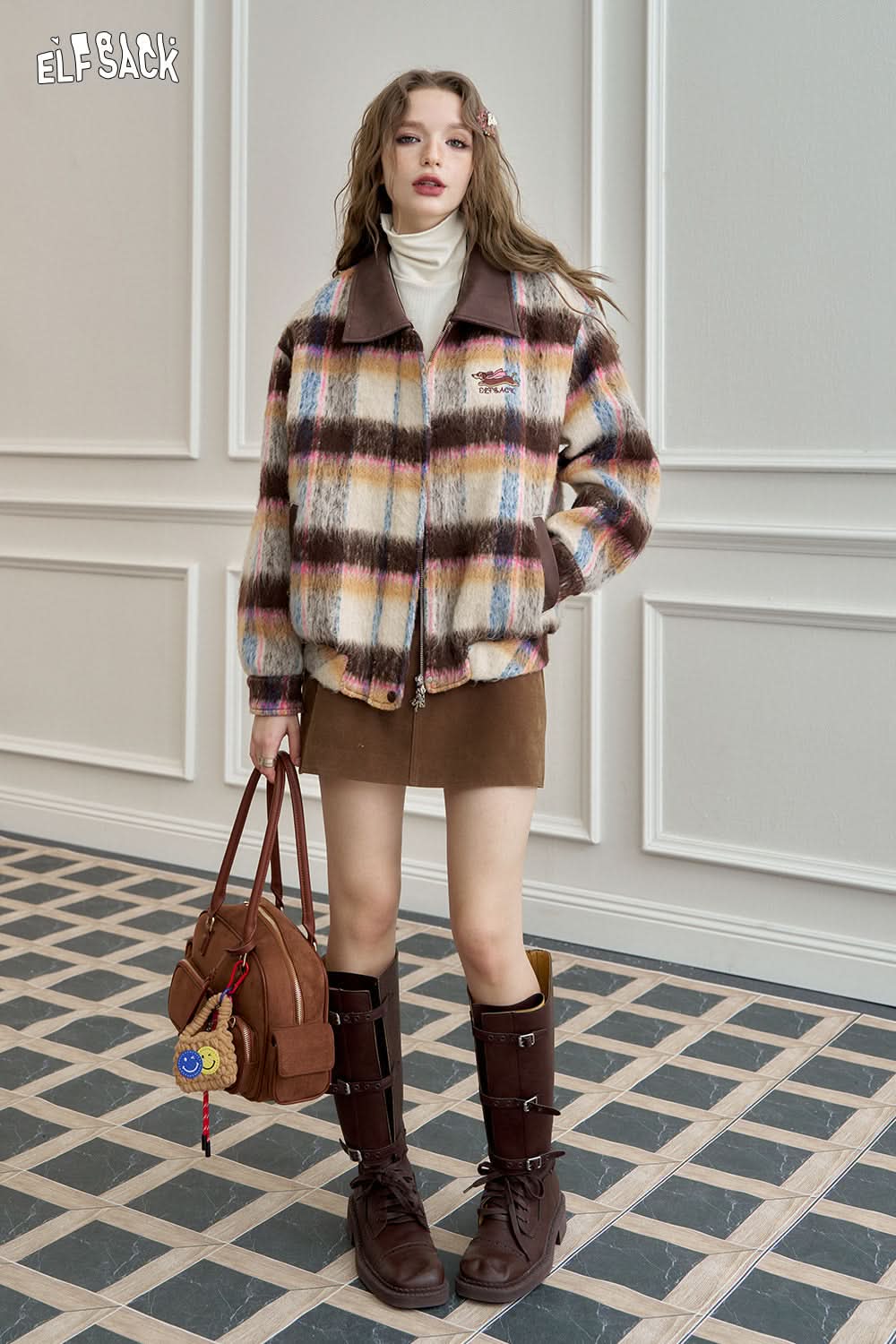 Retro plaid PU patchwork plush jacket, Preppy Style jacket