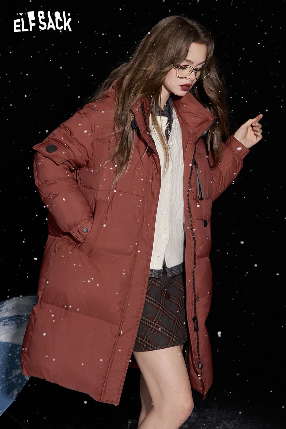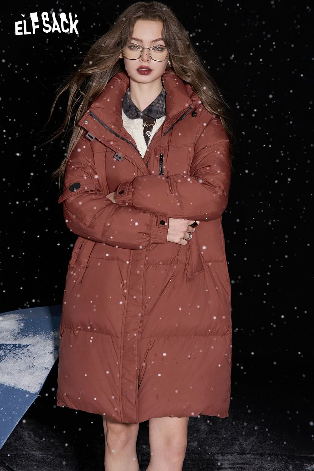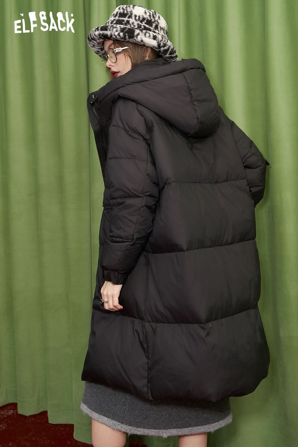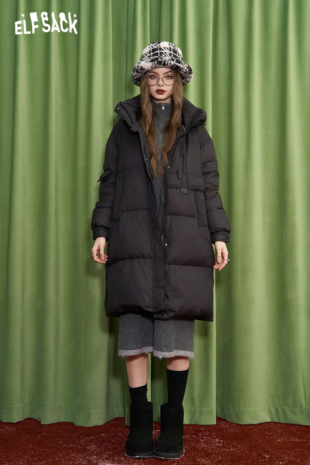 ELFSACK Retro simple mid-length hooded down jacket warm and thick