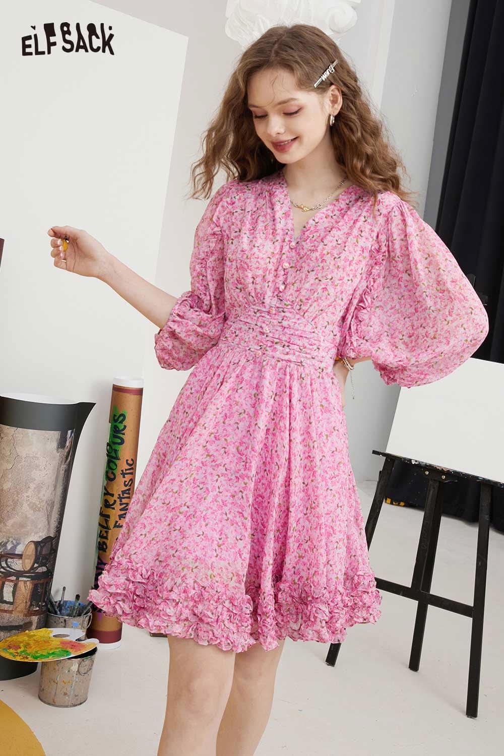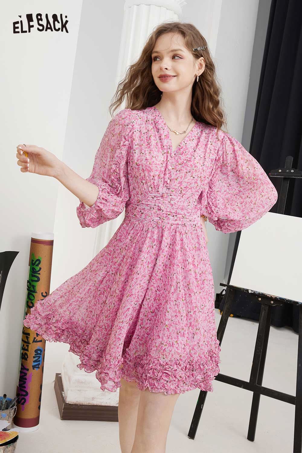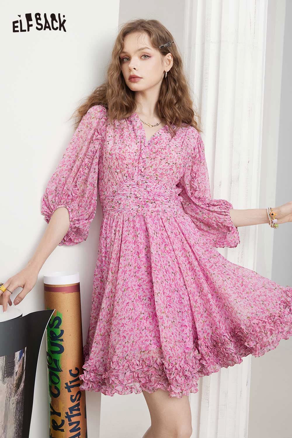 Soft Floral V Neck Puff Sleeve Waist A-Line Dress