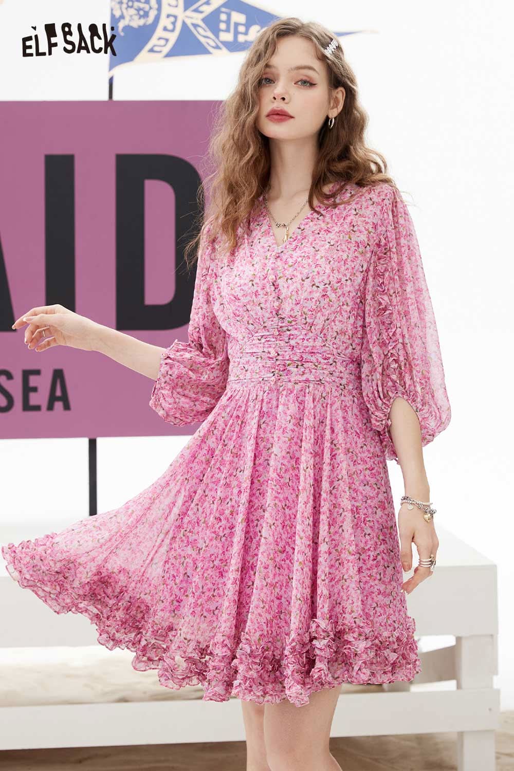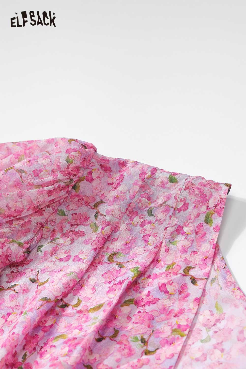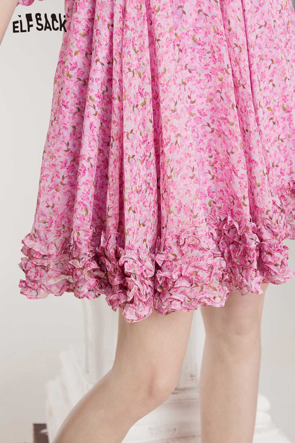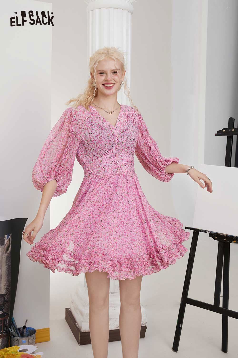 Soft Floral V Neck Puff Sleeve Waist A-Line Dress