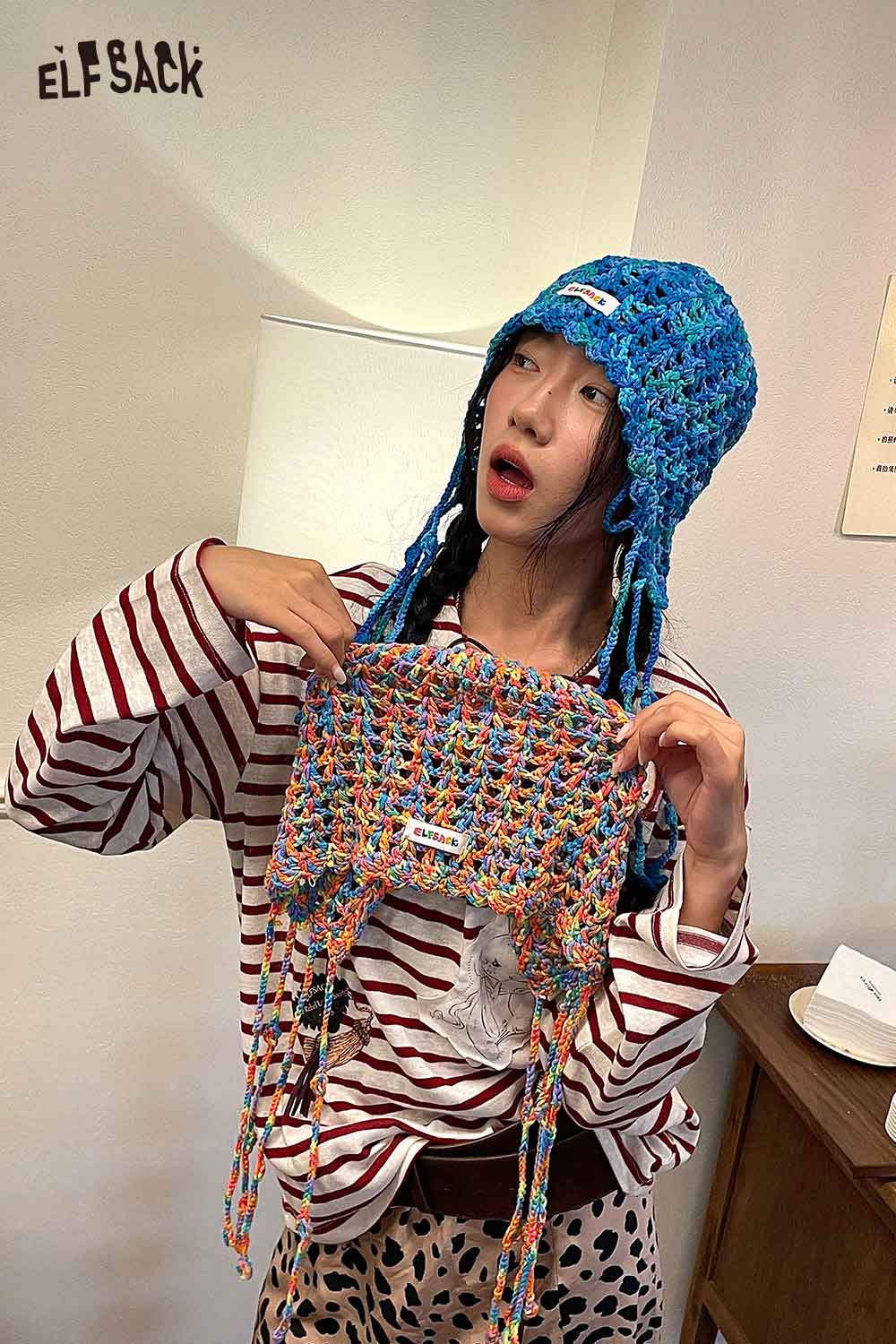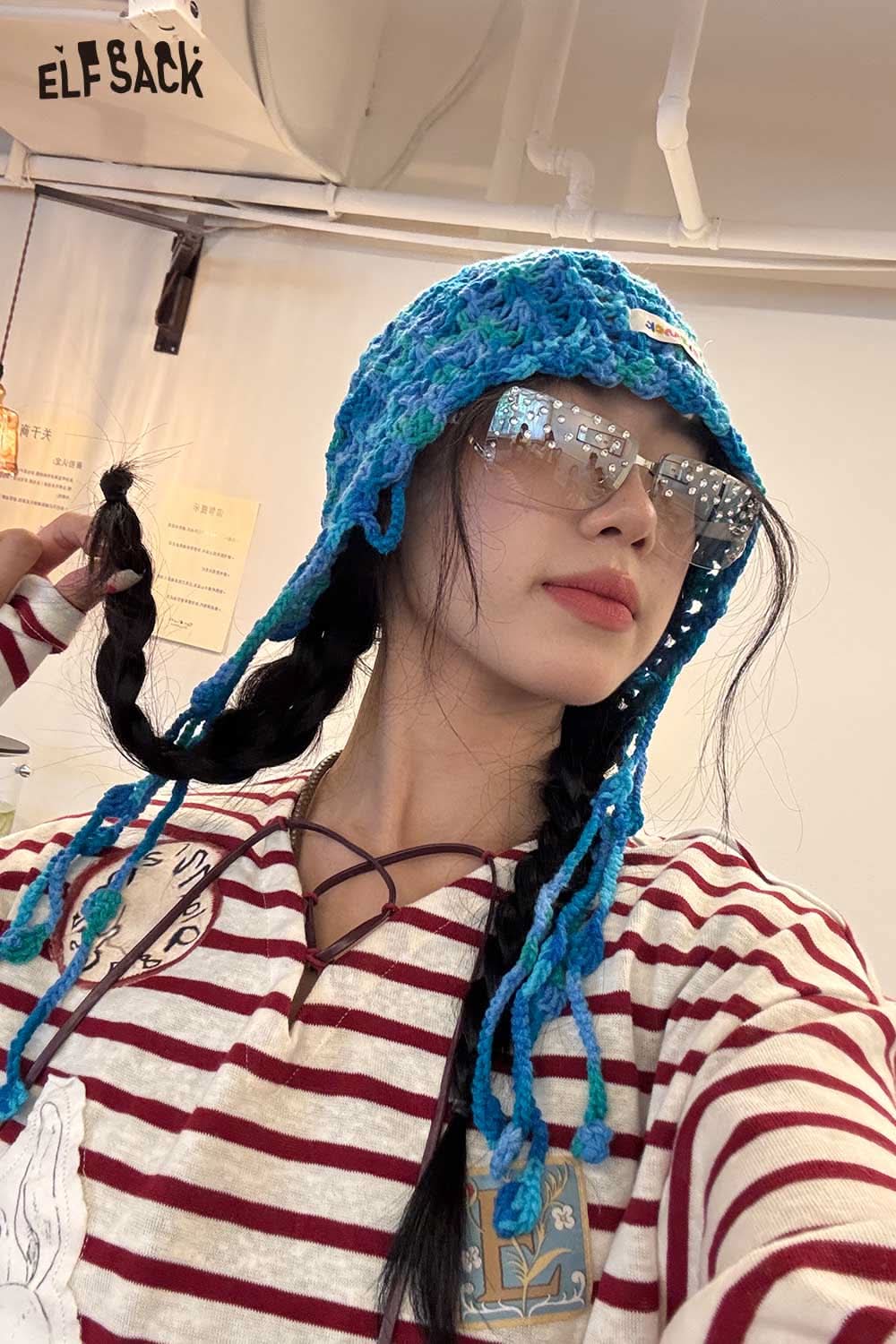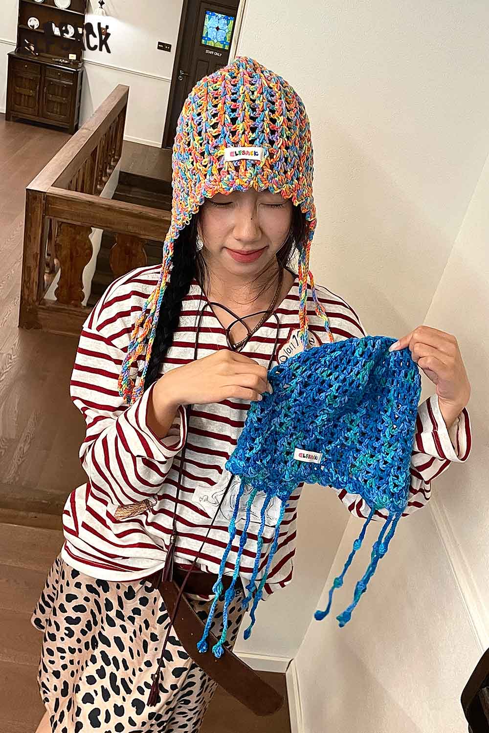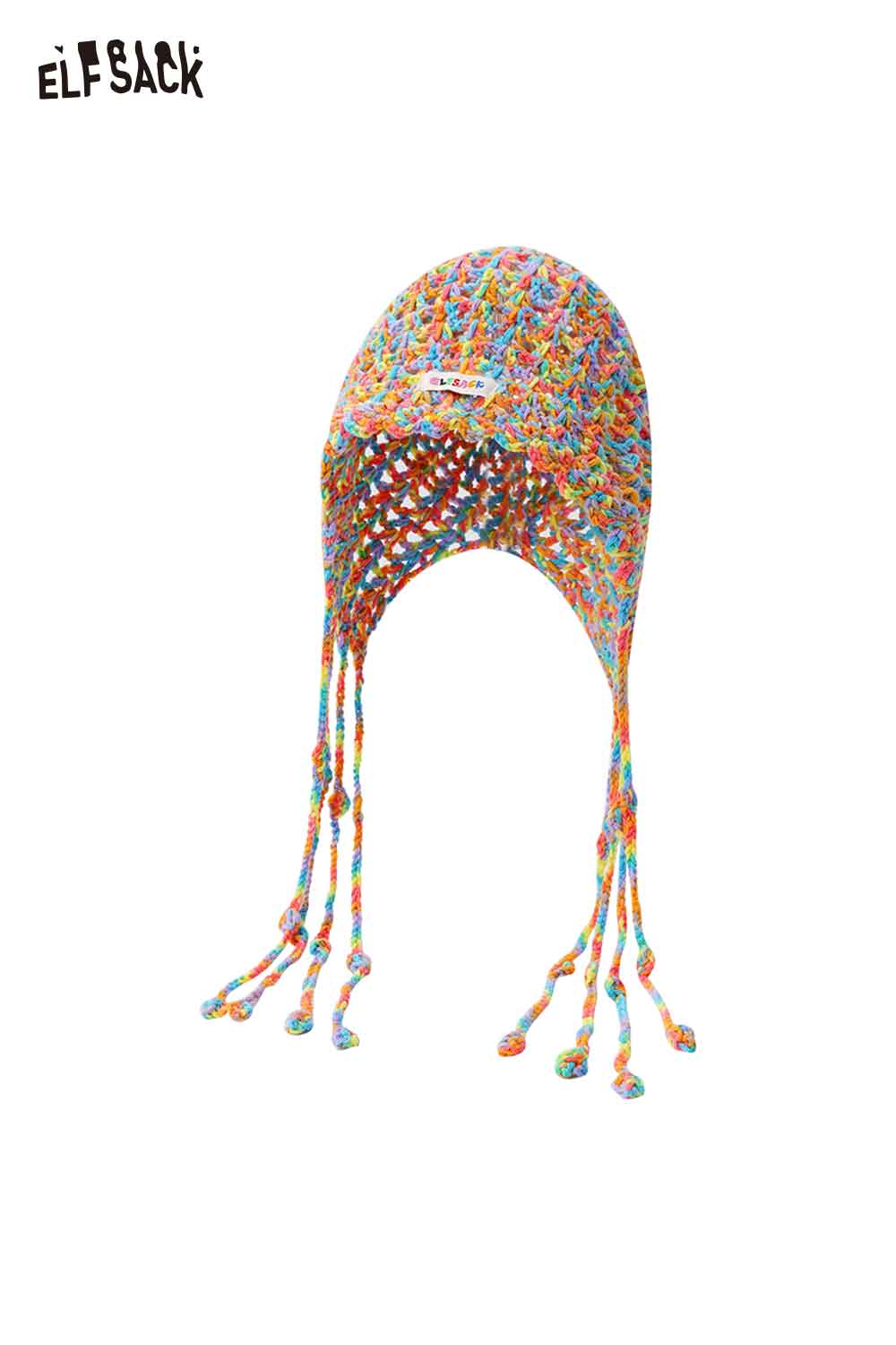 Cotton Blend Slouchy Colorful Tassel Braid Crochet Beanie