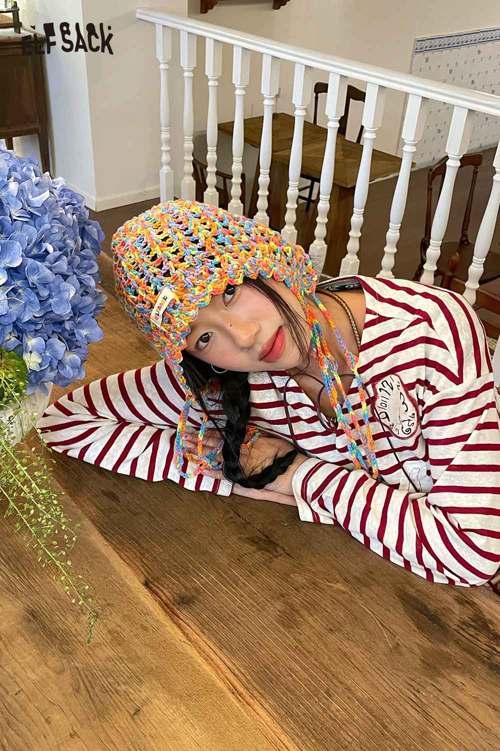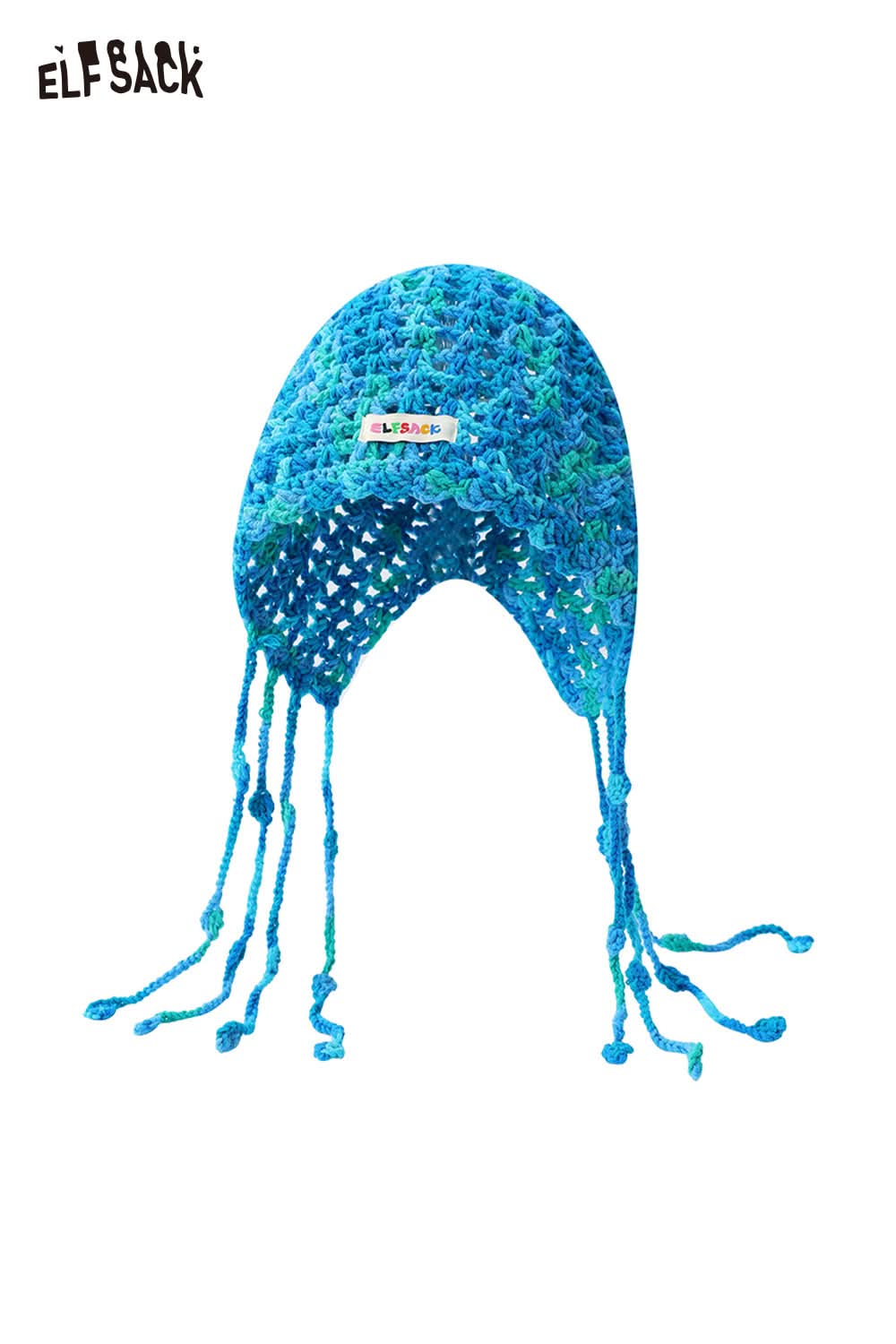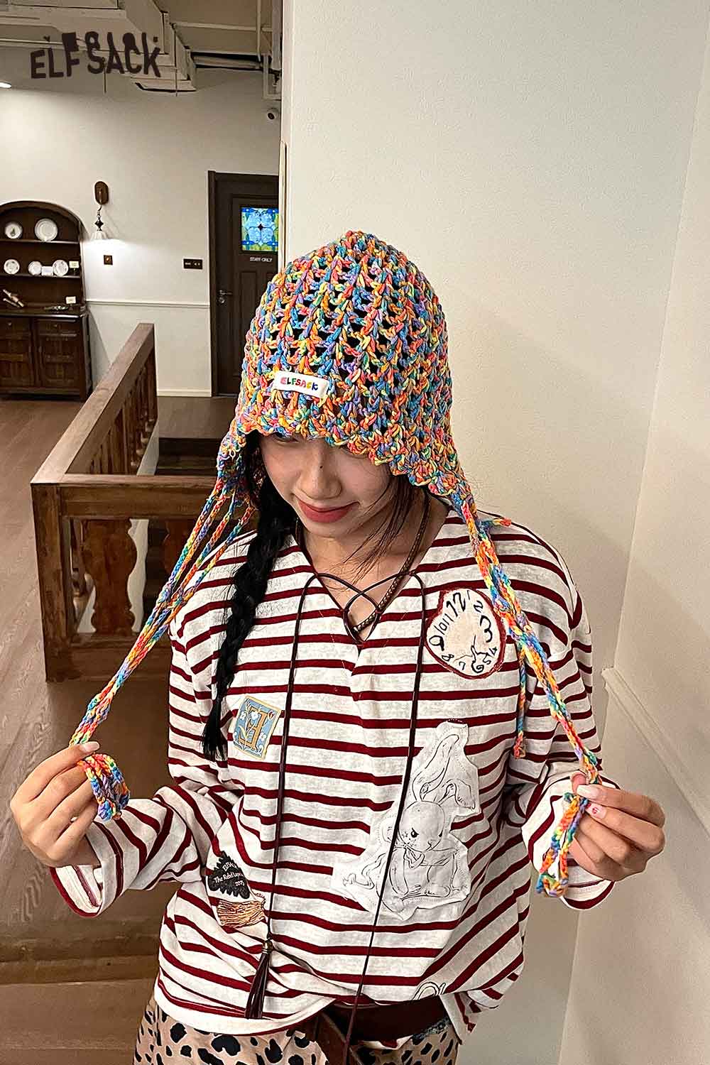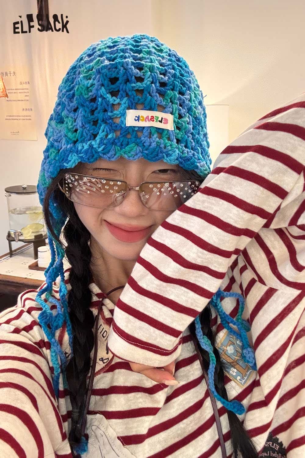 Cotton Blend Slouchy Colorful Tassel Braid Crochet Beanie