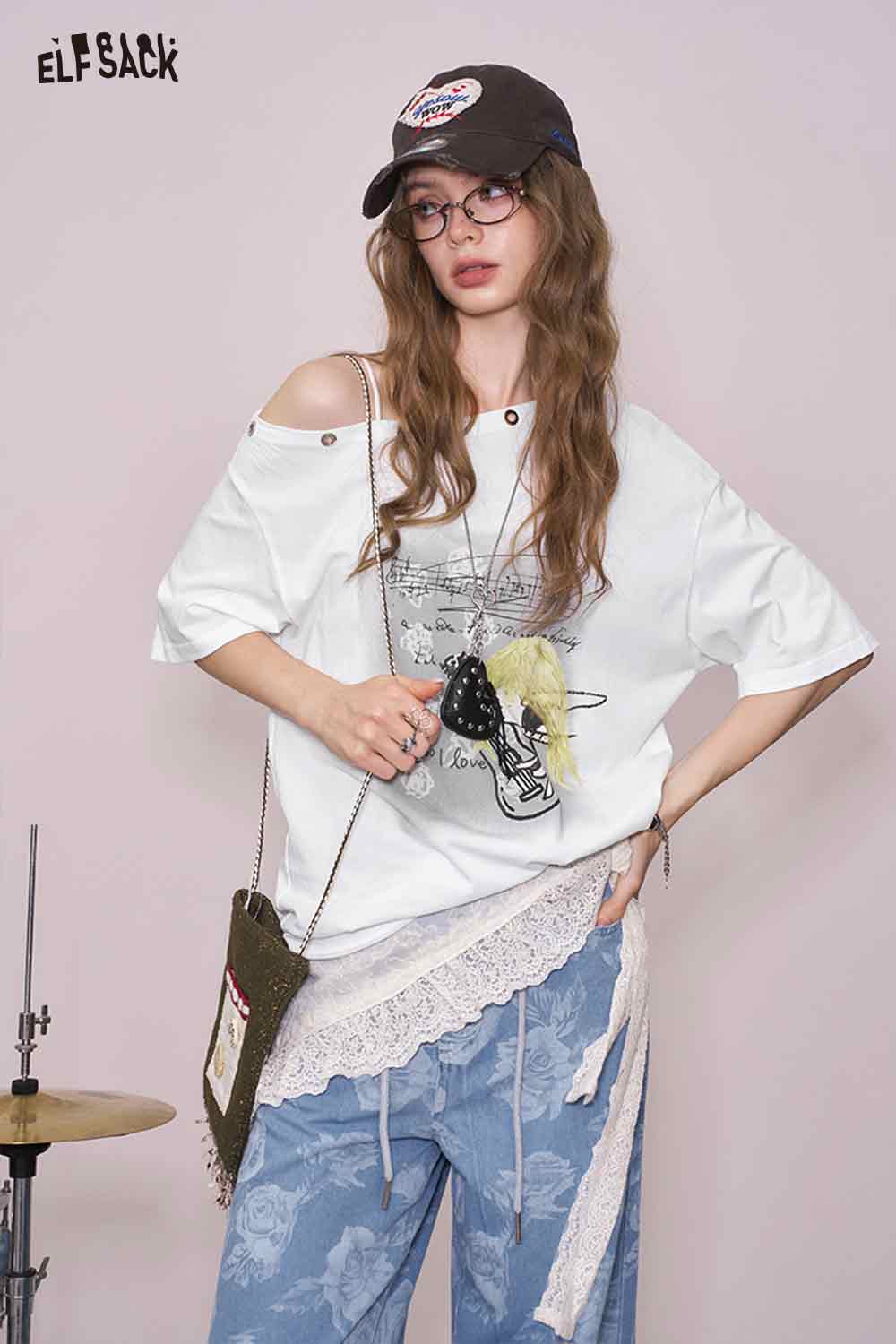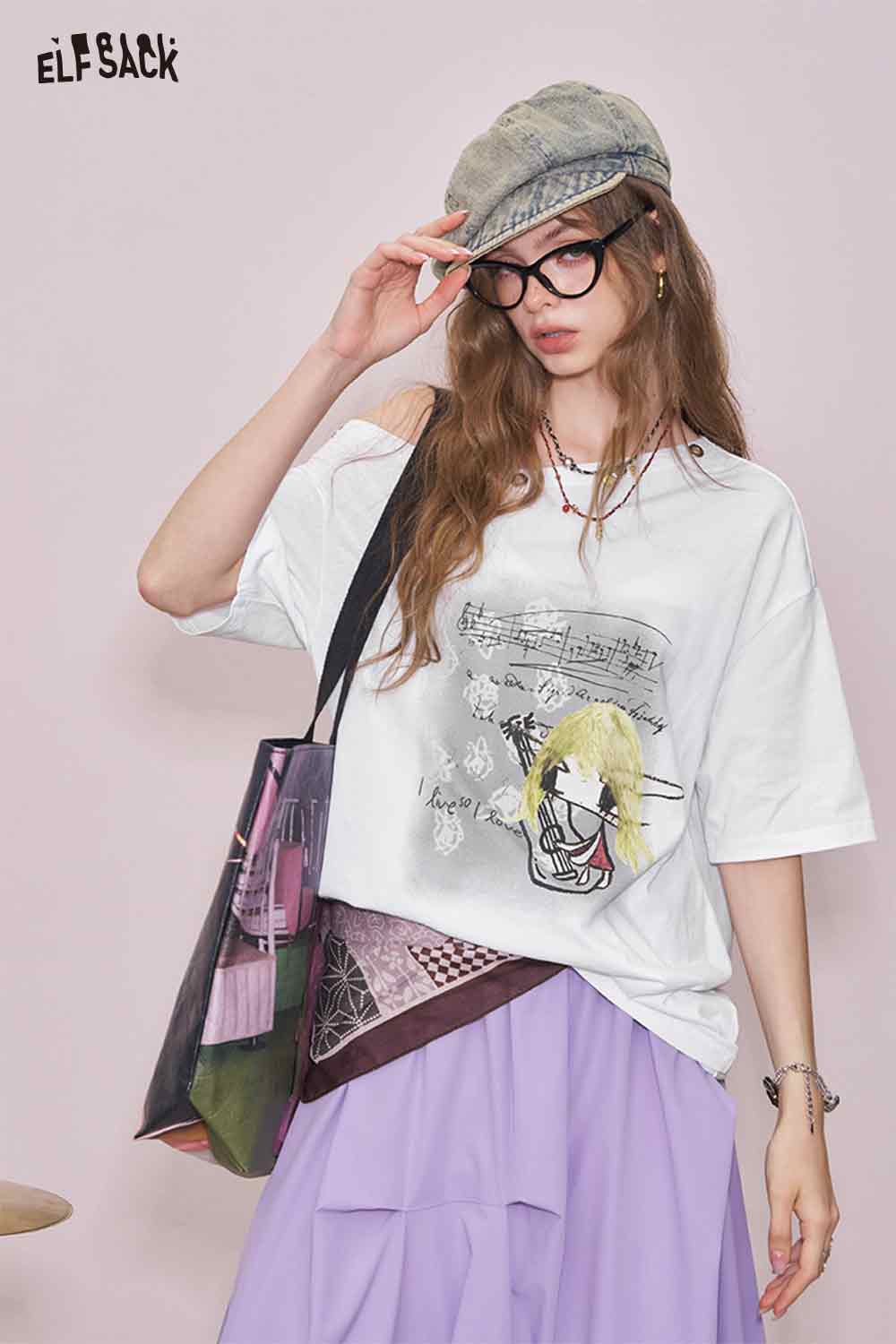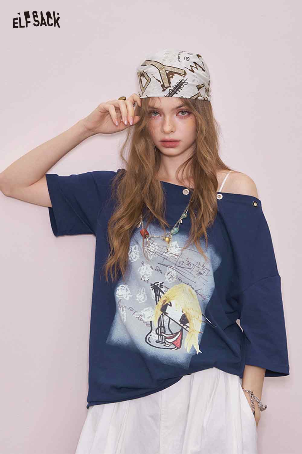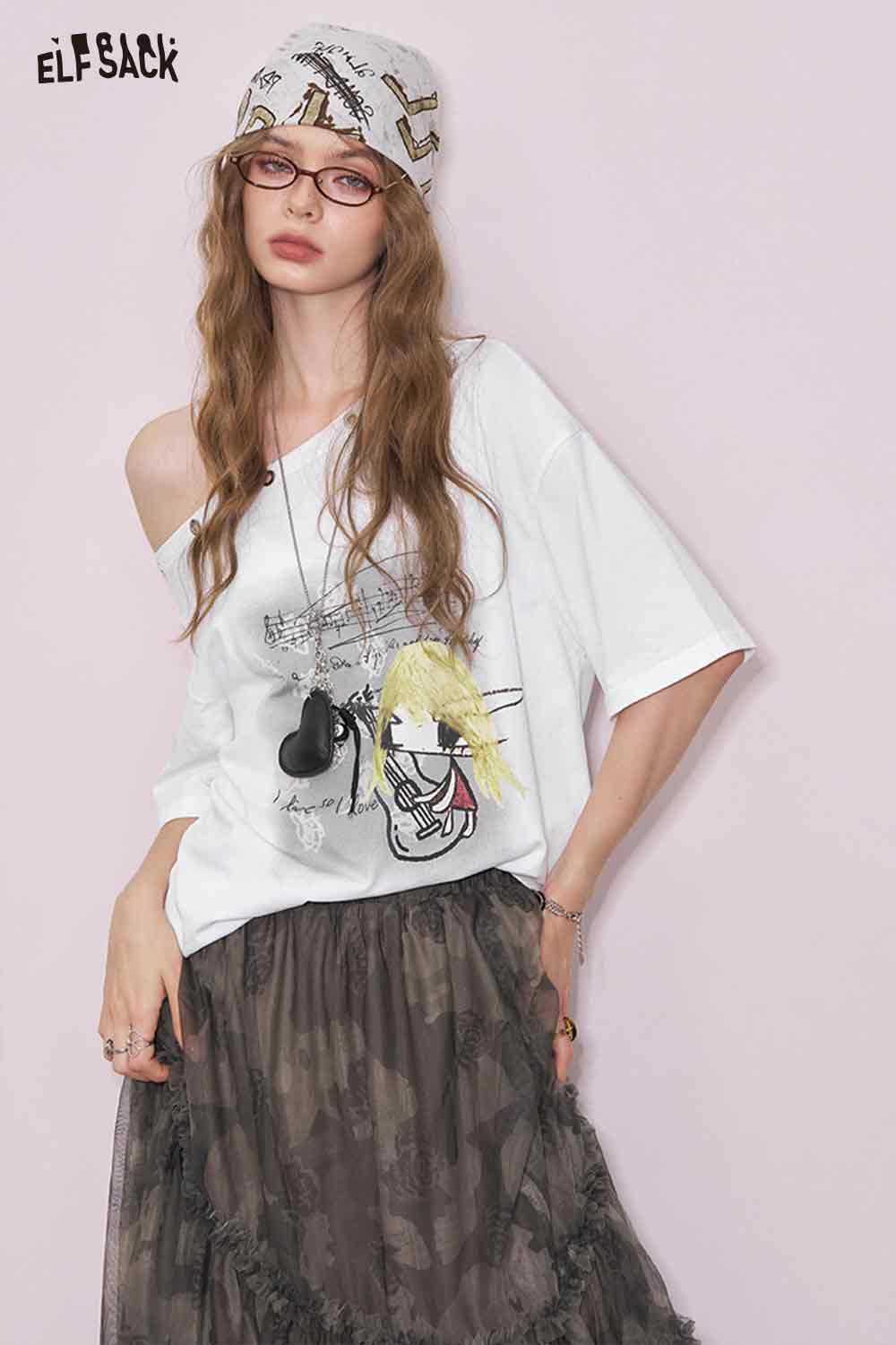 Cotton Loose Printed Off-Shoulder Short-Sleeved T-Shirt