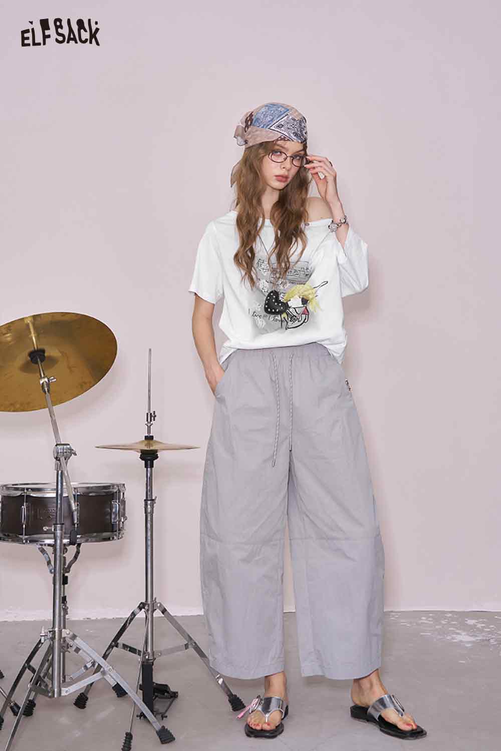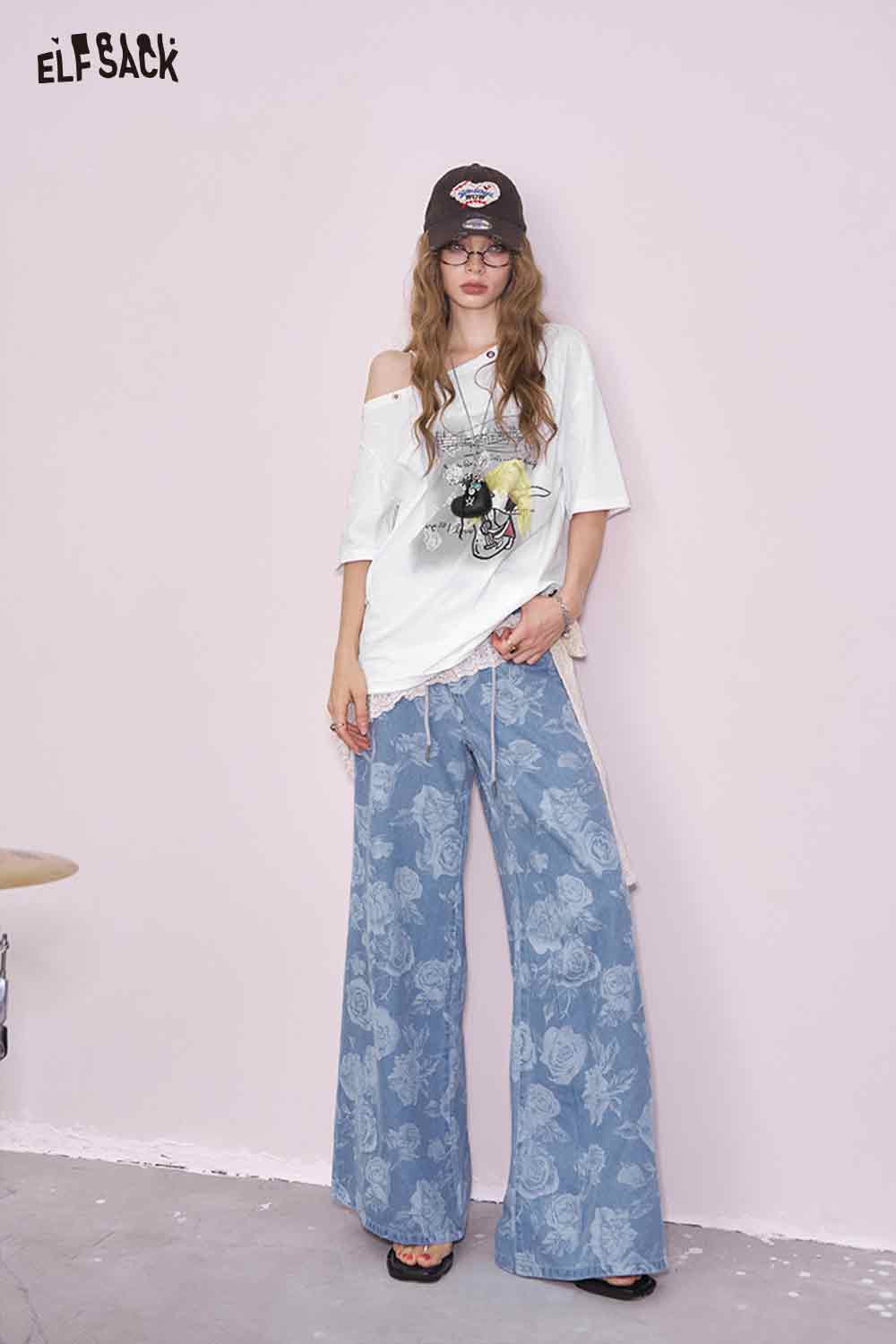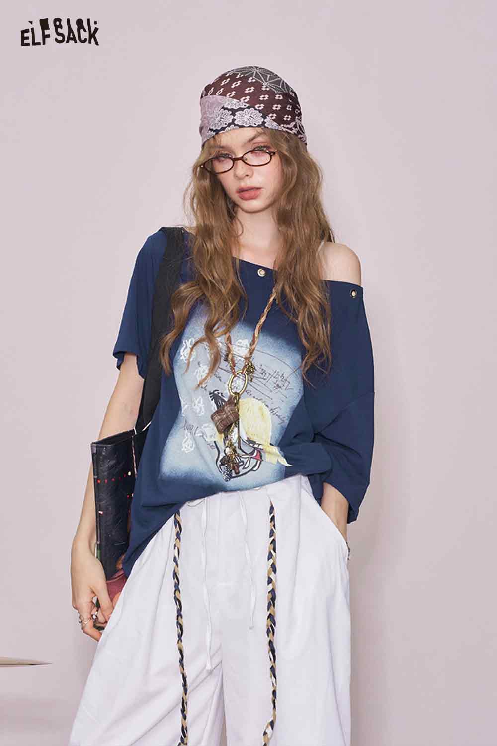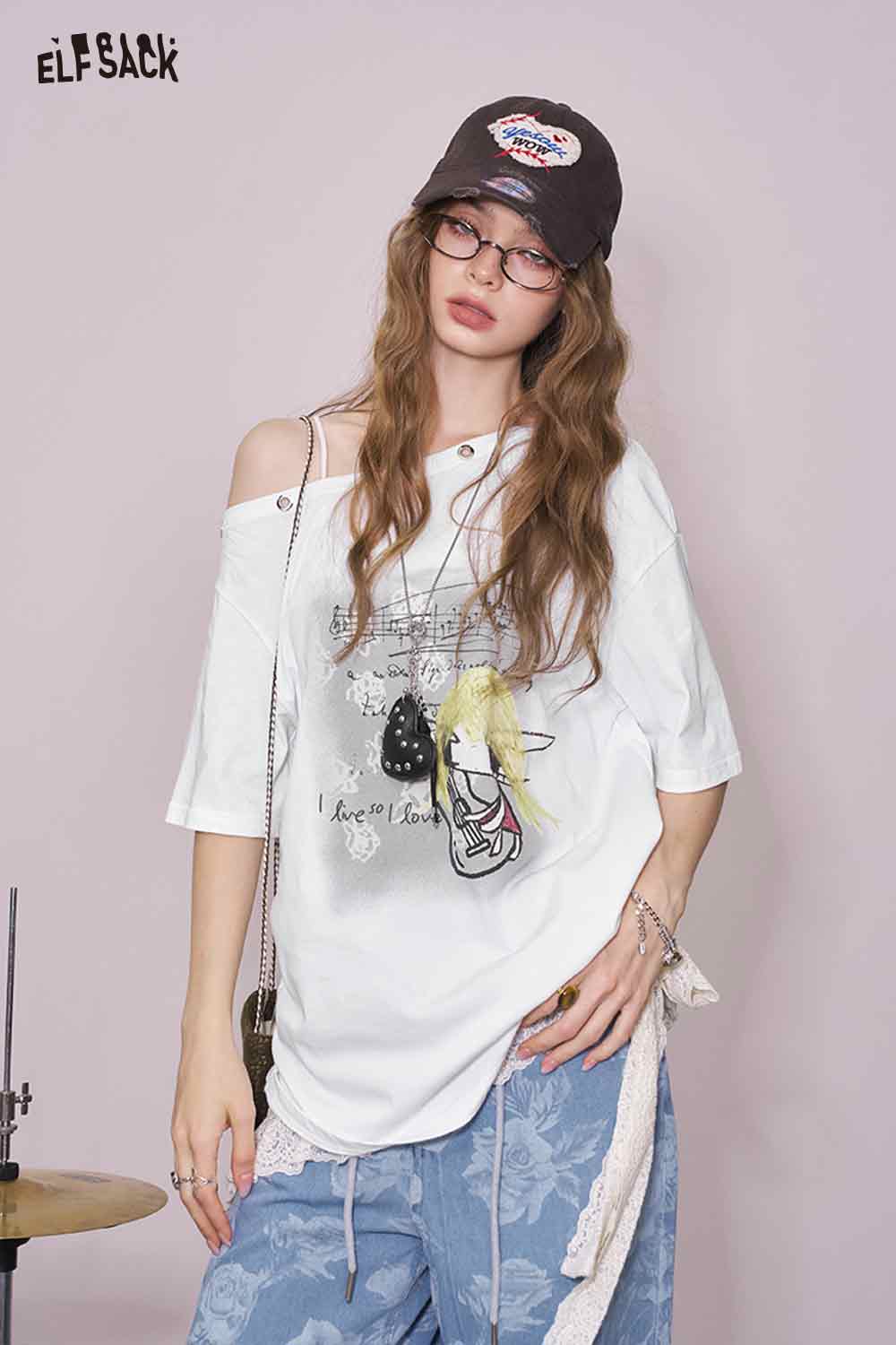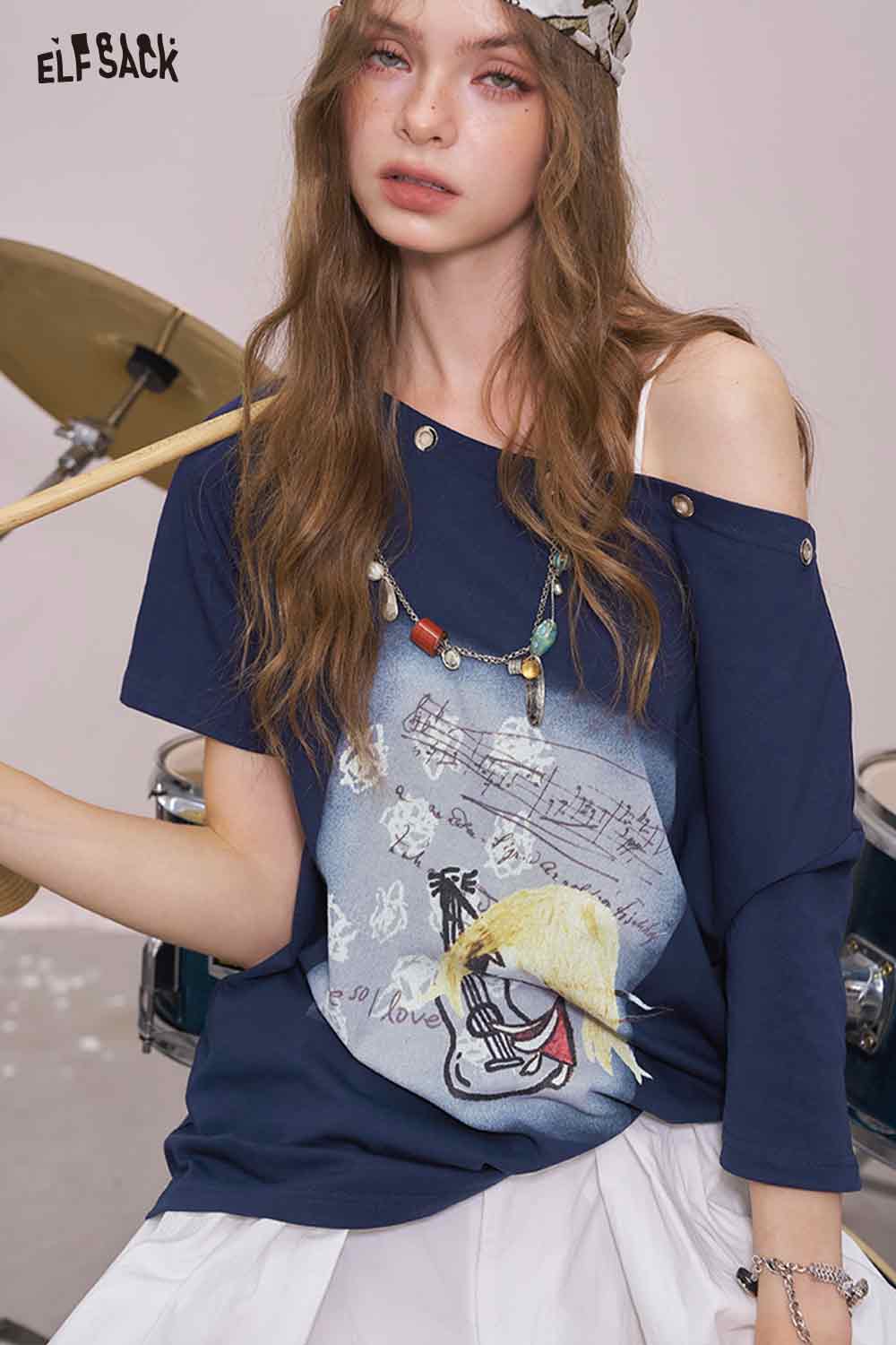 Cotton Loose Printed Off-Shoulder Short-Sleeved T-Shirt