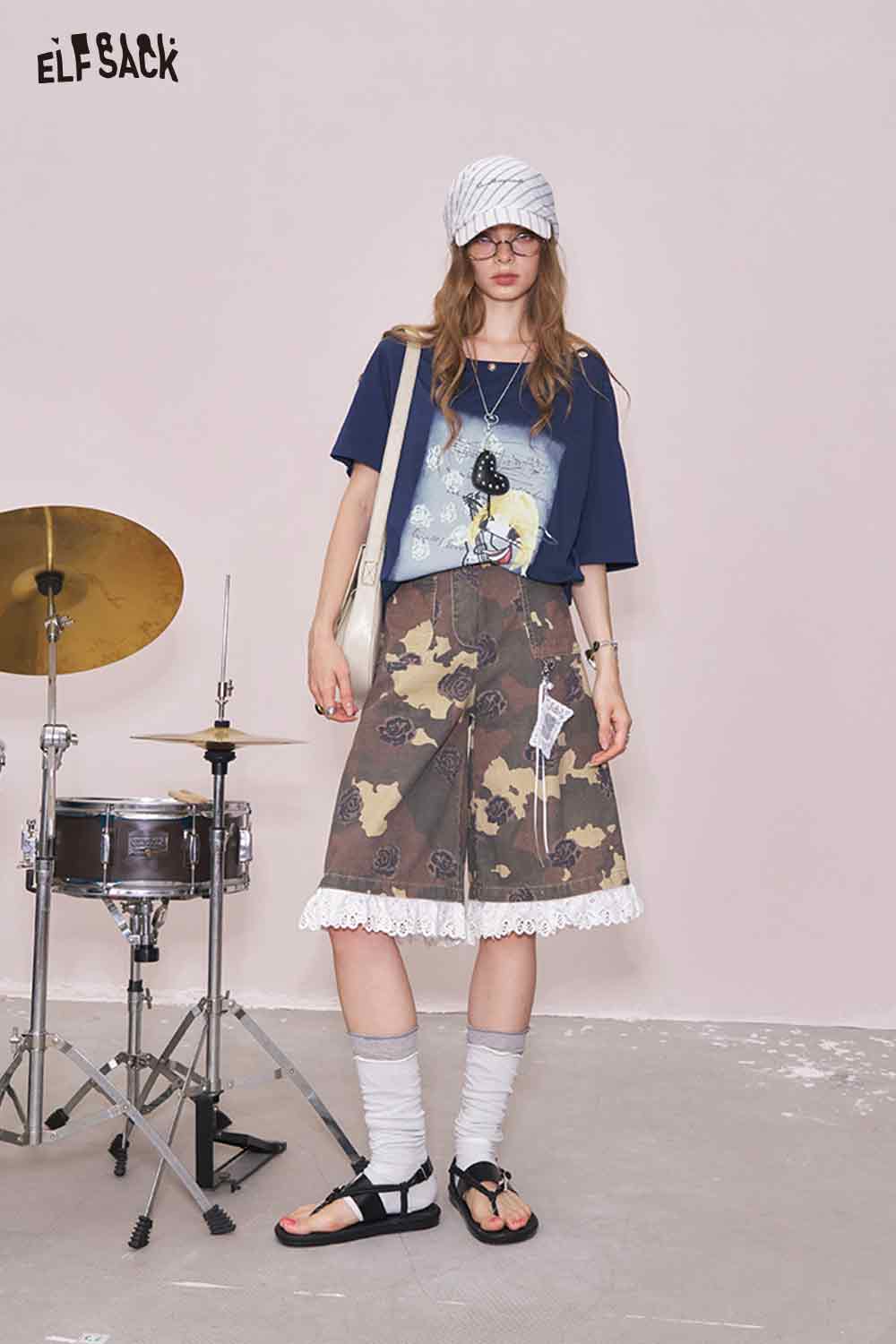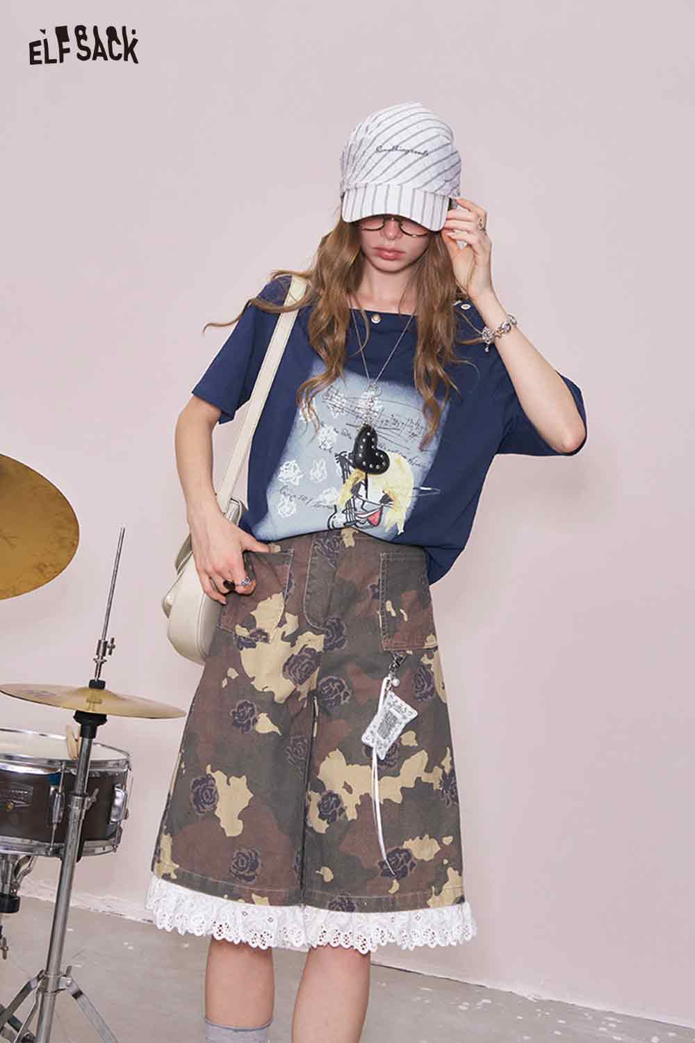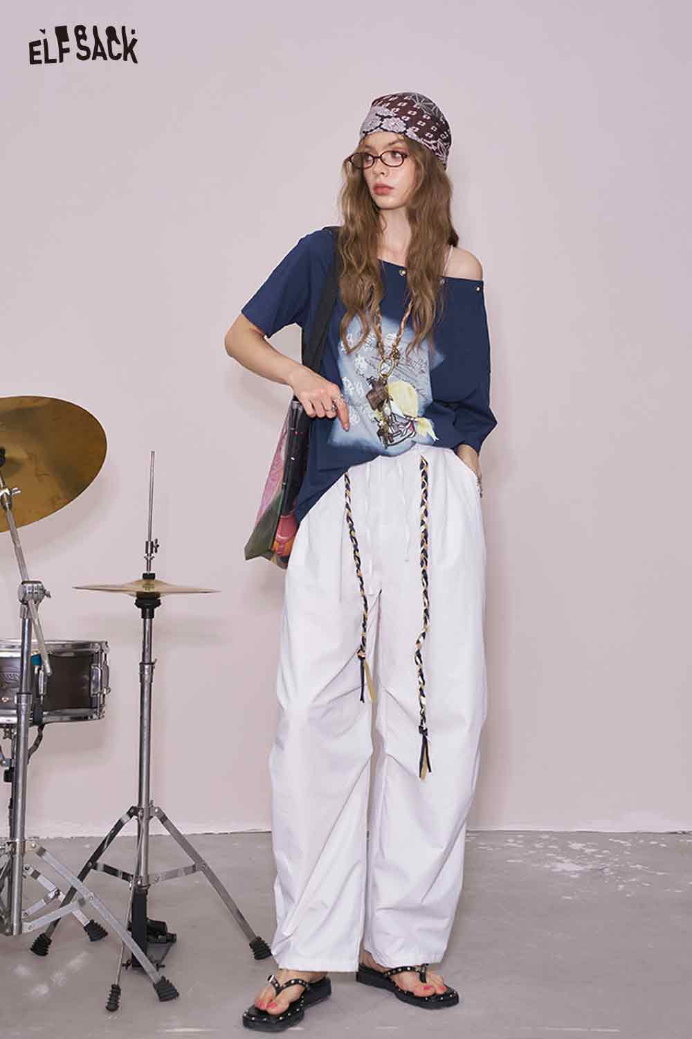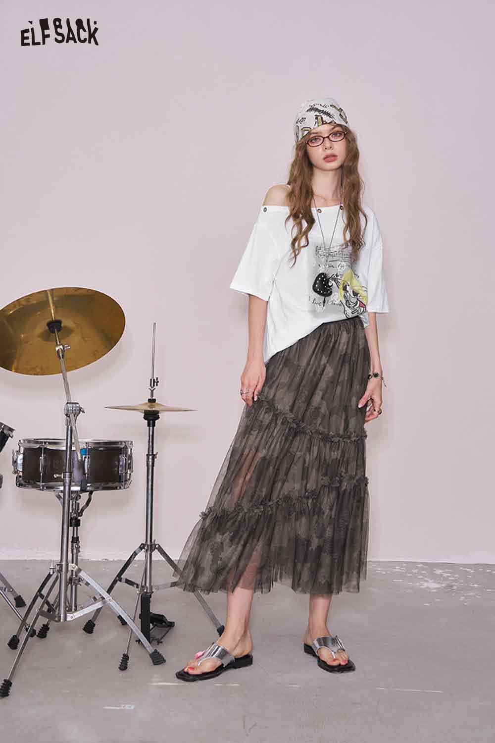 Cotton Loose Printed Off-Shoulder Short-Sleeved T-Shirt