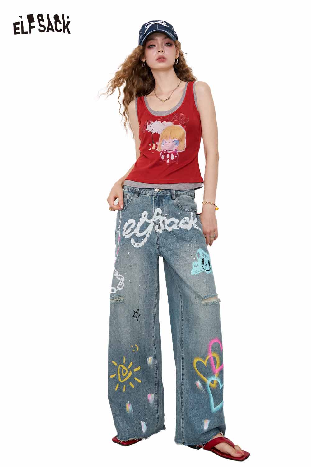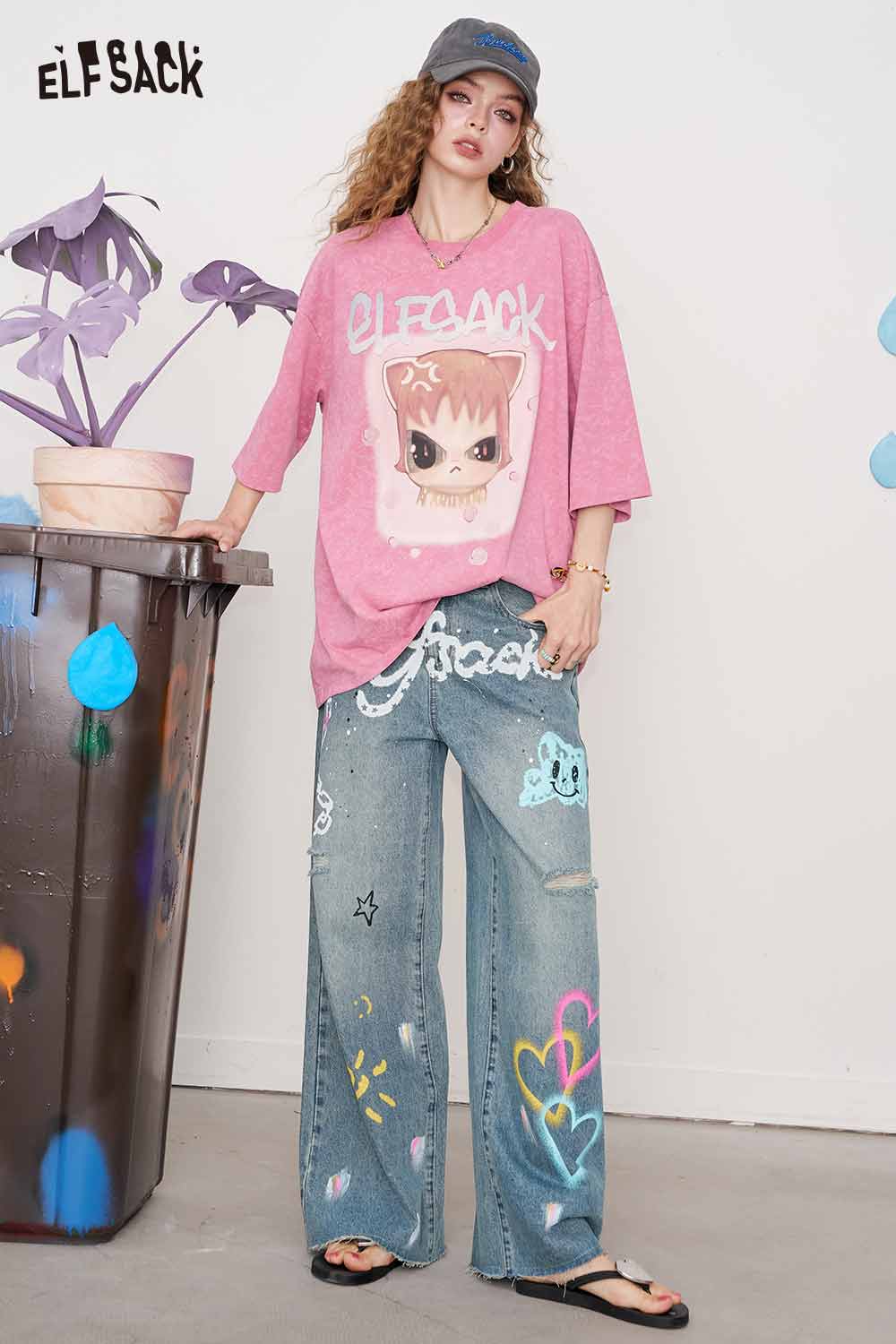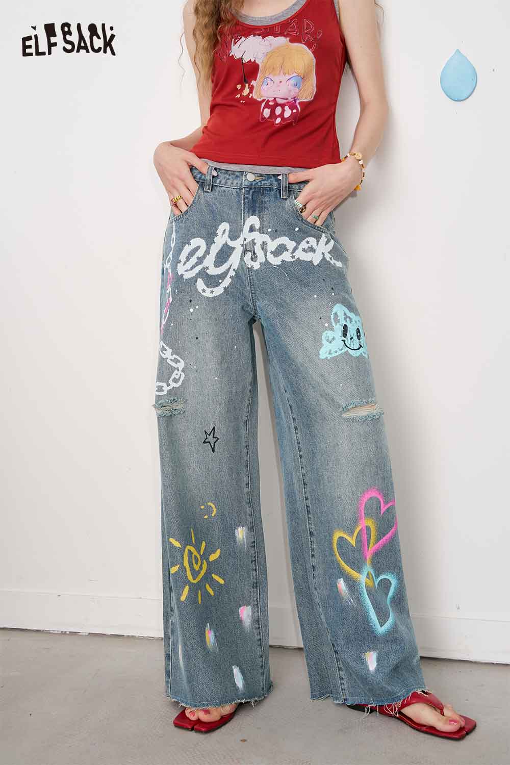 Cotton Y2K Graffiti Destroyed Wide Leg Jeans Streetwear Denim Pants