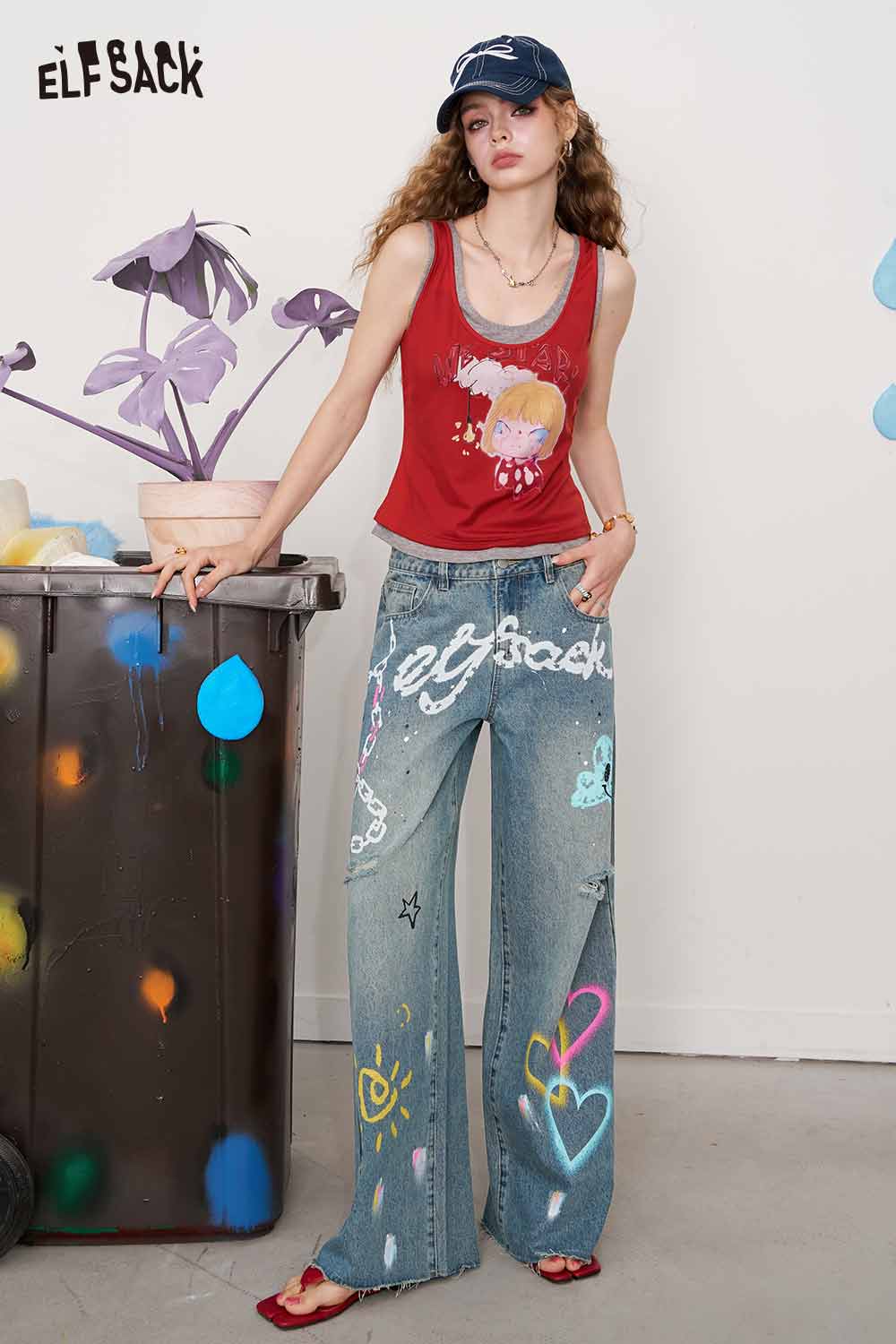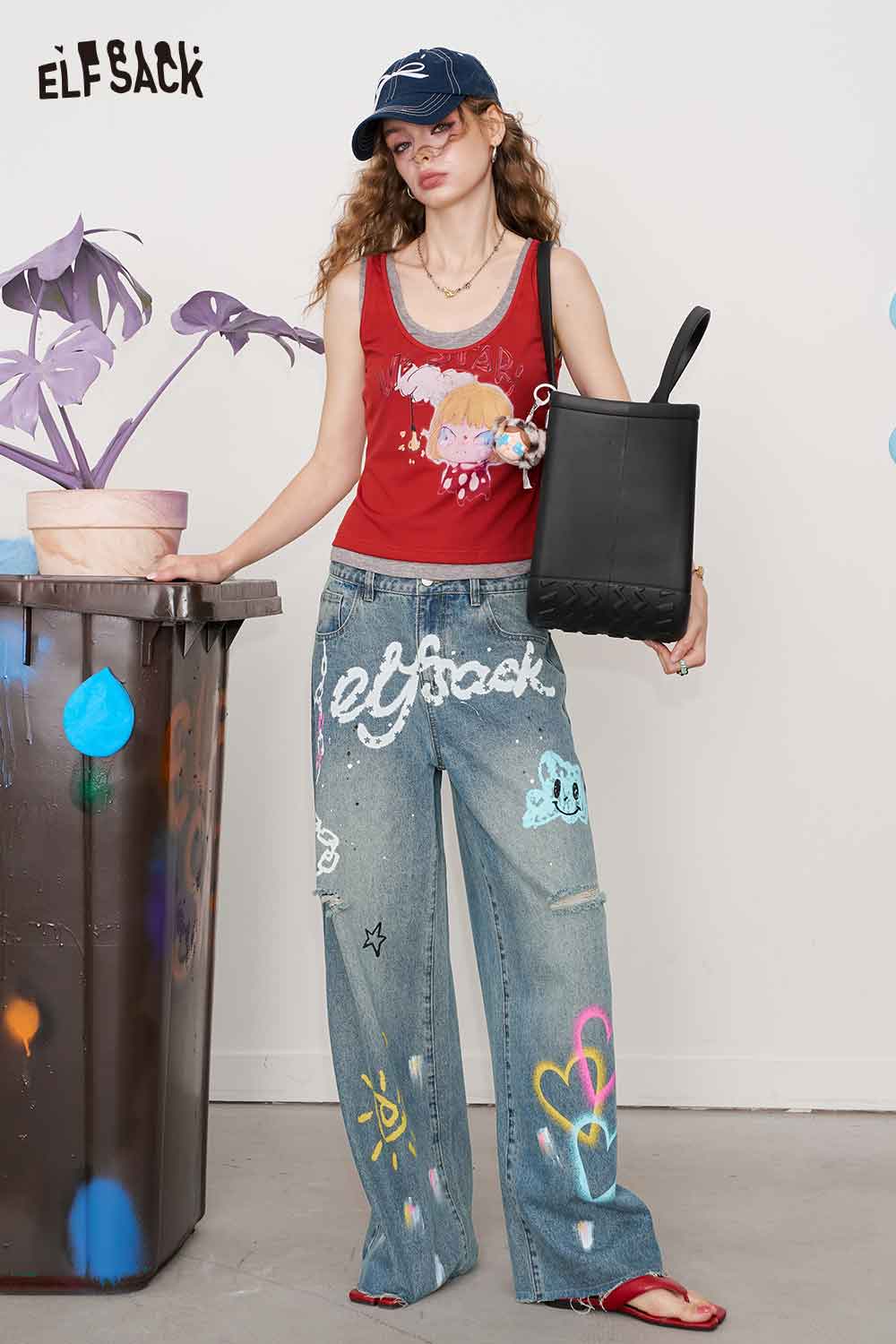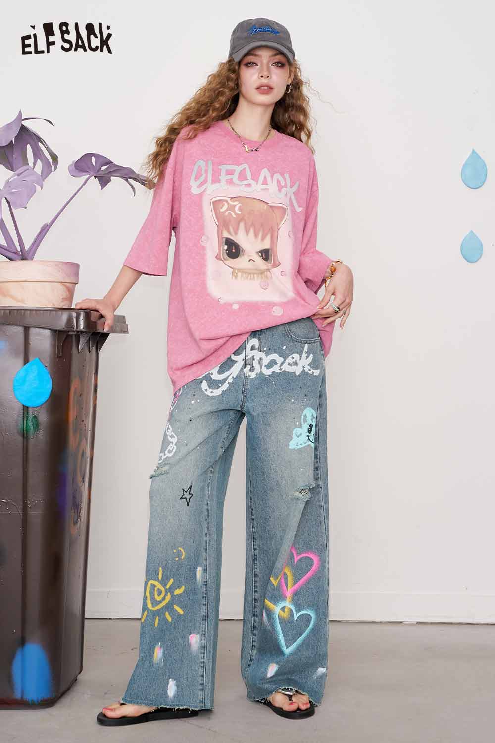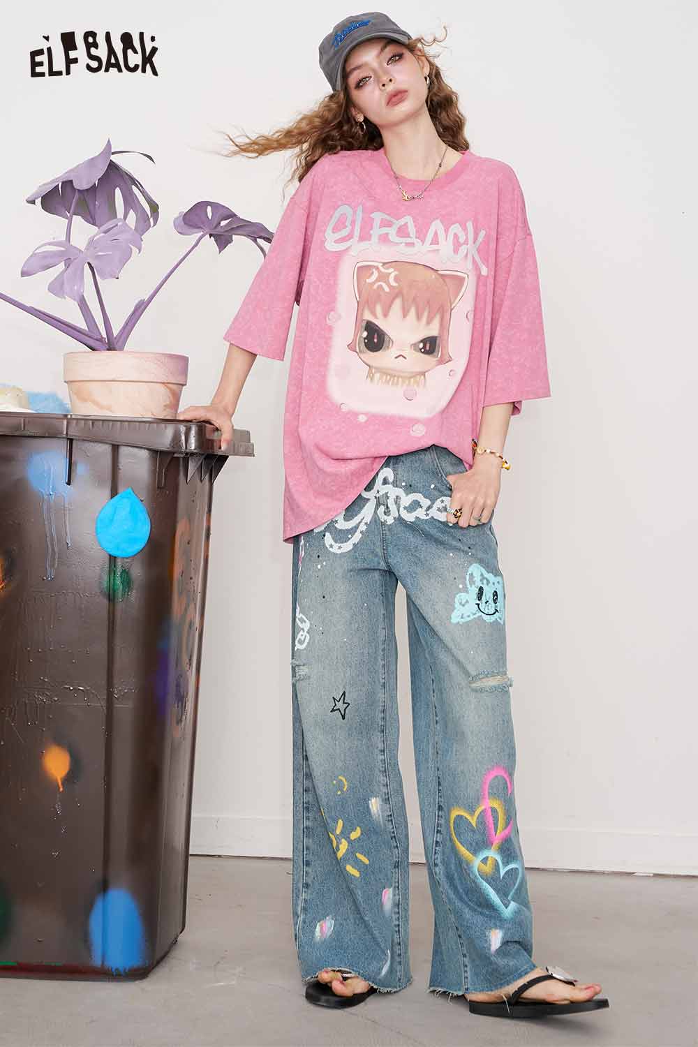 Cotton Y2K Graffiti Destroyed Wide Leg Jeans Streetwear Denim Pants