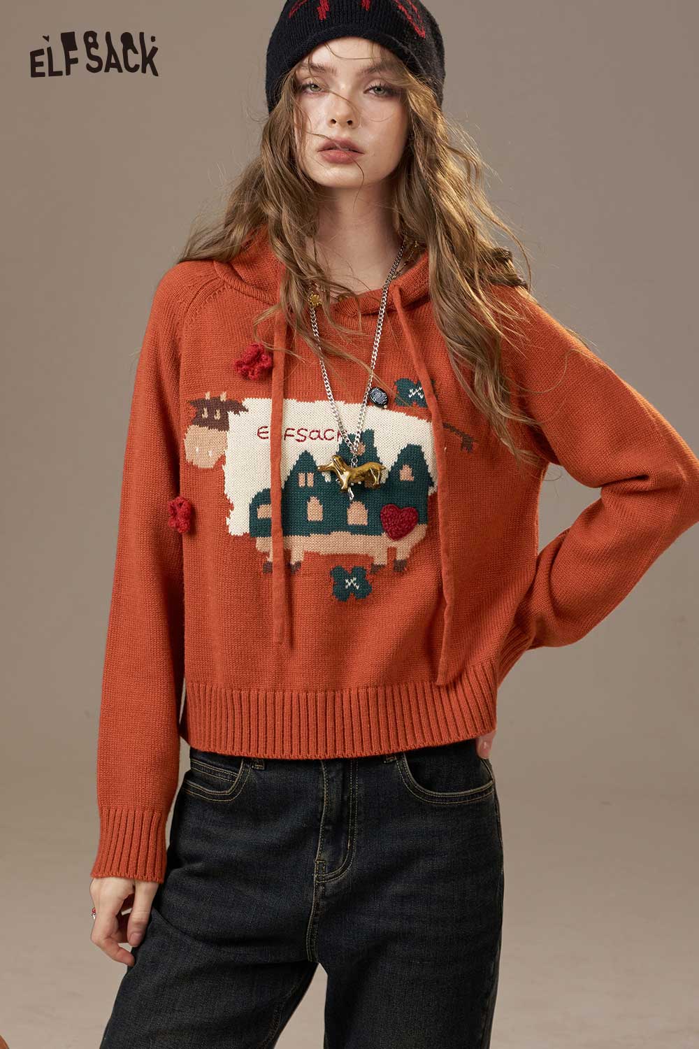 Soft Knit Cartoon Cow Print Design Hooded Sweater