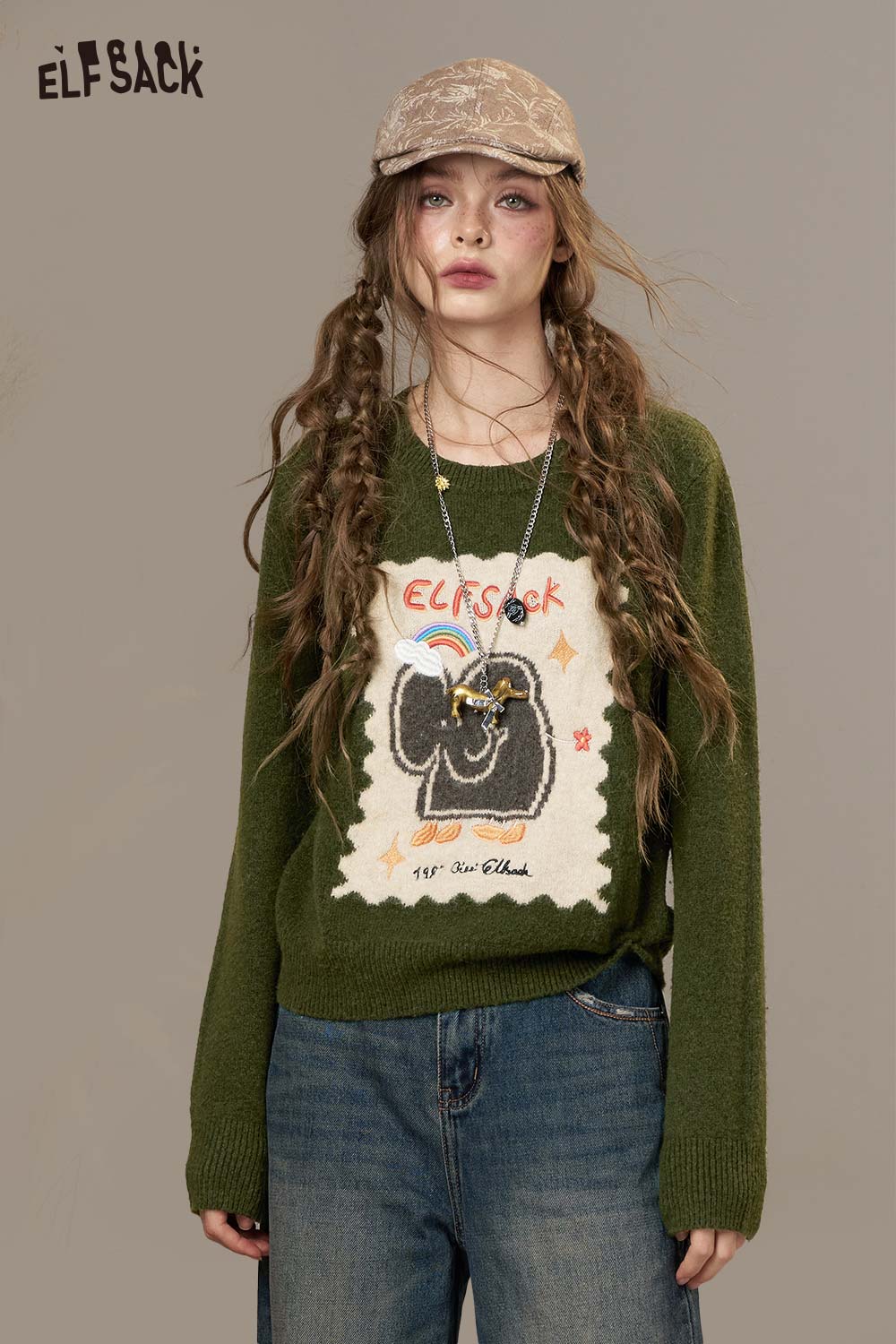 Soft Knit Round Neck Cartoon Embroidery Loose Fit Sweater