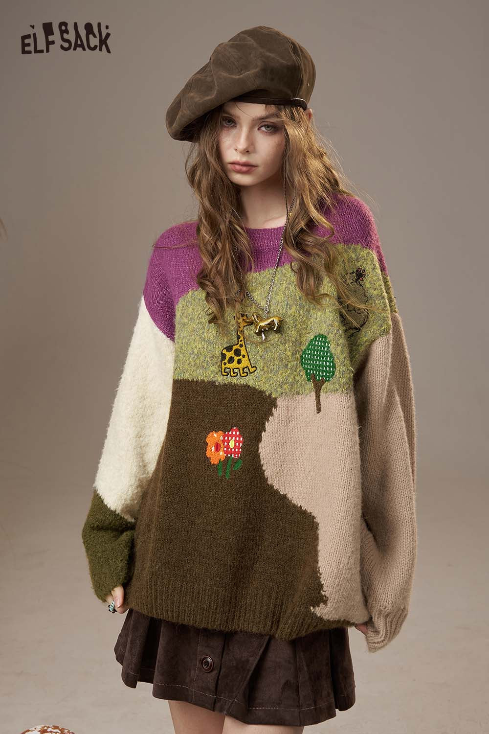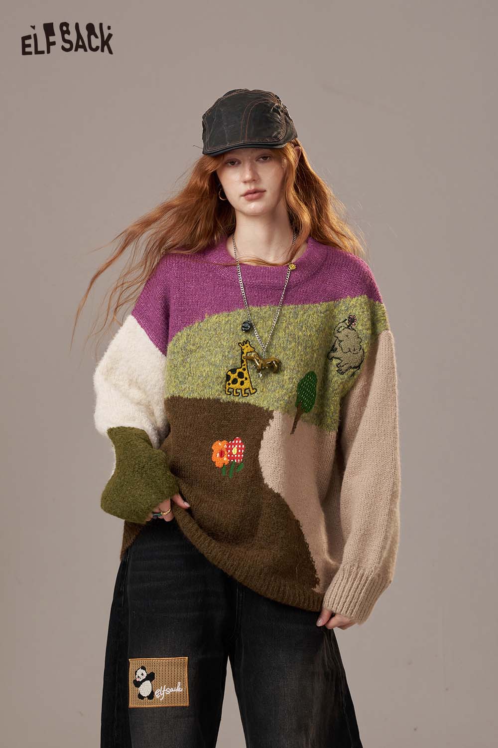Soft Knit Color Block Giraffe Embroidery Loose Fit Sweater