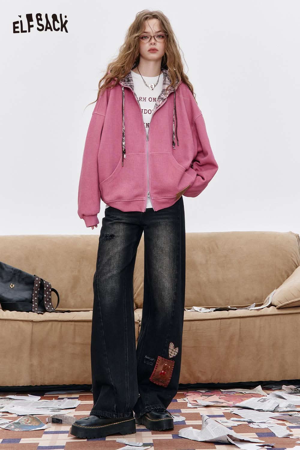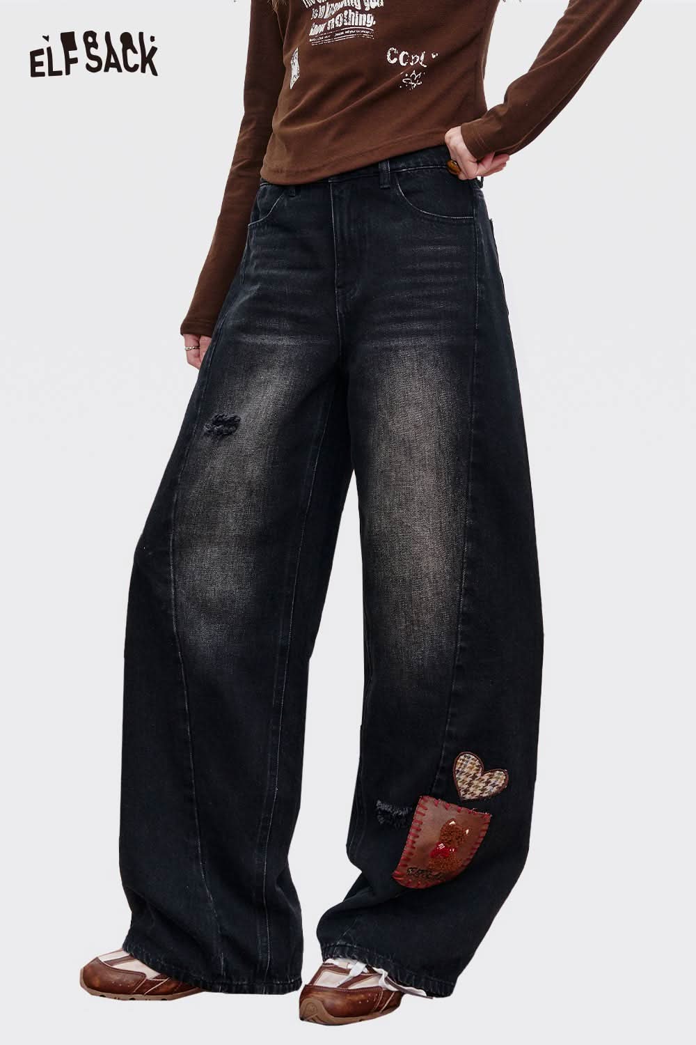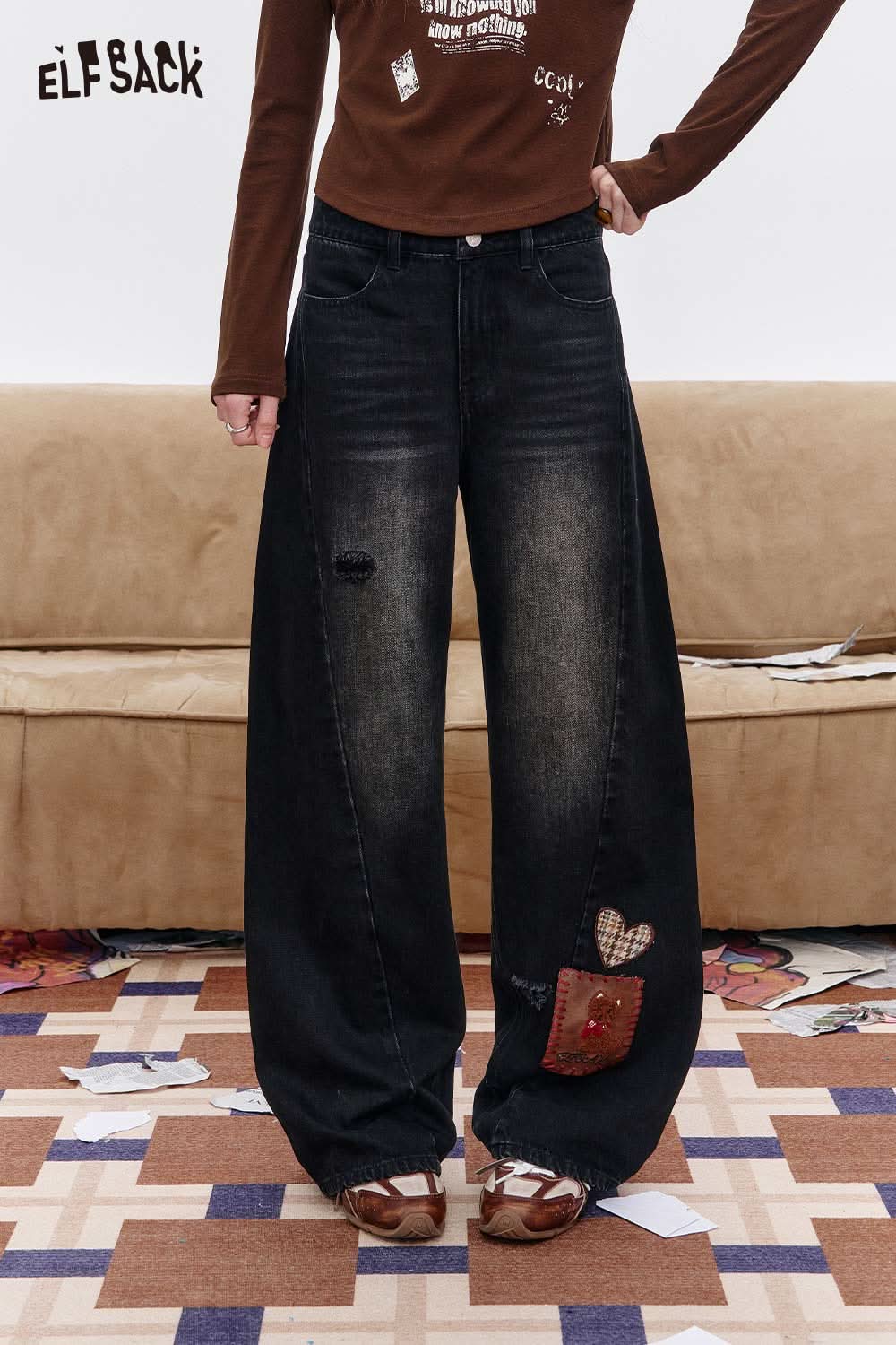 Soft Denim Relaxed Fit Watercolor Wash Heart Shaped Applique Detail Jeans