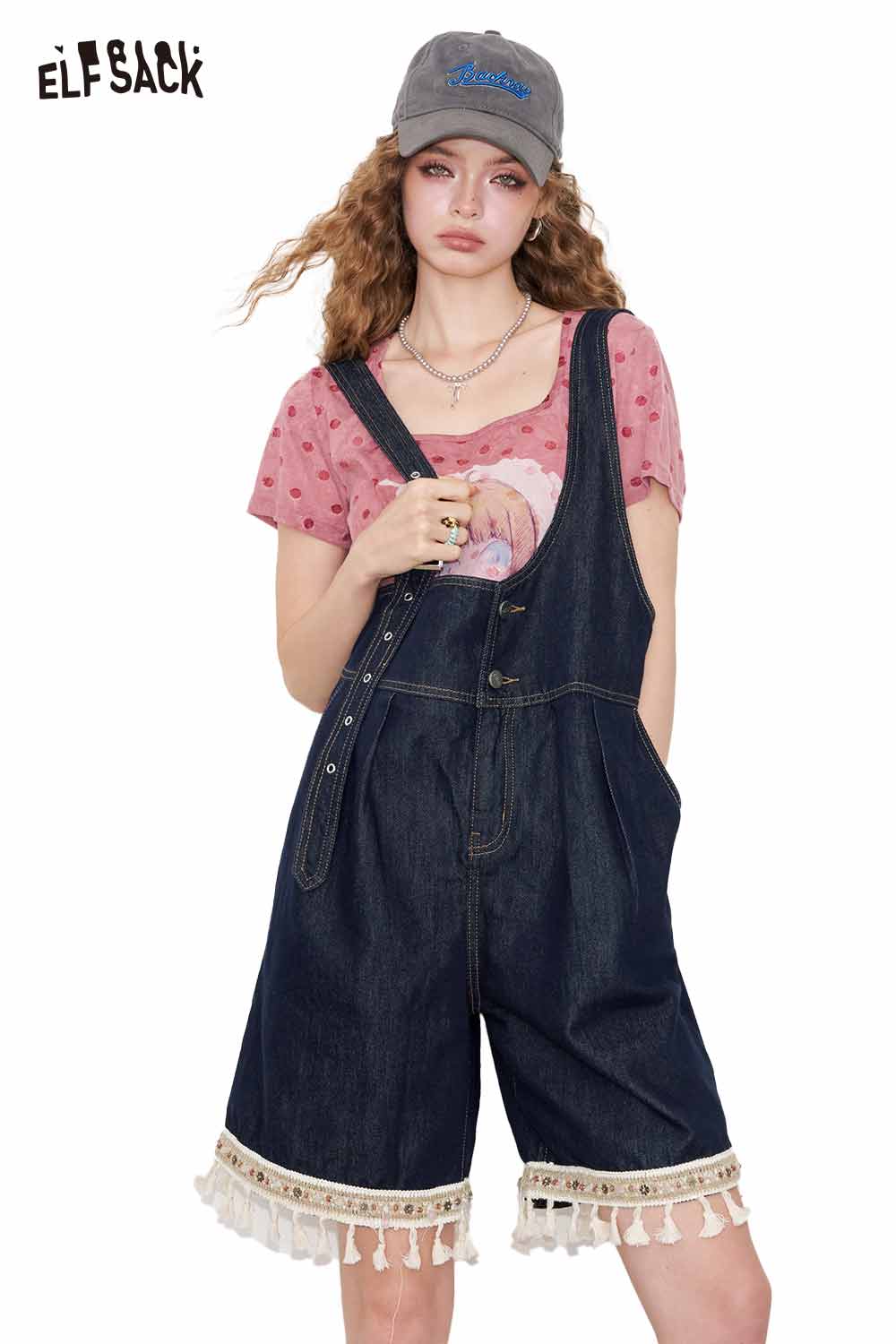 Cotton Boho Vintage Denim Overalls Shorts Adjustable Straps High Waist Floral Embroidery